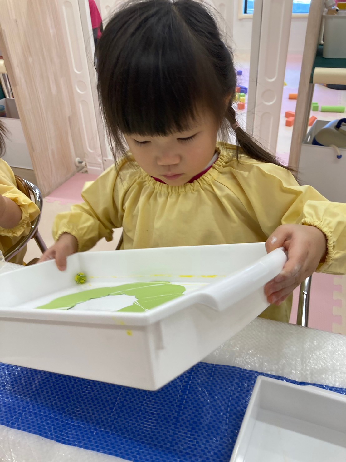ビー玉がコロコロ転がって白や黄色の絵の具が付く様子をワクワクしながら見ていた子どもたち!