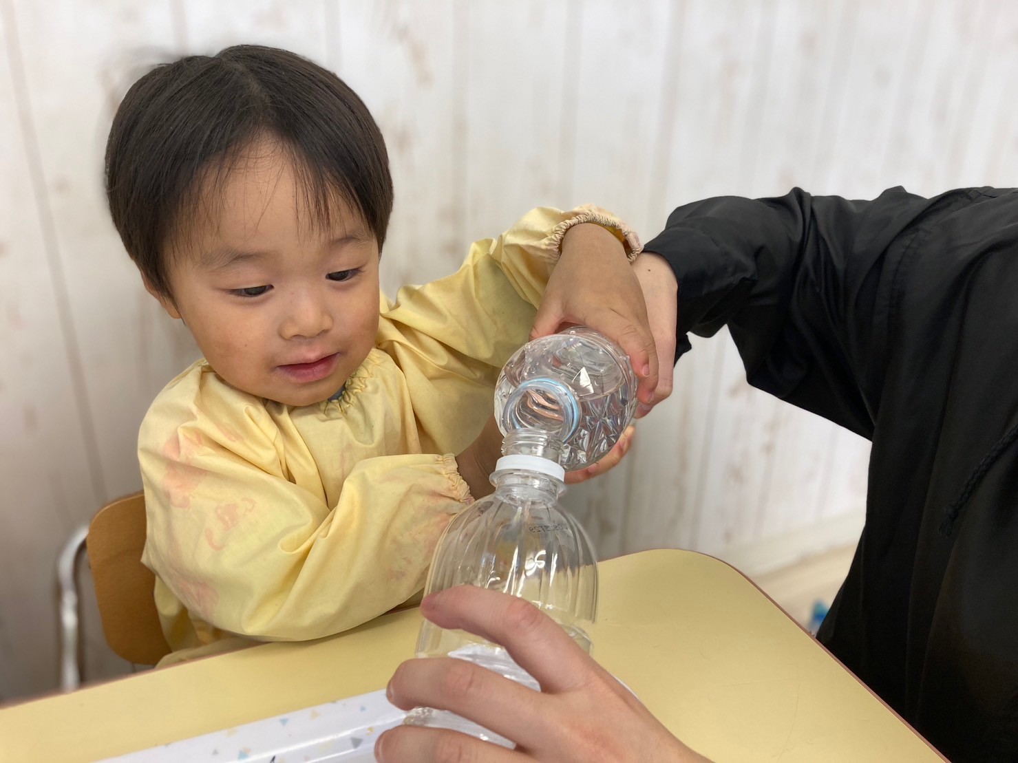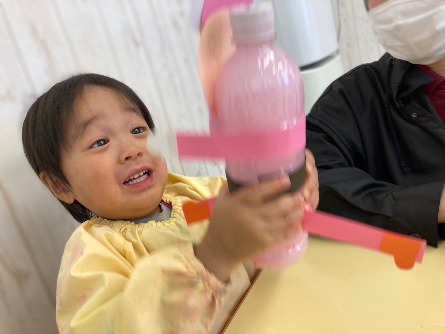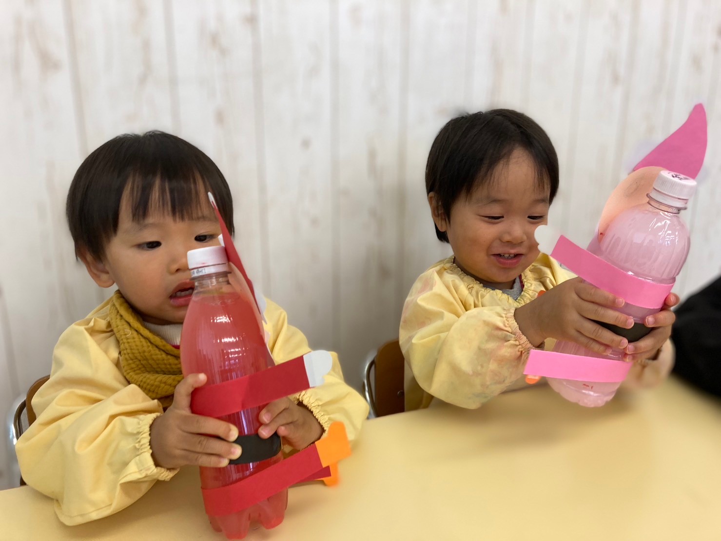 魔法の水を入れ、“ふりふり〜”とペットボトルを振るとサンタクロースの身体の色が変わり大喜びしていました!