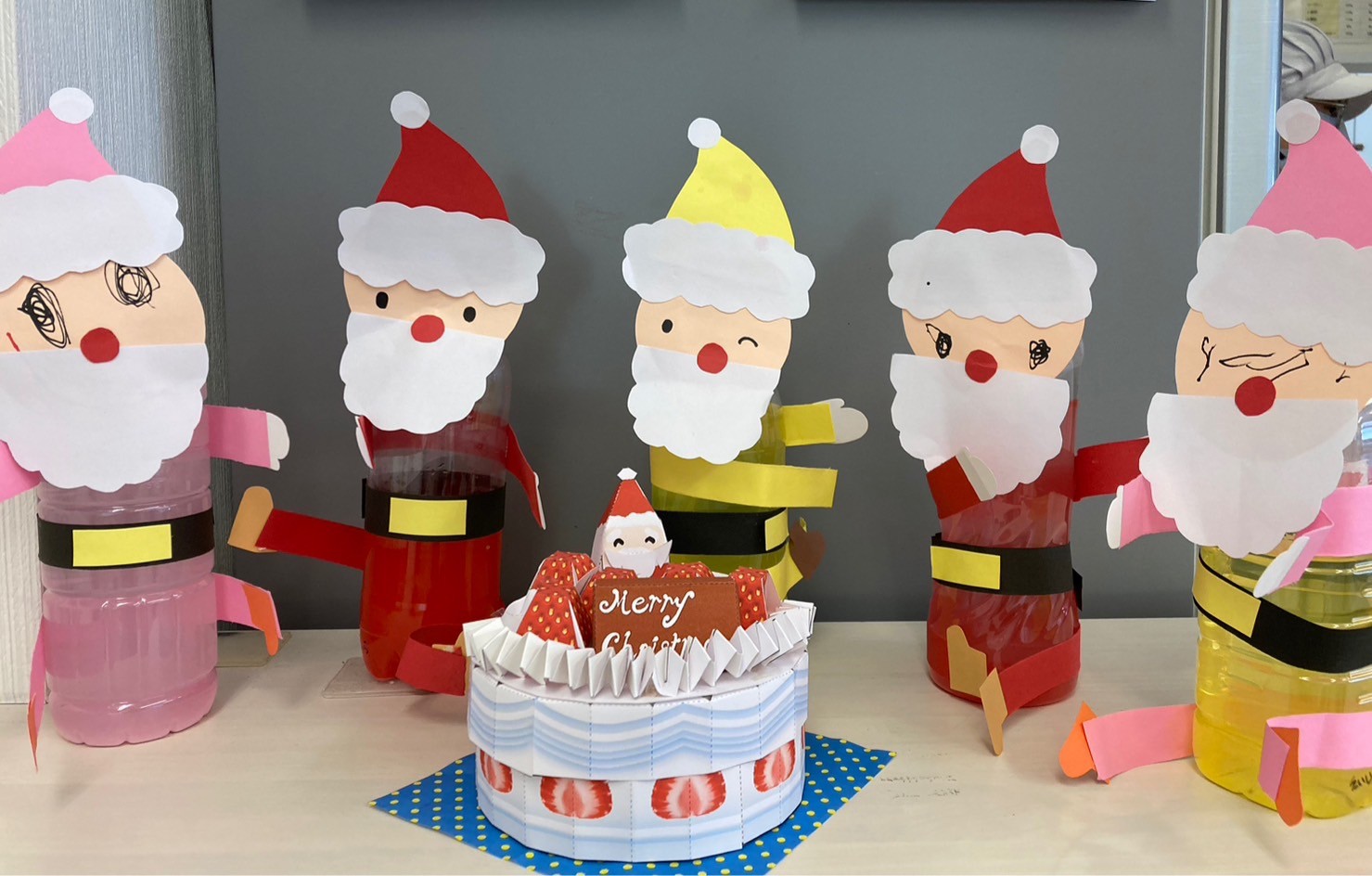 家庭から持ってきたペットボトルでサンタクロース作りに挑戦です。