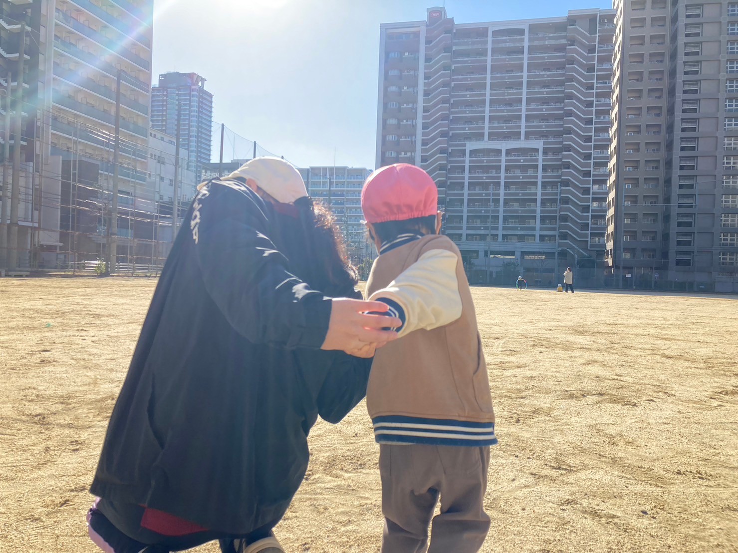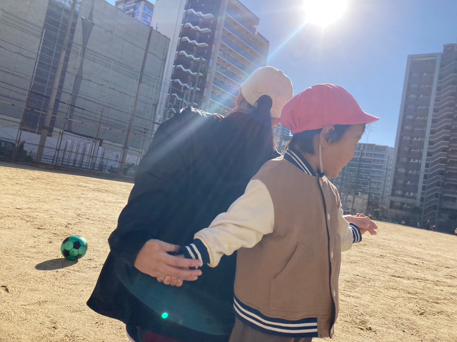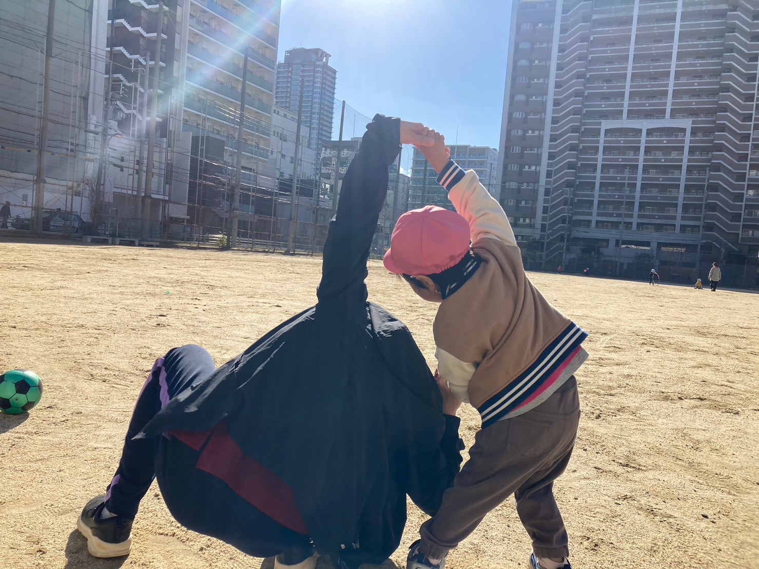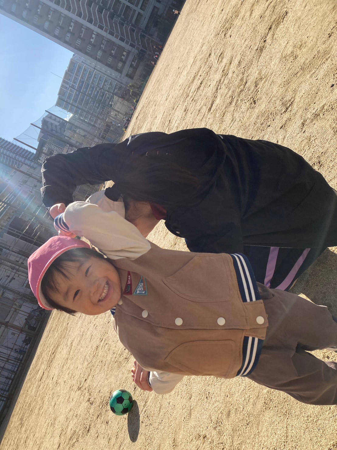 戸外遊びにも慣れ、お兄ちゃんお姉ちゃん達の姿を見て、ボールを蹴るようになった0歳児さん。