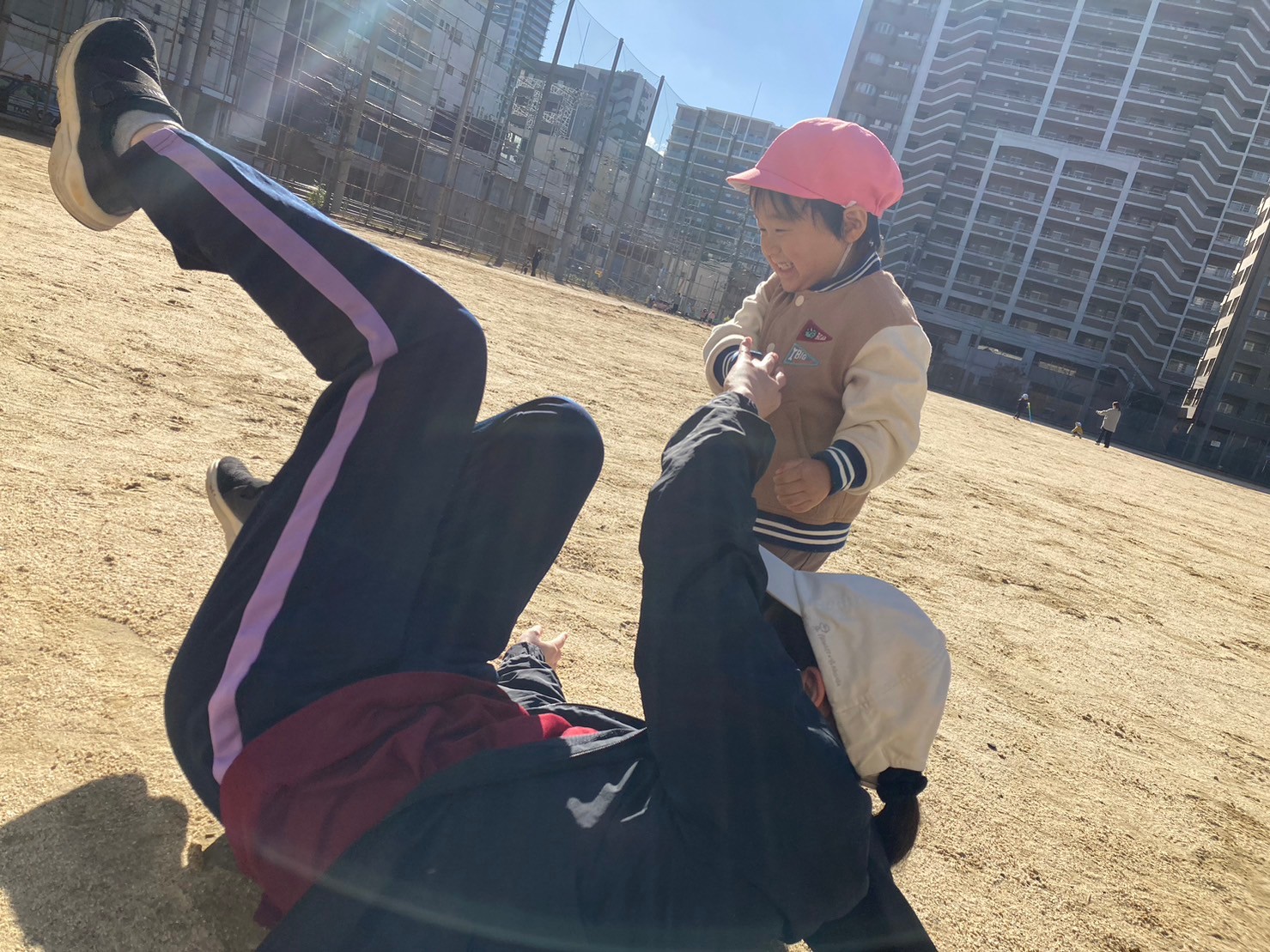 「そ〜こがぬけたら、かえりましょ♪」と勢いよく身体を返す子ども達には、保育者も手足がついていけず‥。