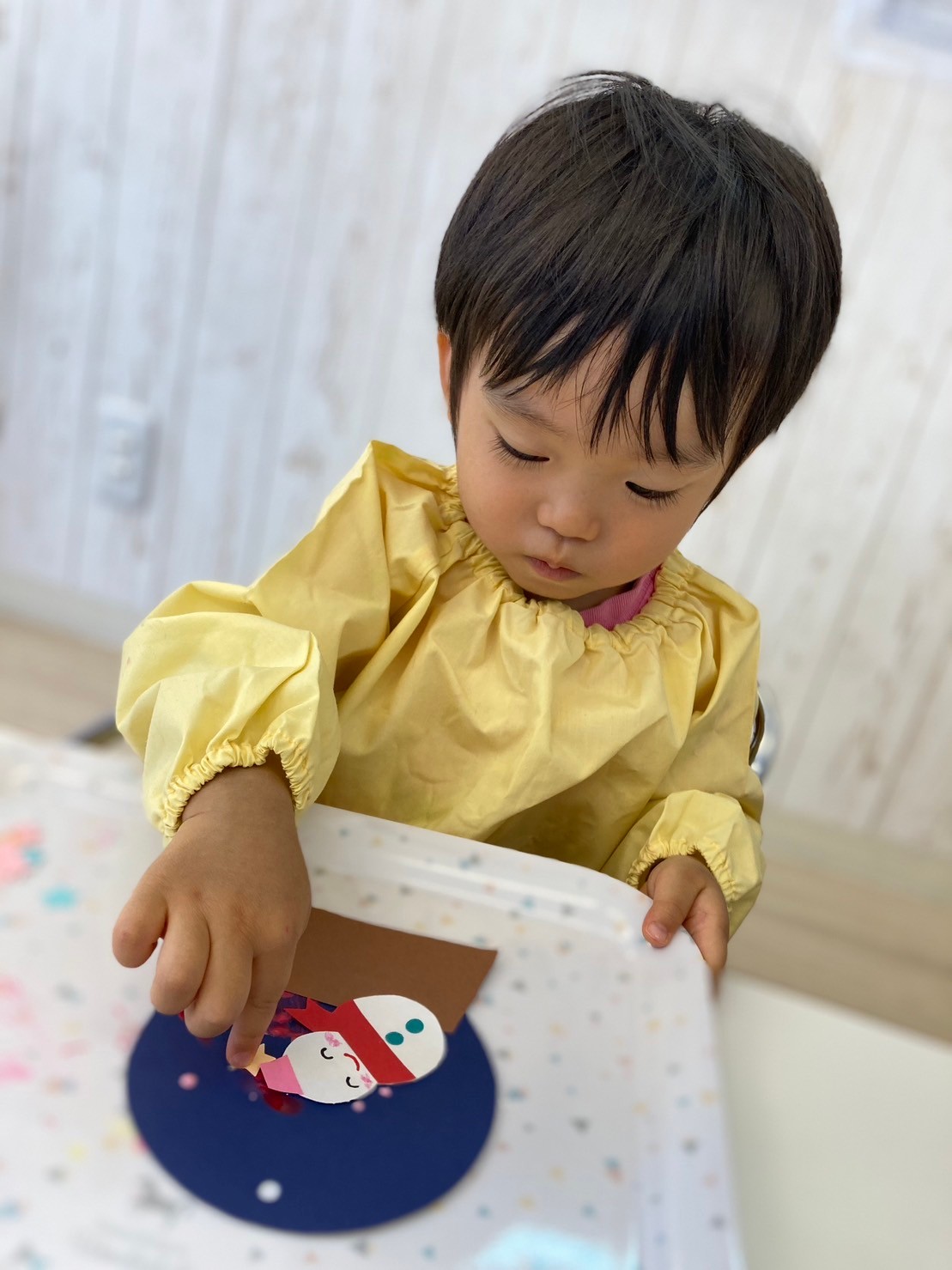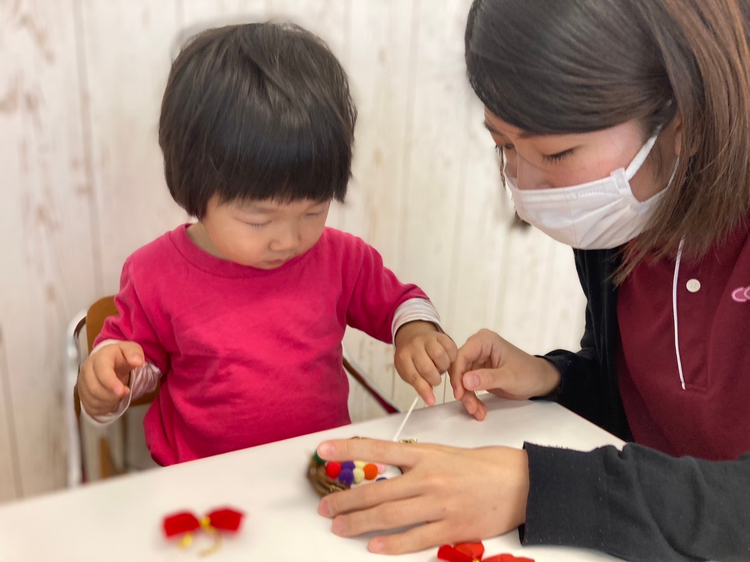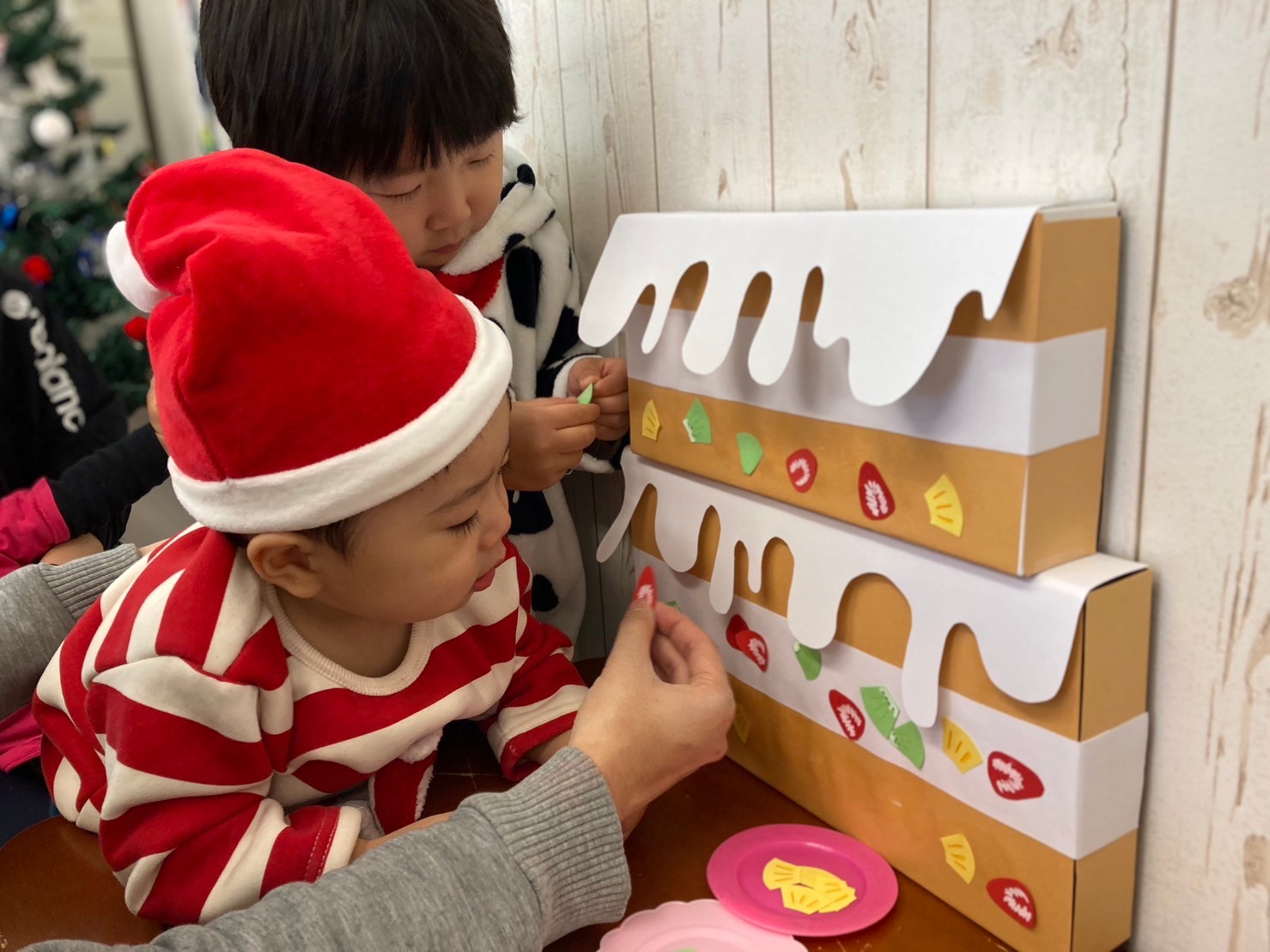 「おかあさんが、ぴんくいろすきだから、ぴんくいろのさんたにしたいな〜」「さんたさんの、しーとべると!(ベルト)かっこいいね〜」と、嬉しそうに話しながら作っていましたよ。