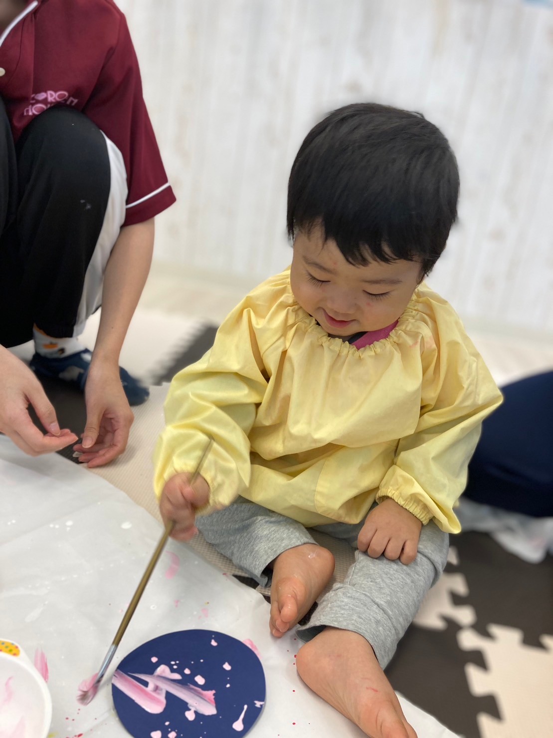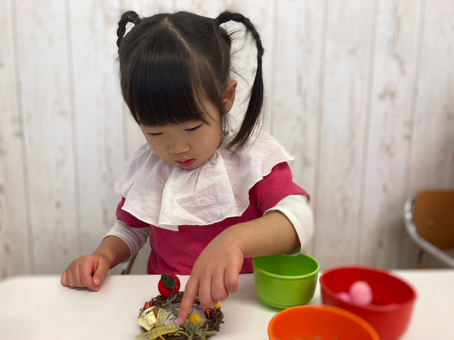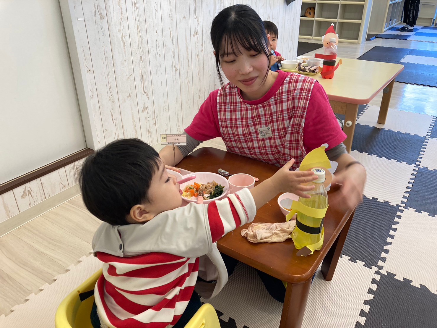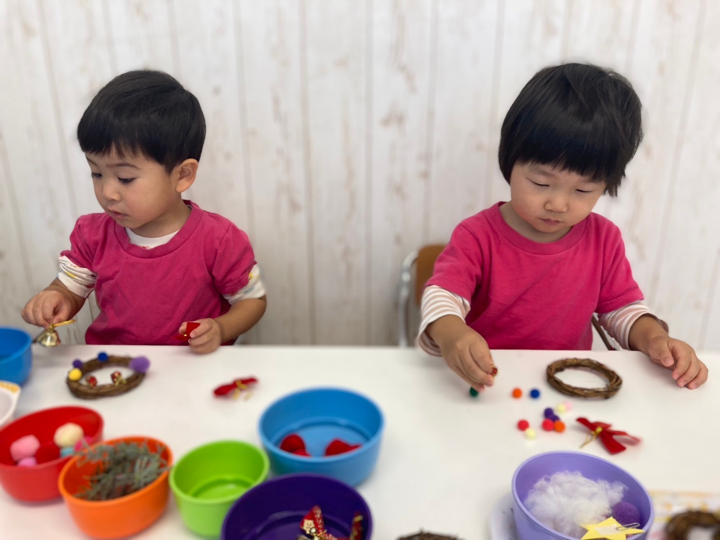 「おかあさんが、ぴんくいろすきだから、ぴんくいろのさんたにしたいな〜」「さんたさんの、しーとべると!(ベルト)かっこいいね〜」と、嬉しそうに話しながら作っていましたよ。