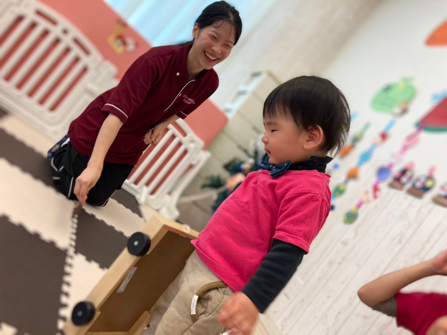 「せんせ〜!なべなべしよ〜」と遊び歌を通してスキンシップを楽しむ1.2歳児さん。