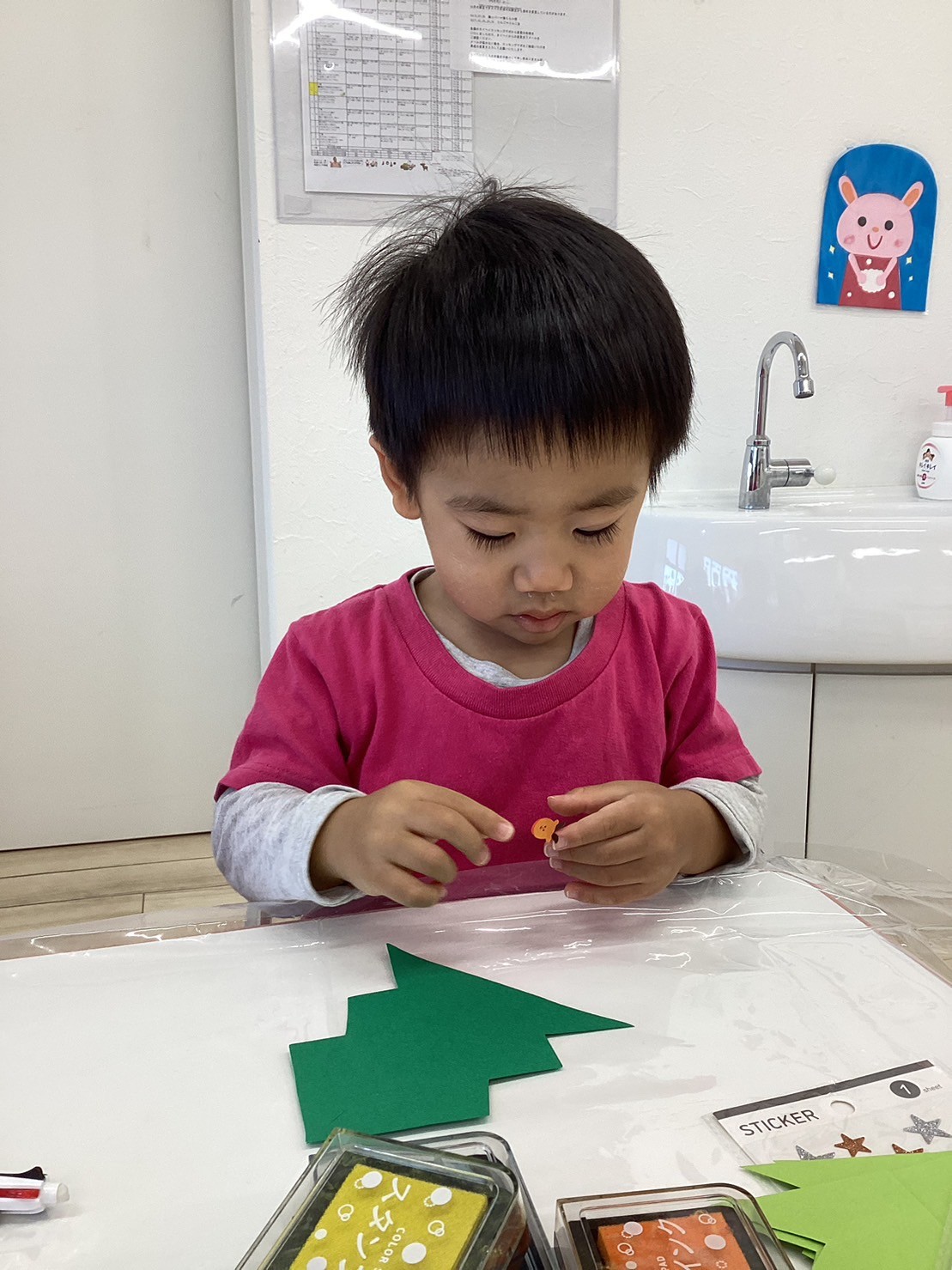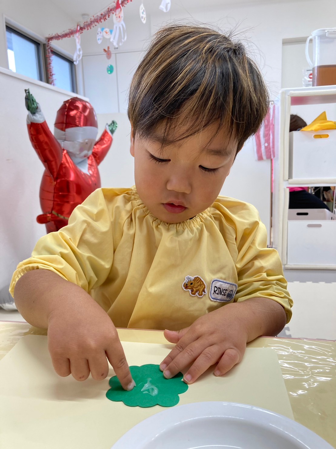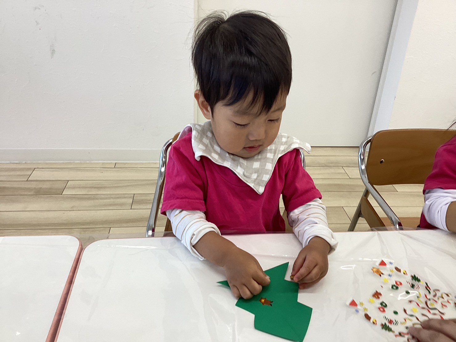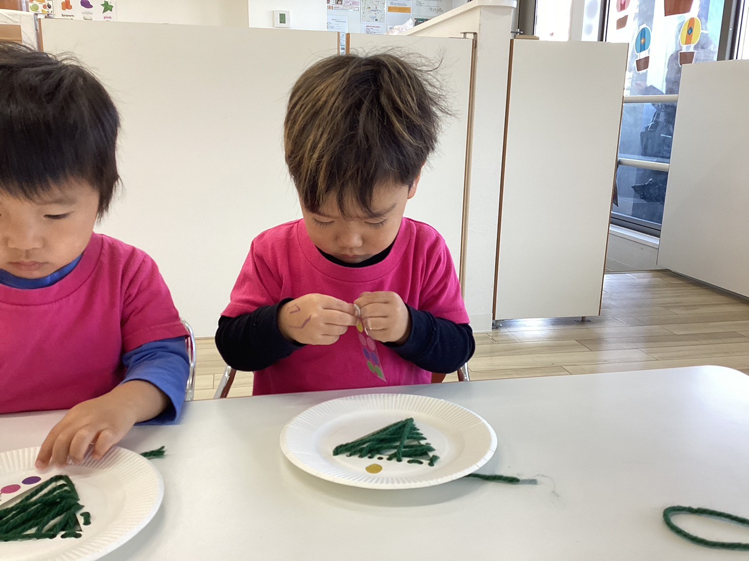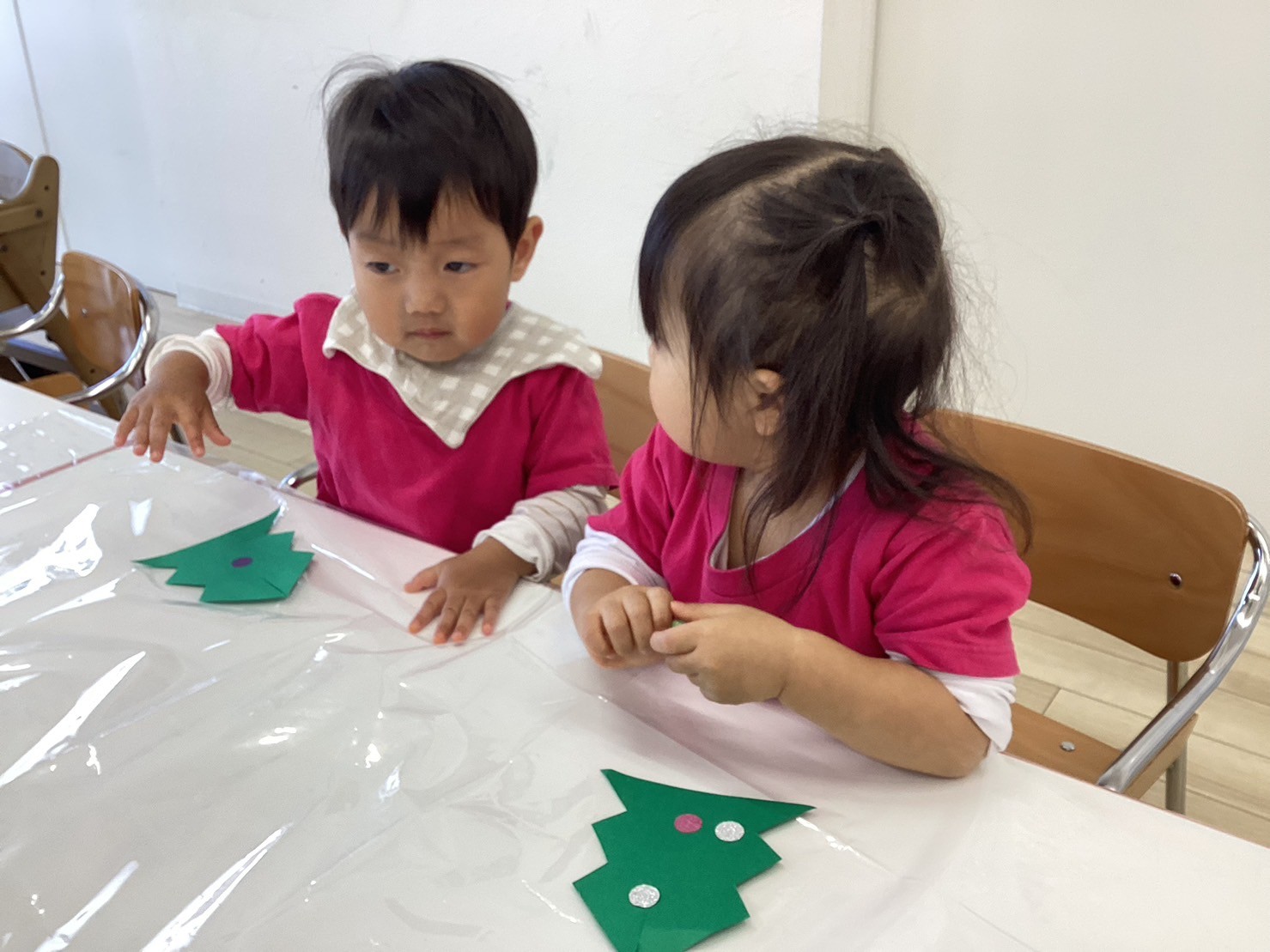 0歳児さんはスノードーム、1歳児さんはツリー、2歳児さんはツリー柄のオーナメントを作りました。