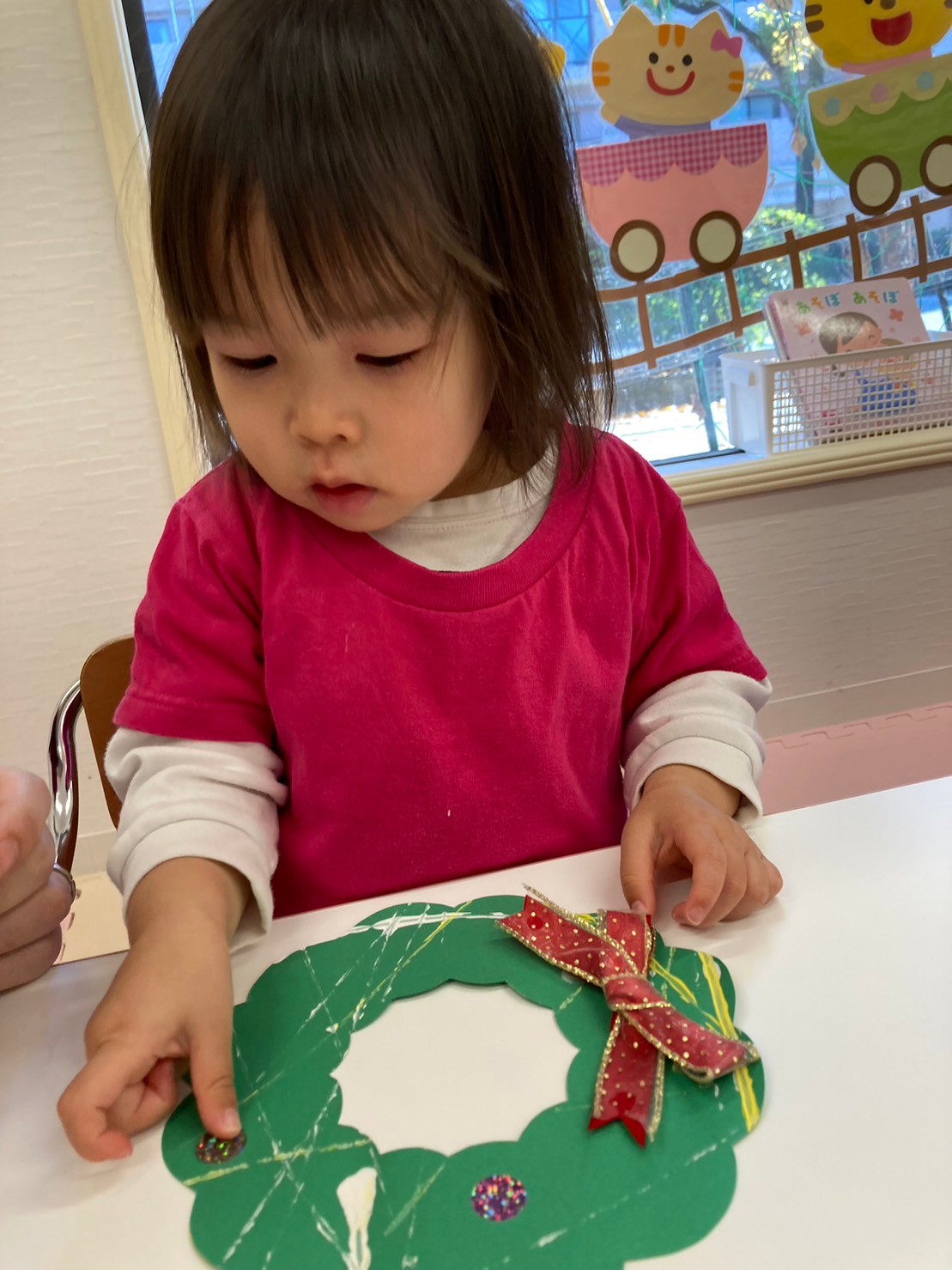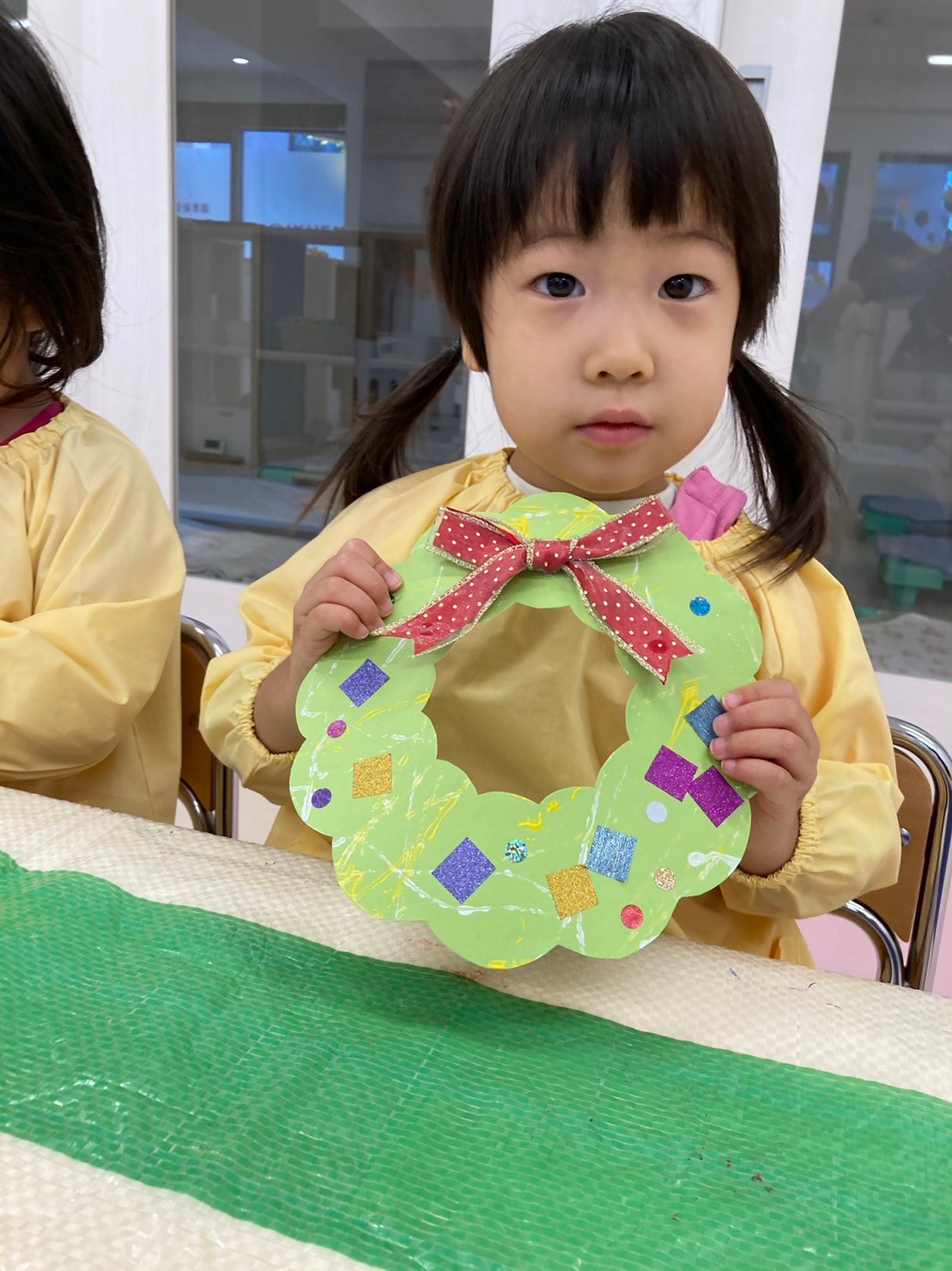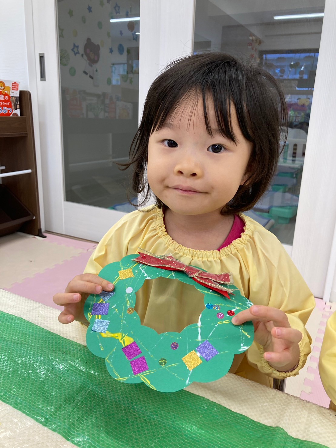 模様をつけた後は好きなシールやマスキングテープを貼り、可愛らしいリースが完成しました☆