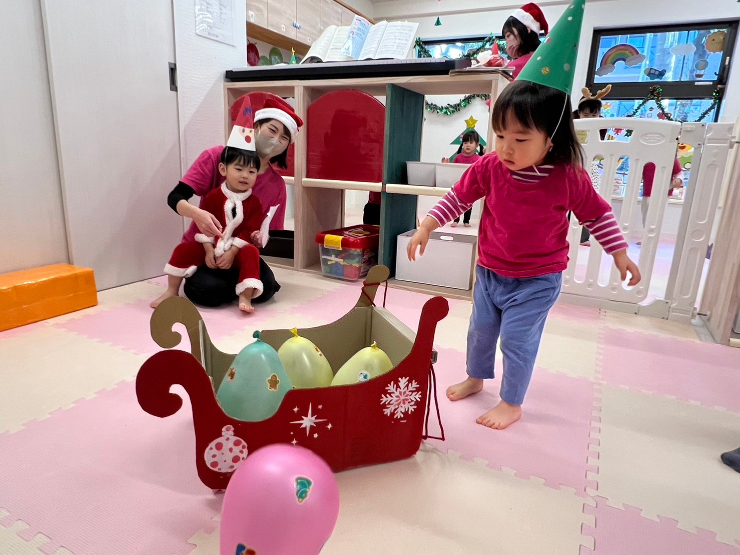 その後はサンタさんになりきってソリを引くゲームをしたり、プレゼント回しを楽しみました。