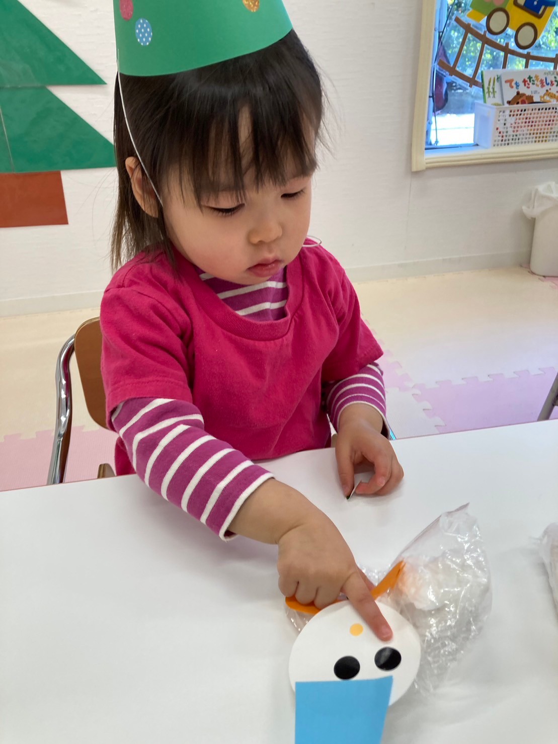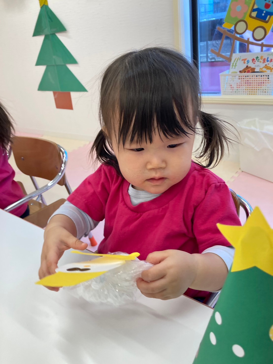 まずは製作を行い、ビニール袋に赤や白の花紙を丸めて入れてサンタクロースや雪だるまを作りました。