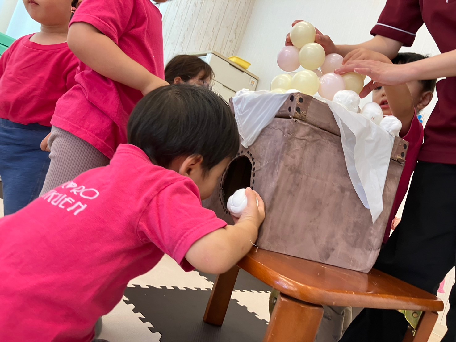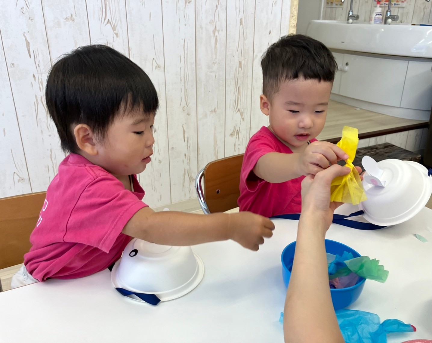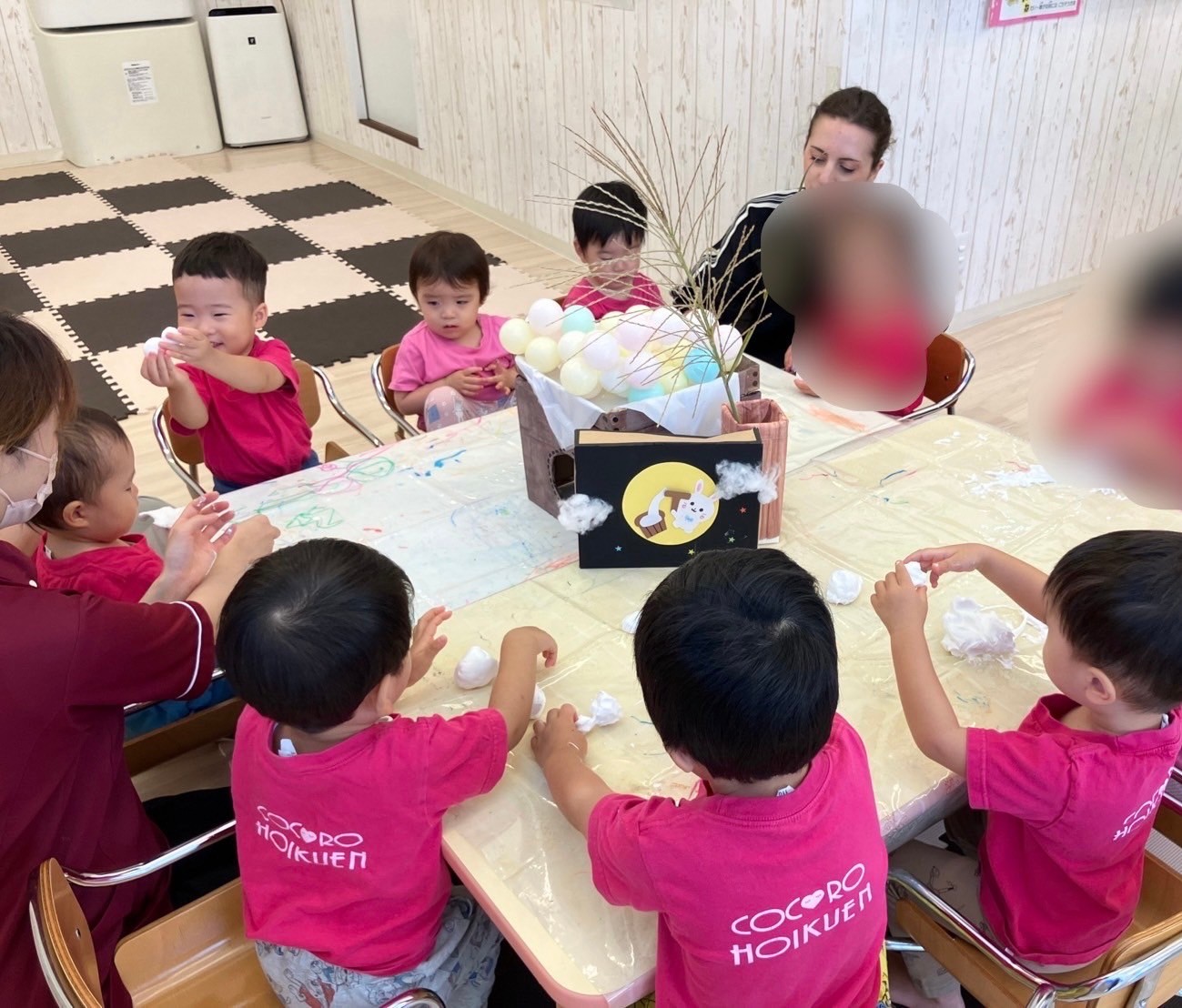 手でちぎったり、カップに入れたり、達成感でいっぱいの子ども達でした。