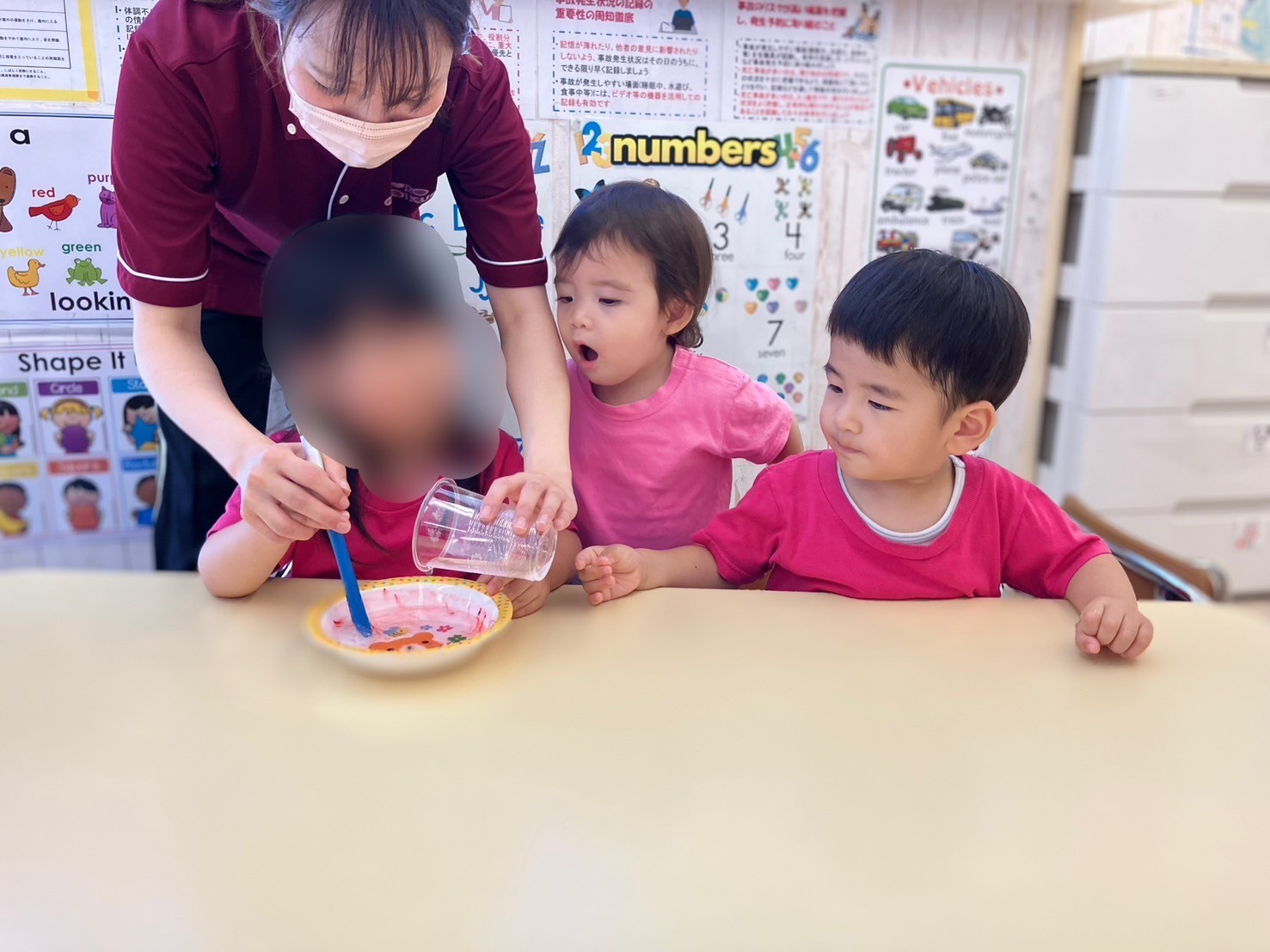 理科の実験のように、保育者と洗濯糊を混ぜます。