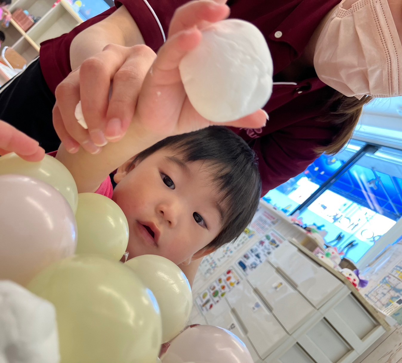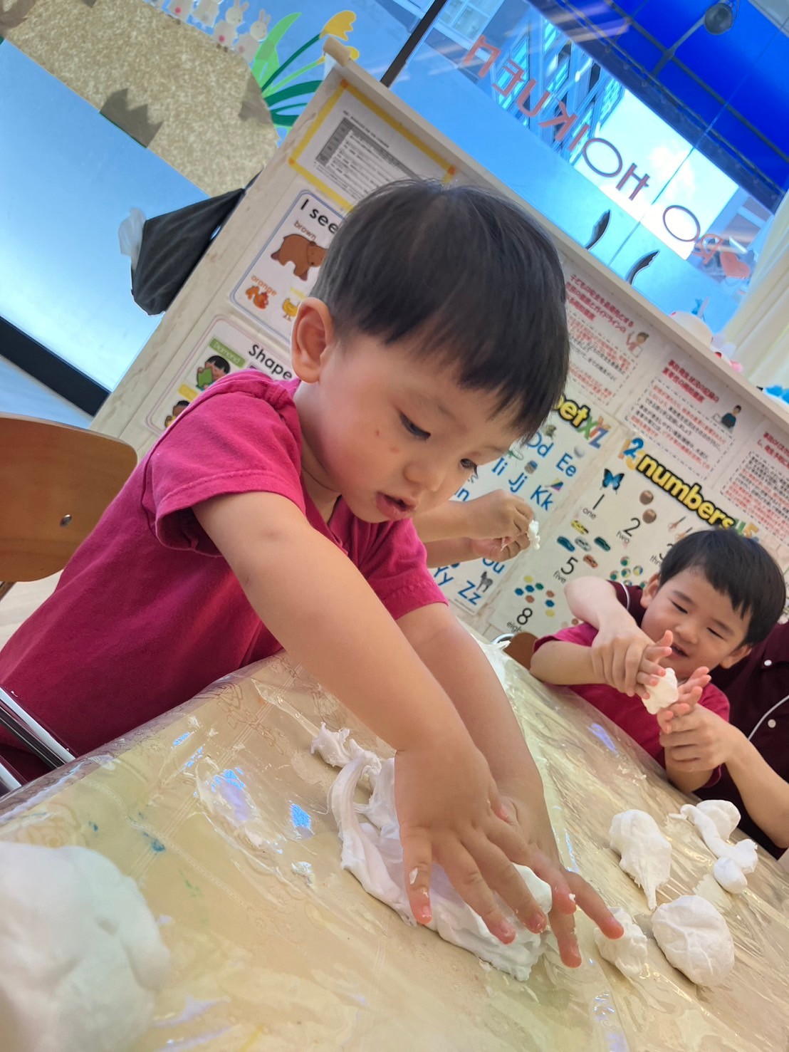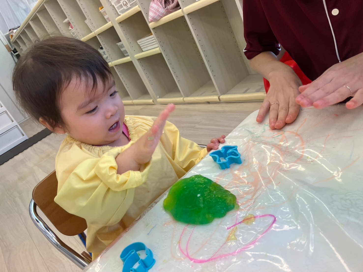 そんなこんなで‥スライムの完成です。「すっごーーーい!のびてる〜‼︎きもちい」とスライムに大喜び。