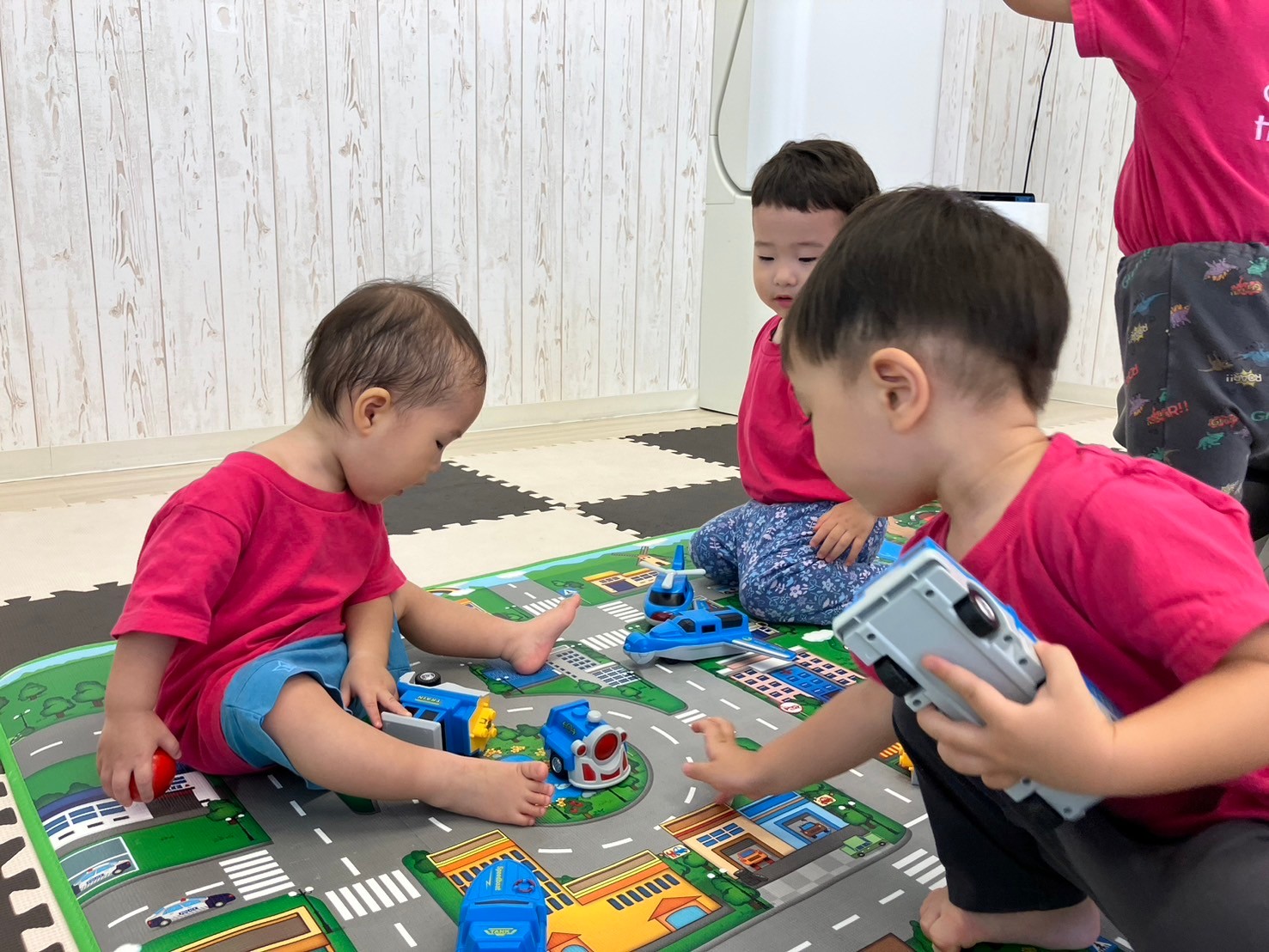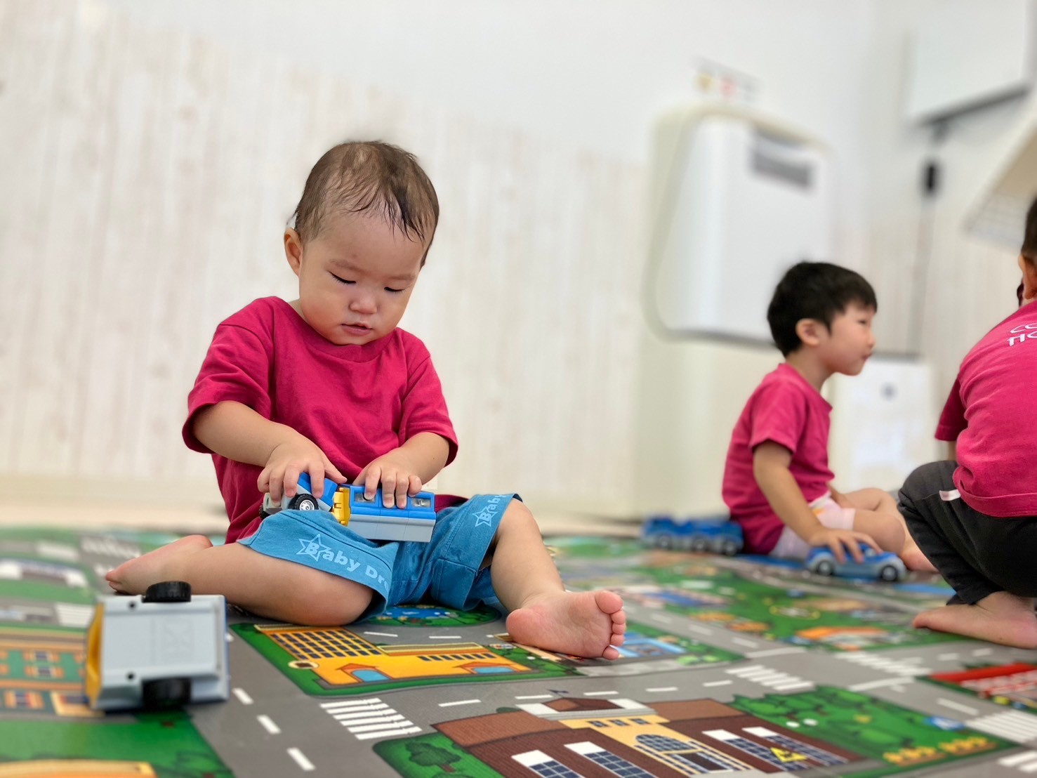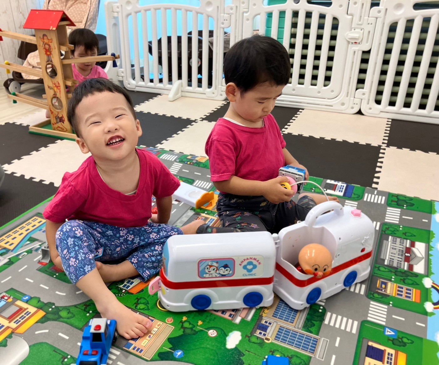 車のプレイマットの上で「くるまとおりまーす!しゅ〜っ‼︎」と言いながら働く車を走らせたり、救急セットを持ってきて、車のメンテナンスをする可愛い姿が見られ、朝から大盛り上がりの中之島園です。