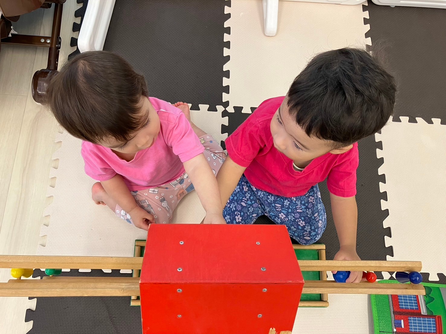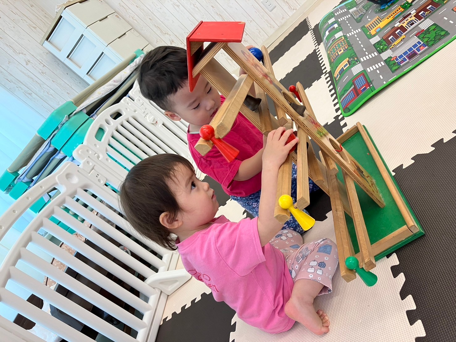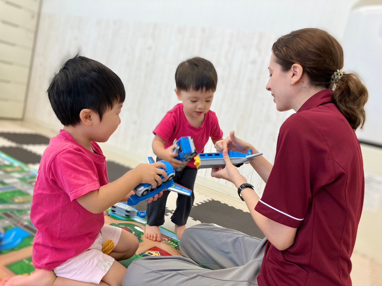 車のプレイマットの上で「くるまとおりまーす!しゅ〜っ‼︎」と言いながら働く車を走らせたり、救急セットを持ってきて、車のメンテナンスをする可愛い姿が見られ、朝から大盛り上がりの中之島園です。