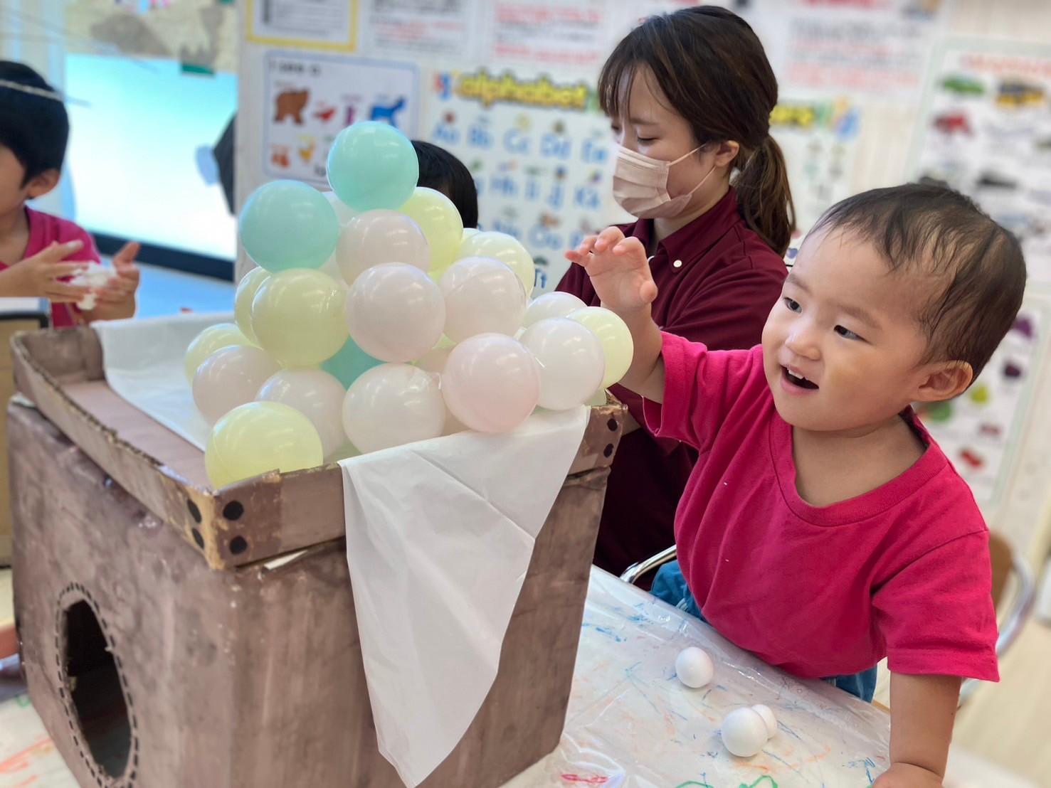 登園後は、保育者と好きな遊びを見つけて楽しんでいます。