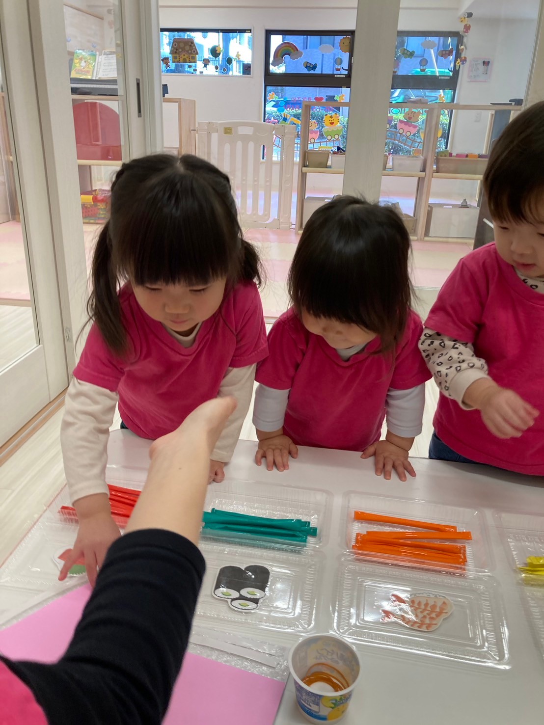 節分にちなんでまずはみんなで恵方巻きの製作を行いました。