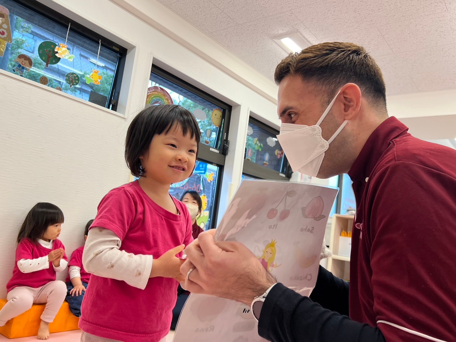 途中からは保護者の方もレッスンに参加し、一緒にチキンダンスをしたりポテトゲームをしたりとみんなで盛り上がりました。