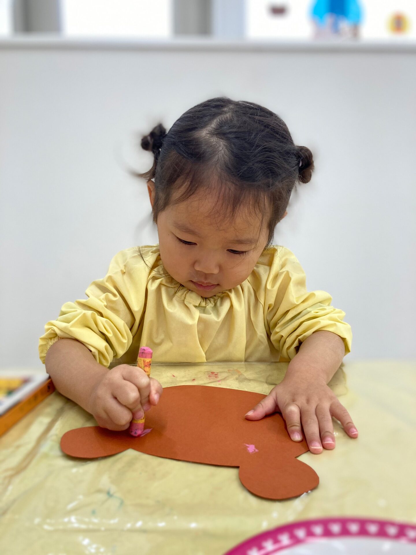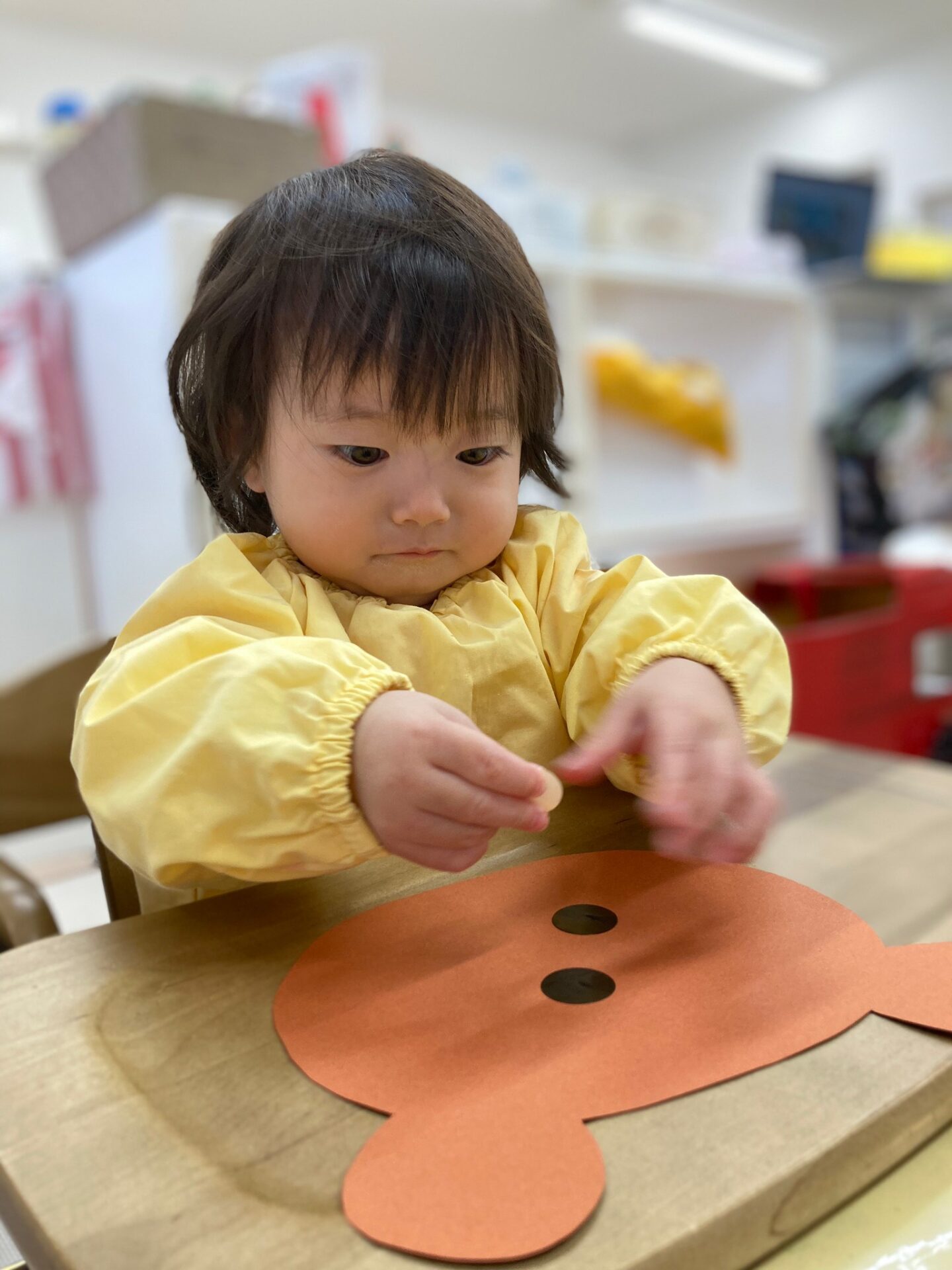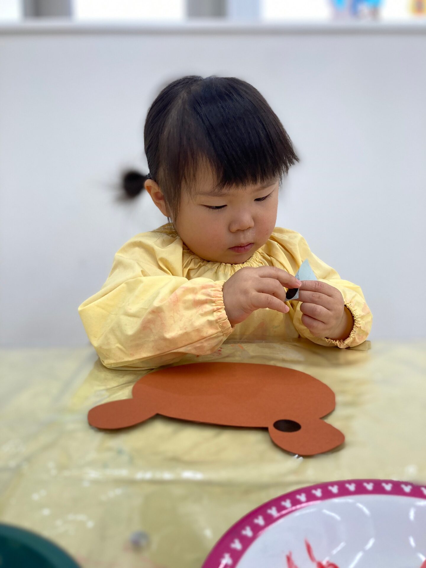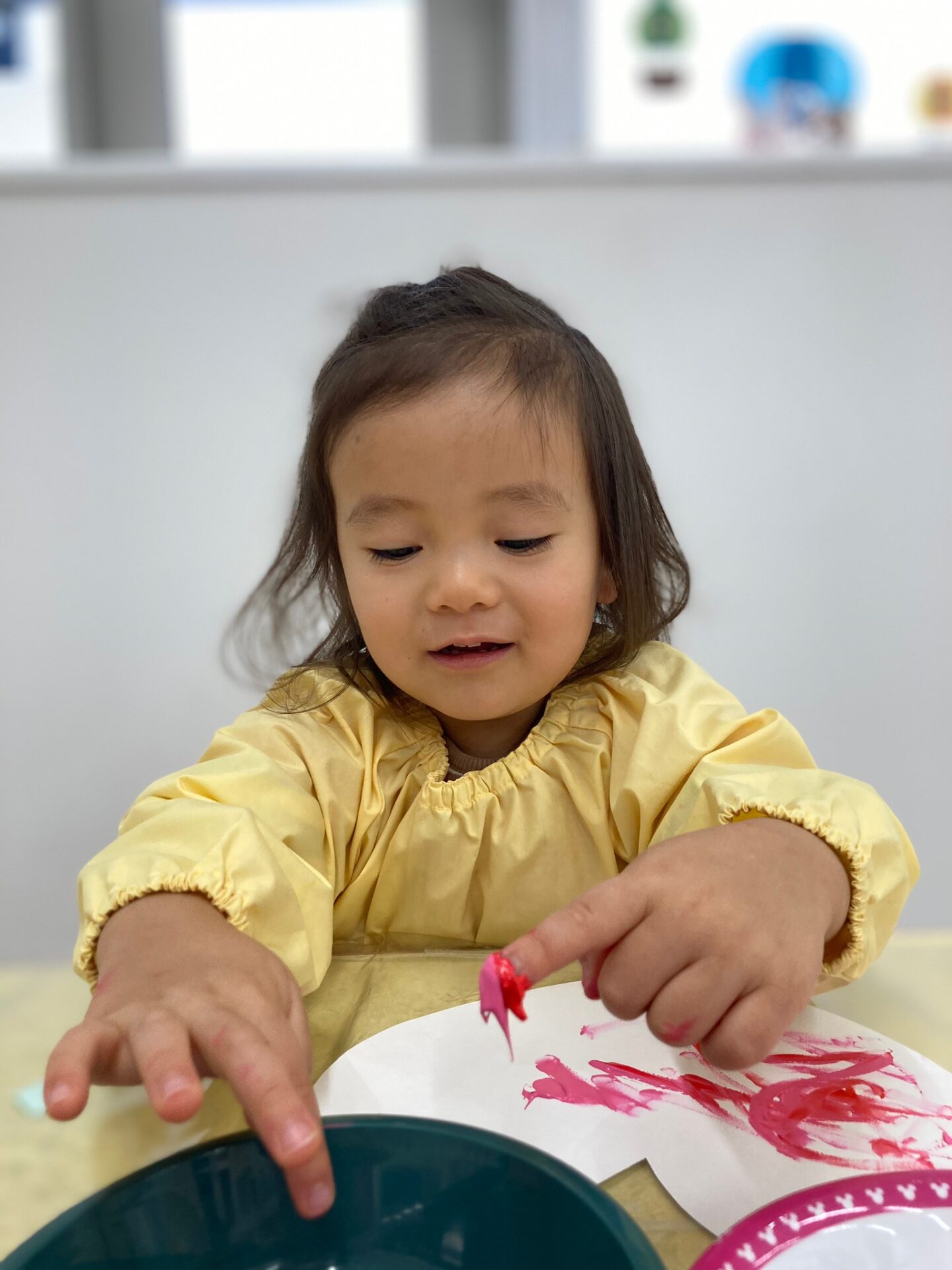 0歳児はビー玉転がして、1歳児は指絵の具、2歳児は筆でを使い、「ぴんくー」「あーか」と言いながら楽しんでいました。