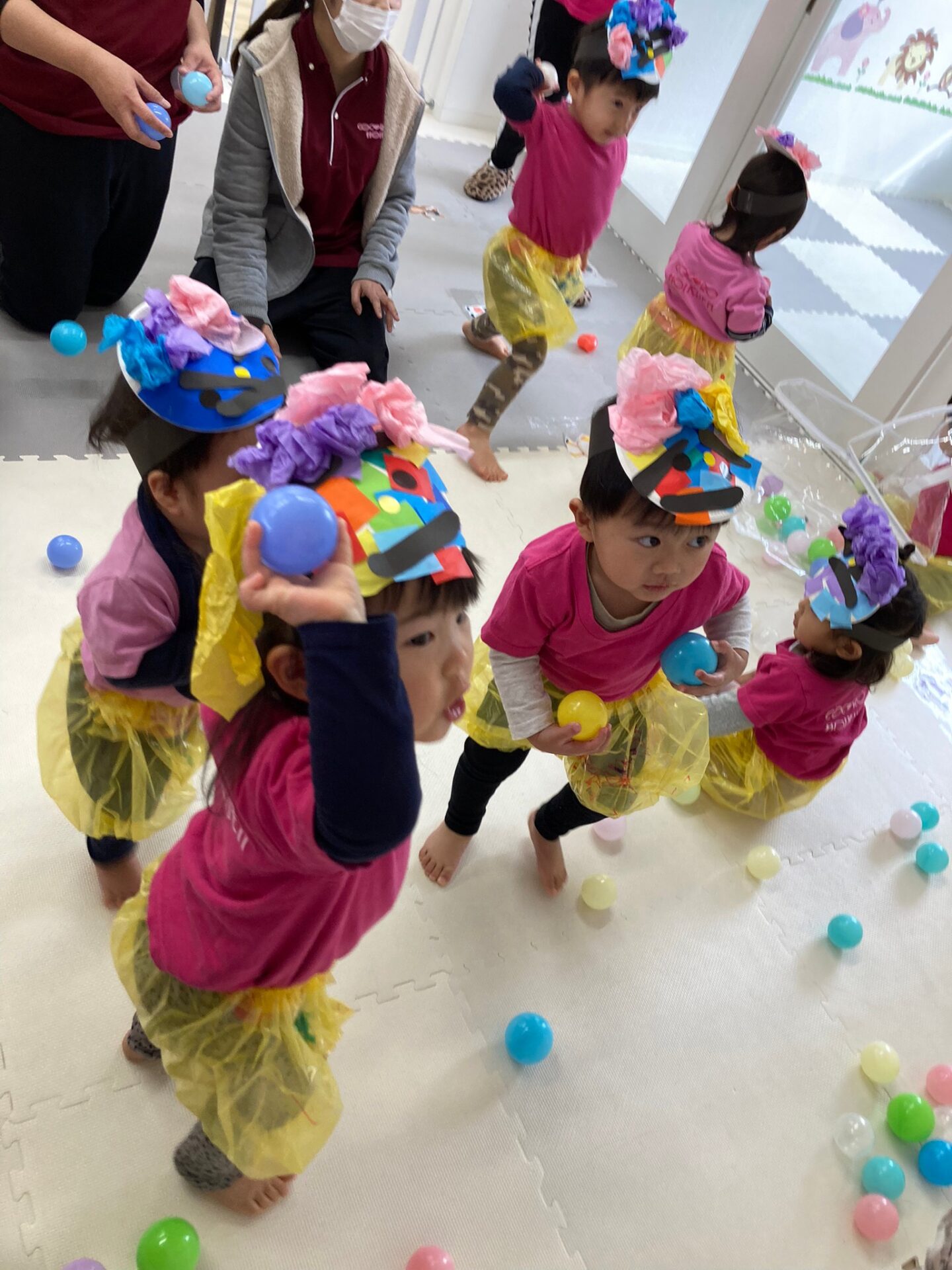 壁にいる、泣き虫鬼や風邪鬼、おこりんぼ鬼などに向けて、カラーボールを「おにはそとー!」と言いながら投げていました。