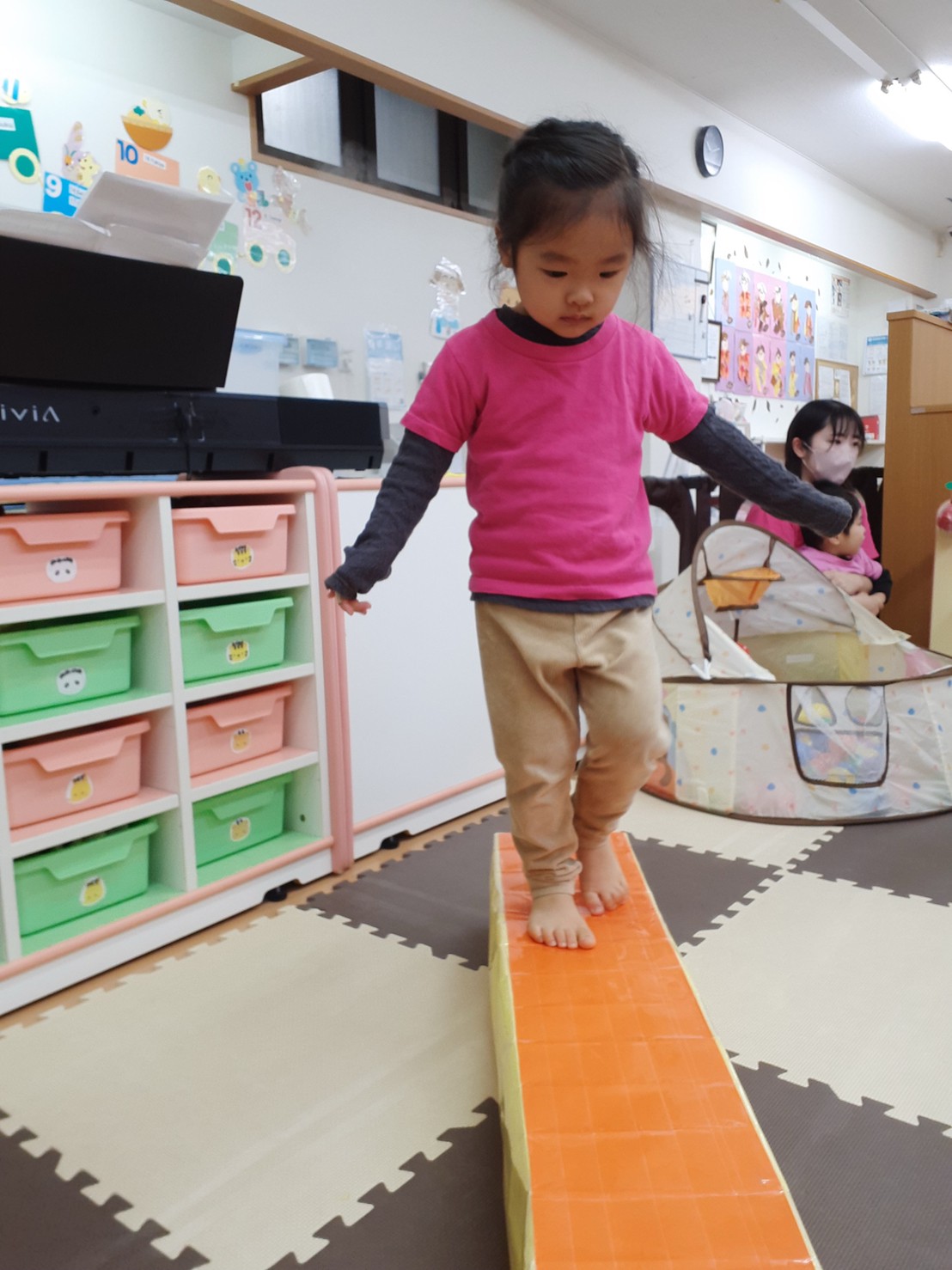 一本橋や滑り台、マットの山を乗り越えて秋の味覚狩りです♪