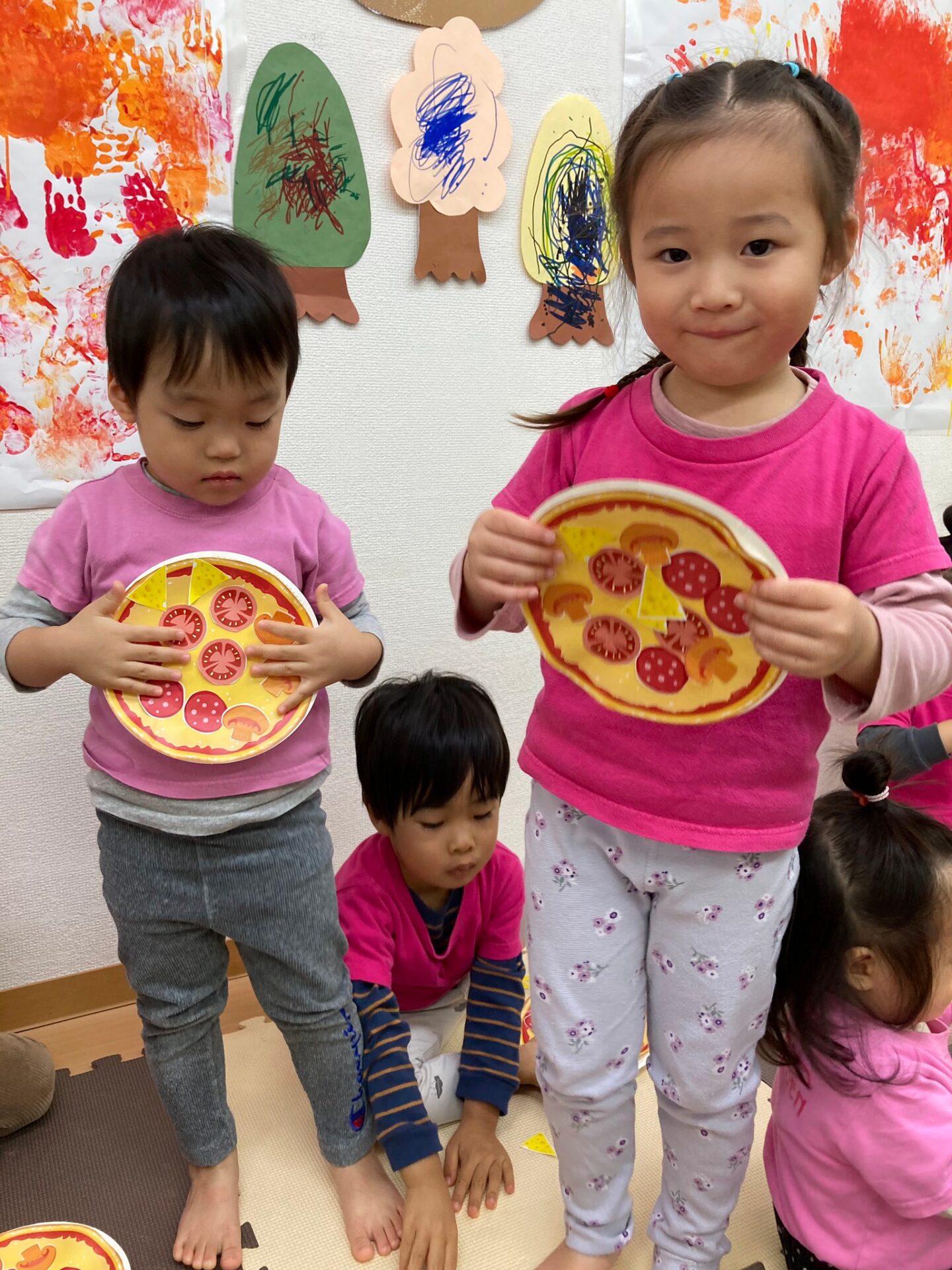 紙皿ピザも出来上がると、みんな食べるふりを上手にしていました。