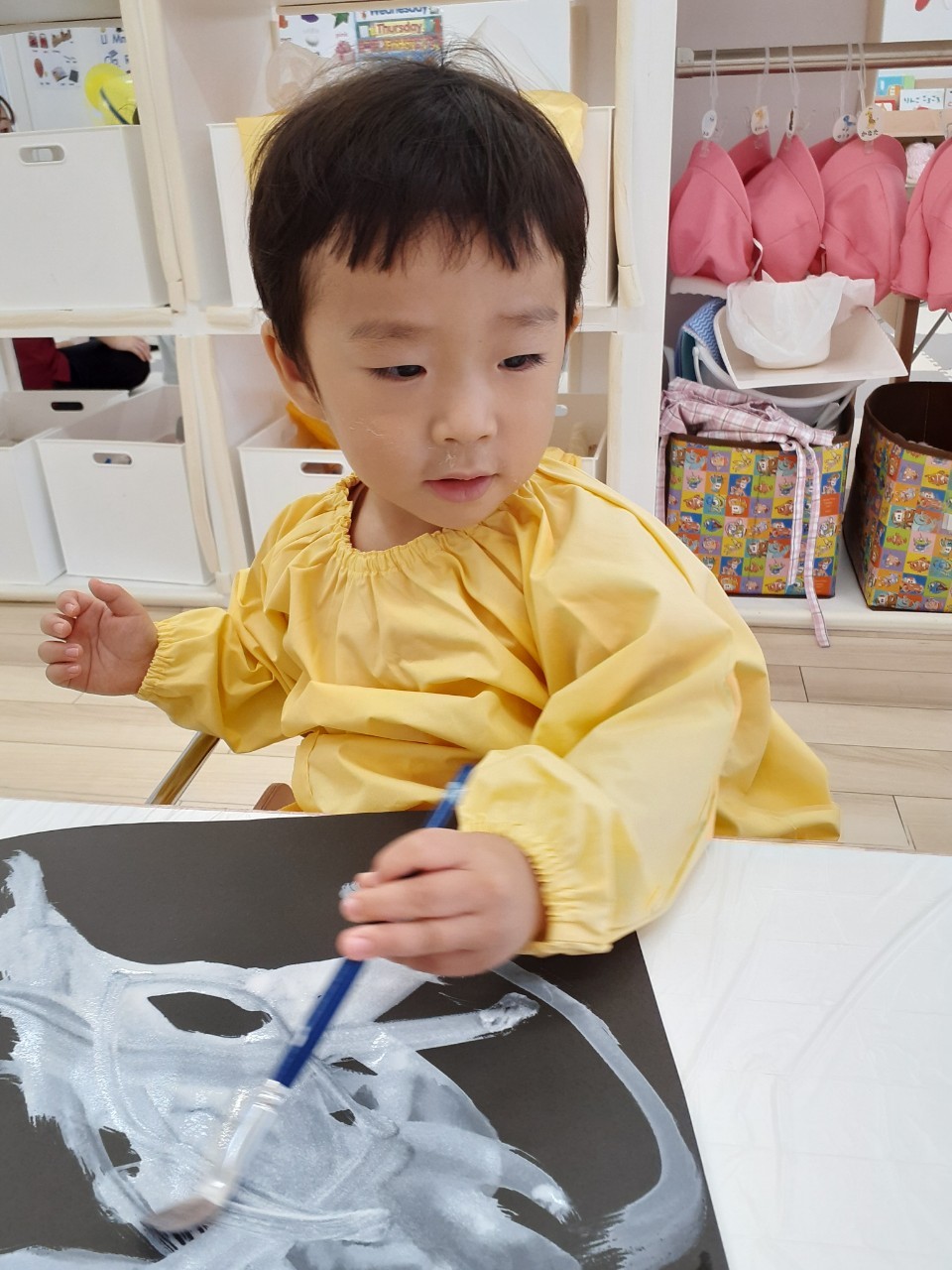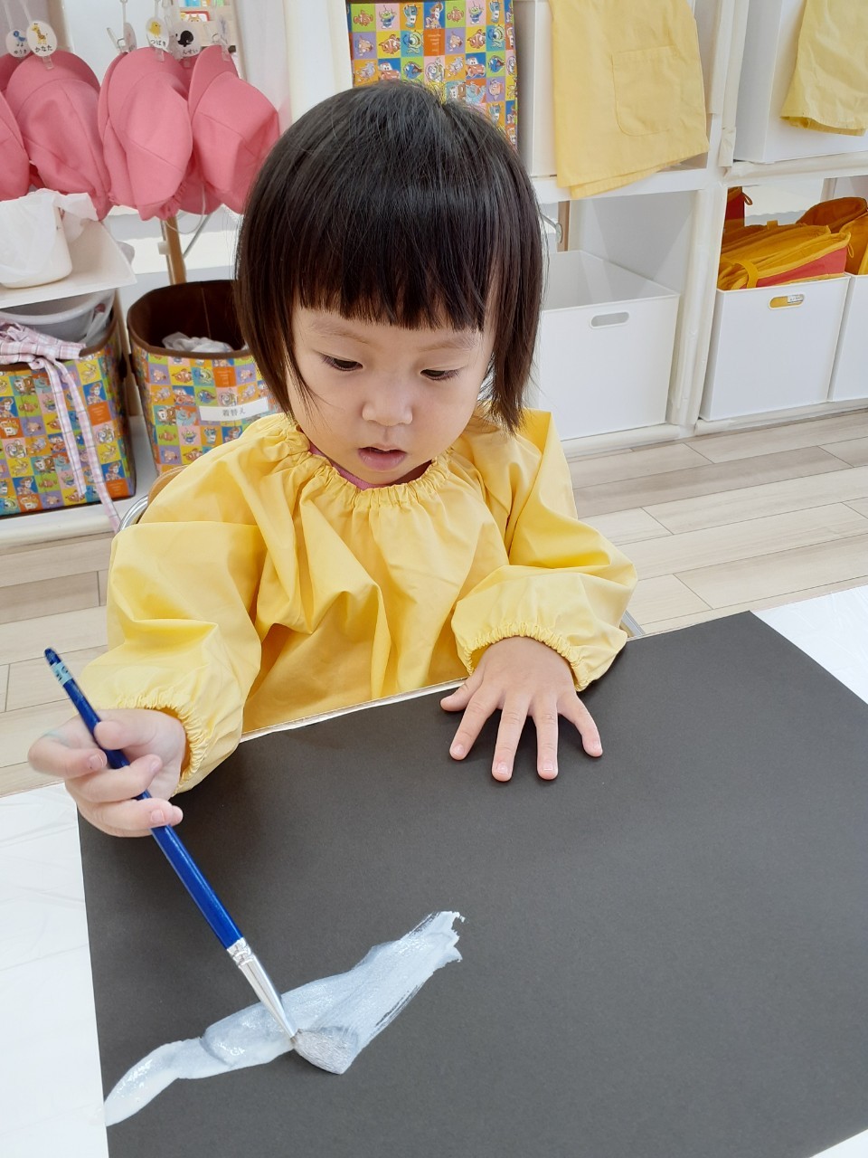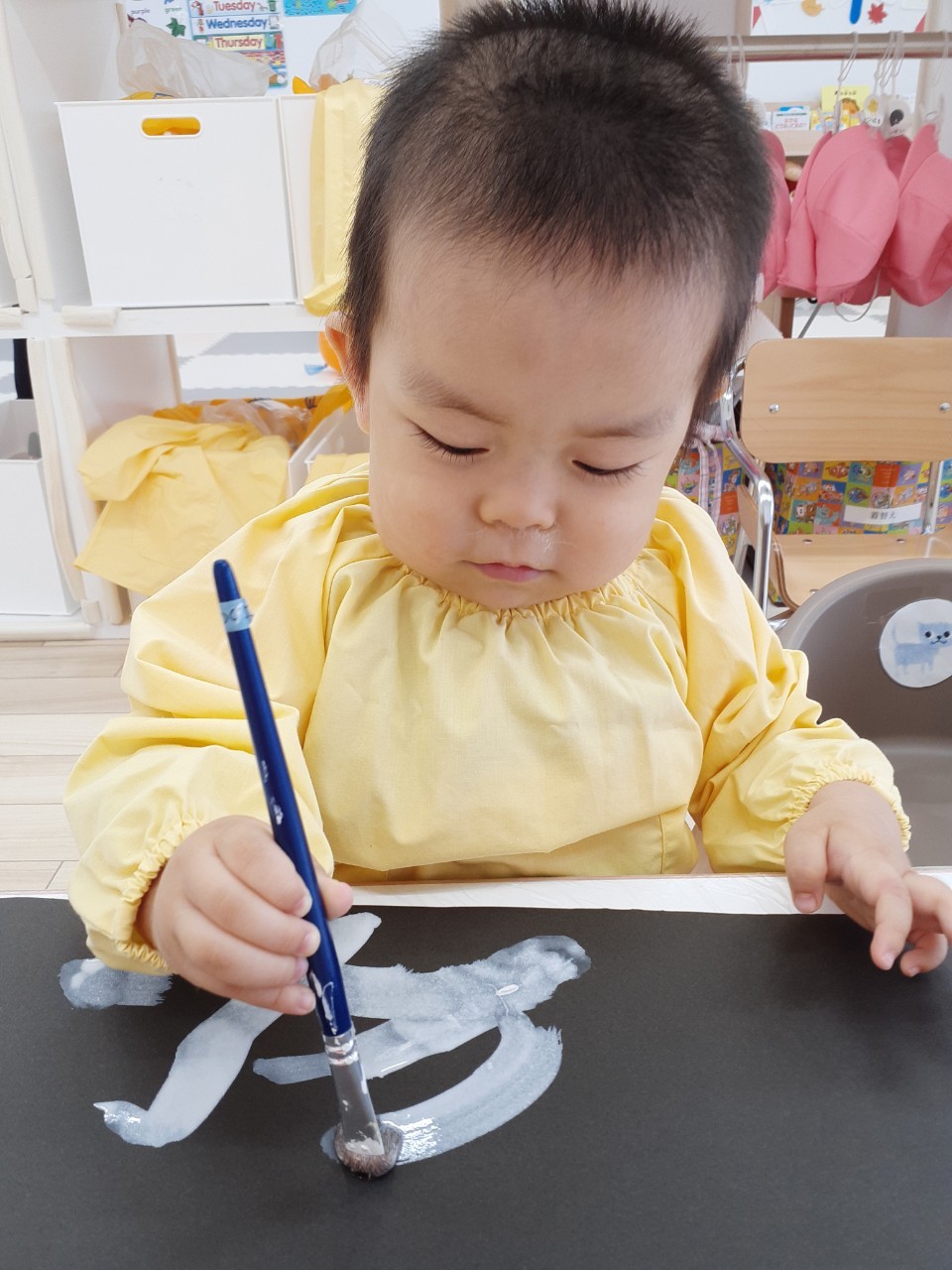 1歳児は、初めて筆を持って画用紙に絵の具で塗り広げをしました。