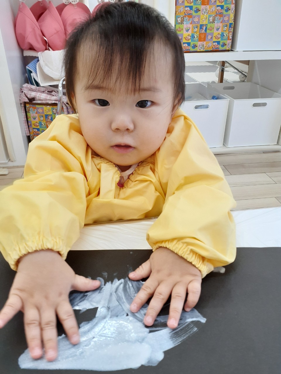 0歳児、画用紙に絵の具をつけると両手を使って感触をみながら塗り広げを行っていました。