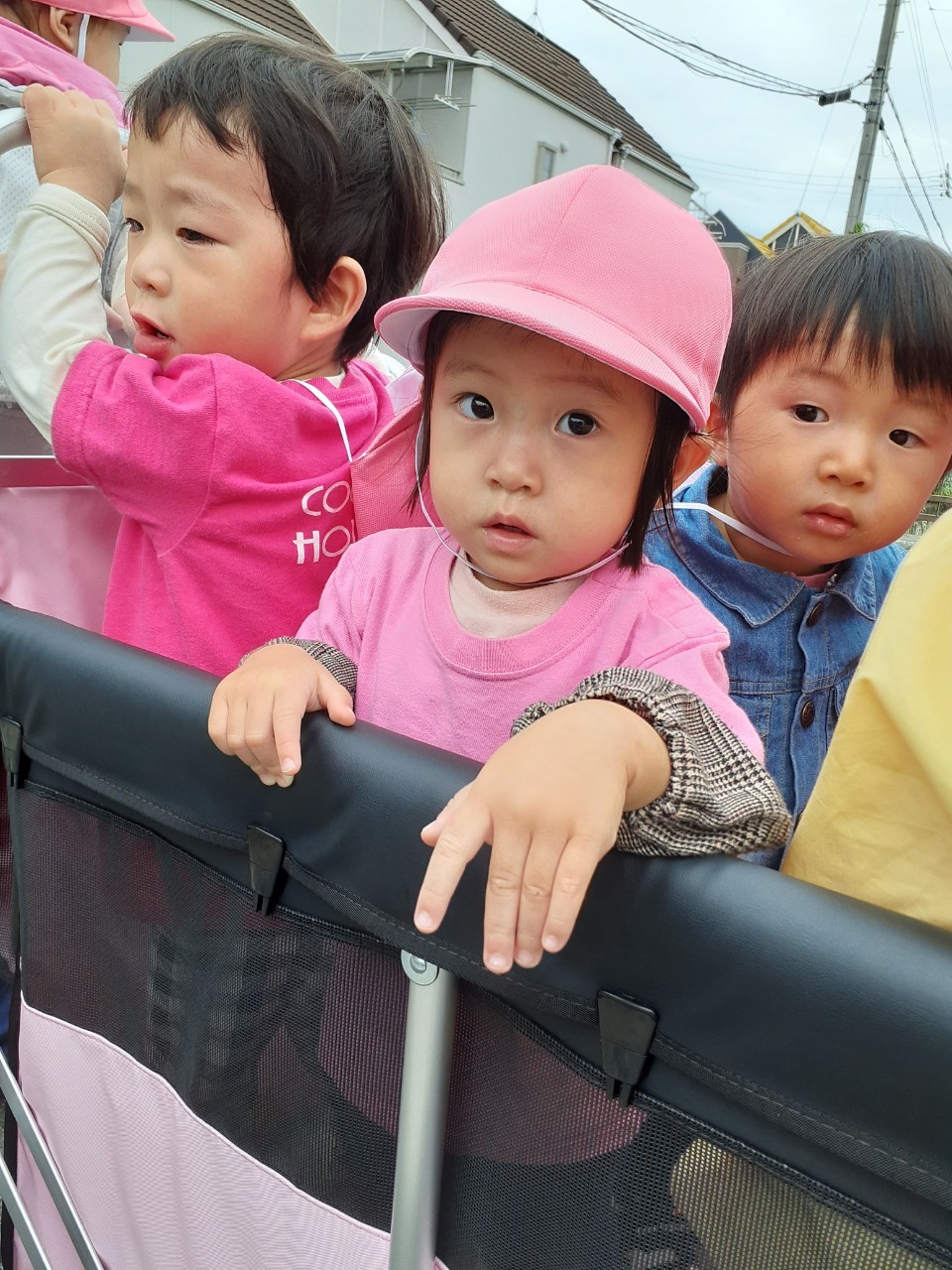 バギーに乗り、出発するとトラックやミキサー車に大興奮で教えてくれています。