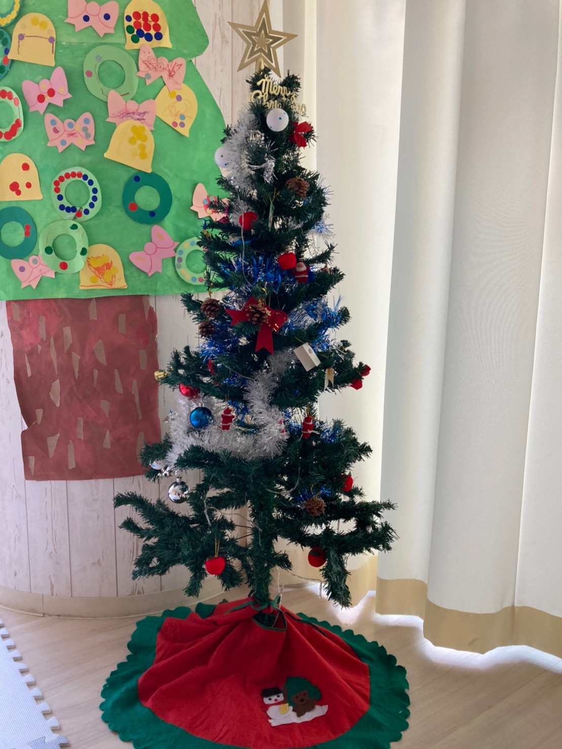 大きいお兄さんやお姉さんは、背伸びをして、ツリーの上の方まで頑張って飾り付けてくれました。