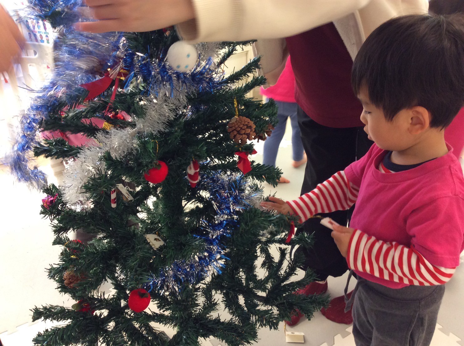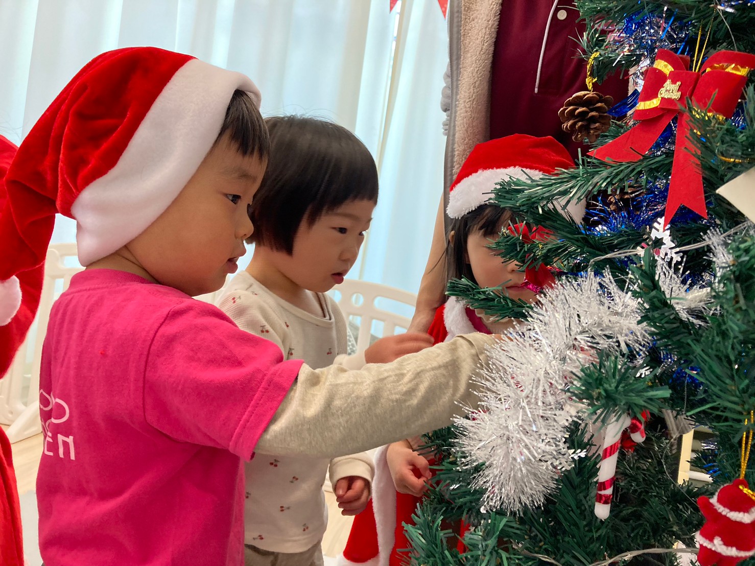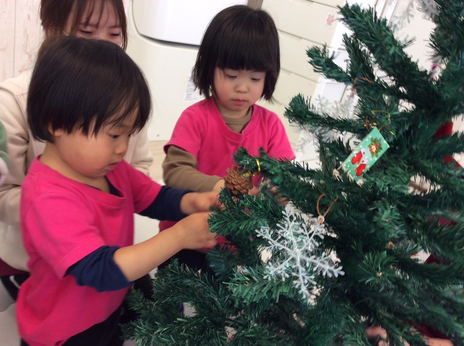 クリスマス本番が近付き、保育園のツリーを皆で飾り付けました。