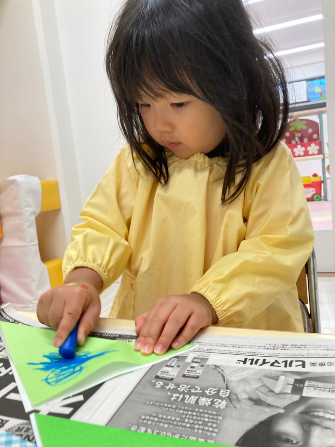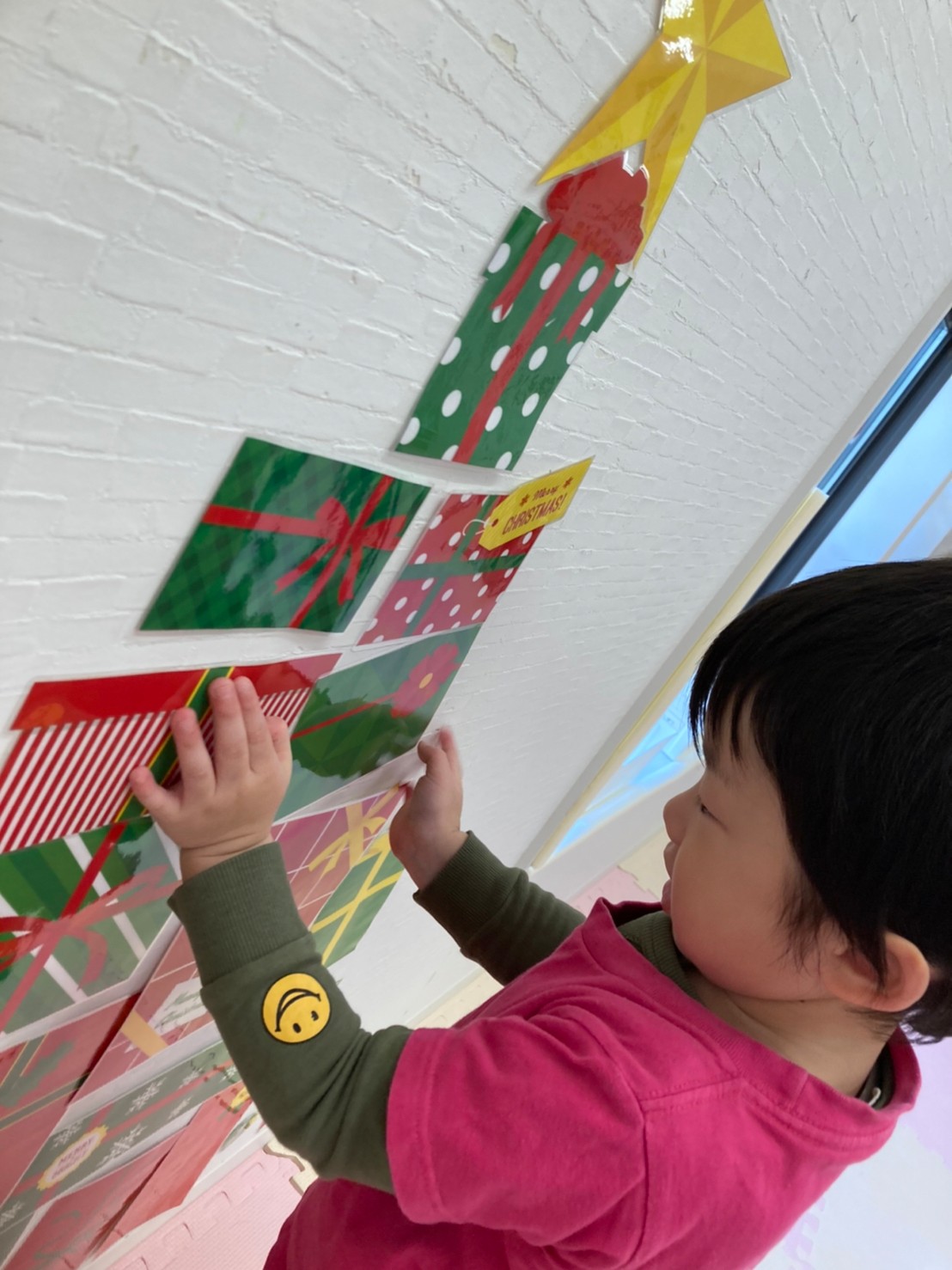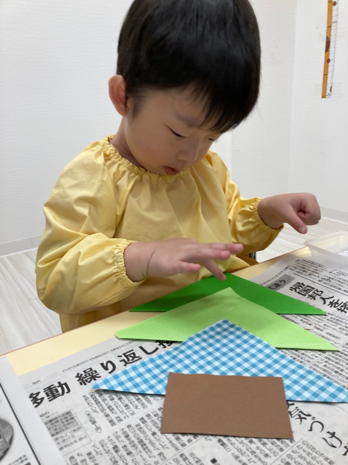 2歳児は折り紙に挑戦!角と角を合わせて三角を作り、クリスマスツリーを作りました。