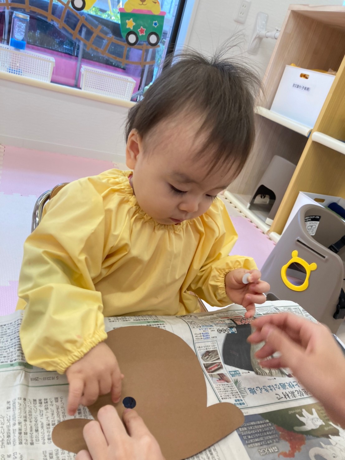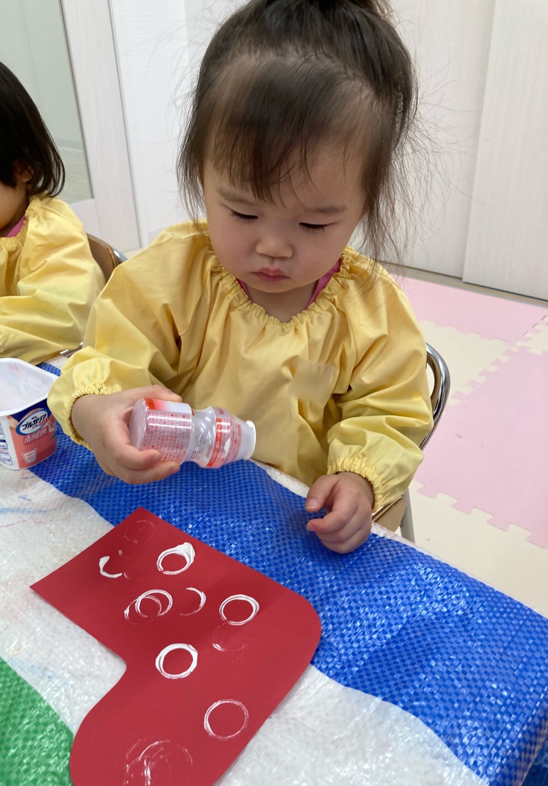 0歳児は手形でトナカイを、1歳児は廃材でスタンプをして可愛い靴下を作りました。