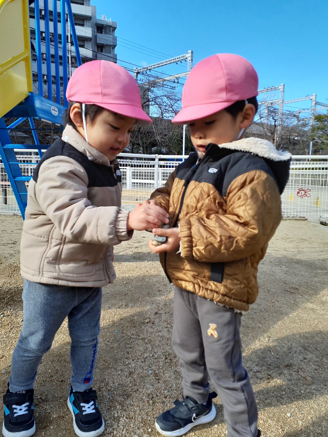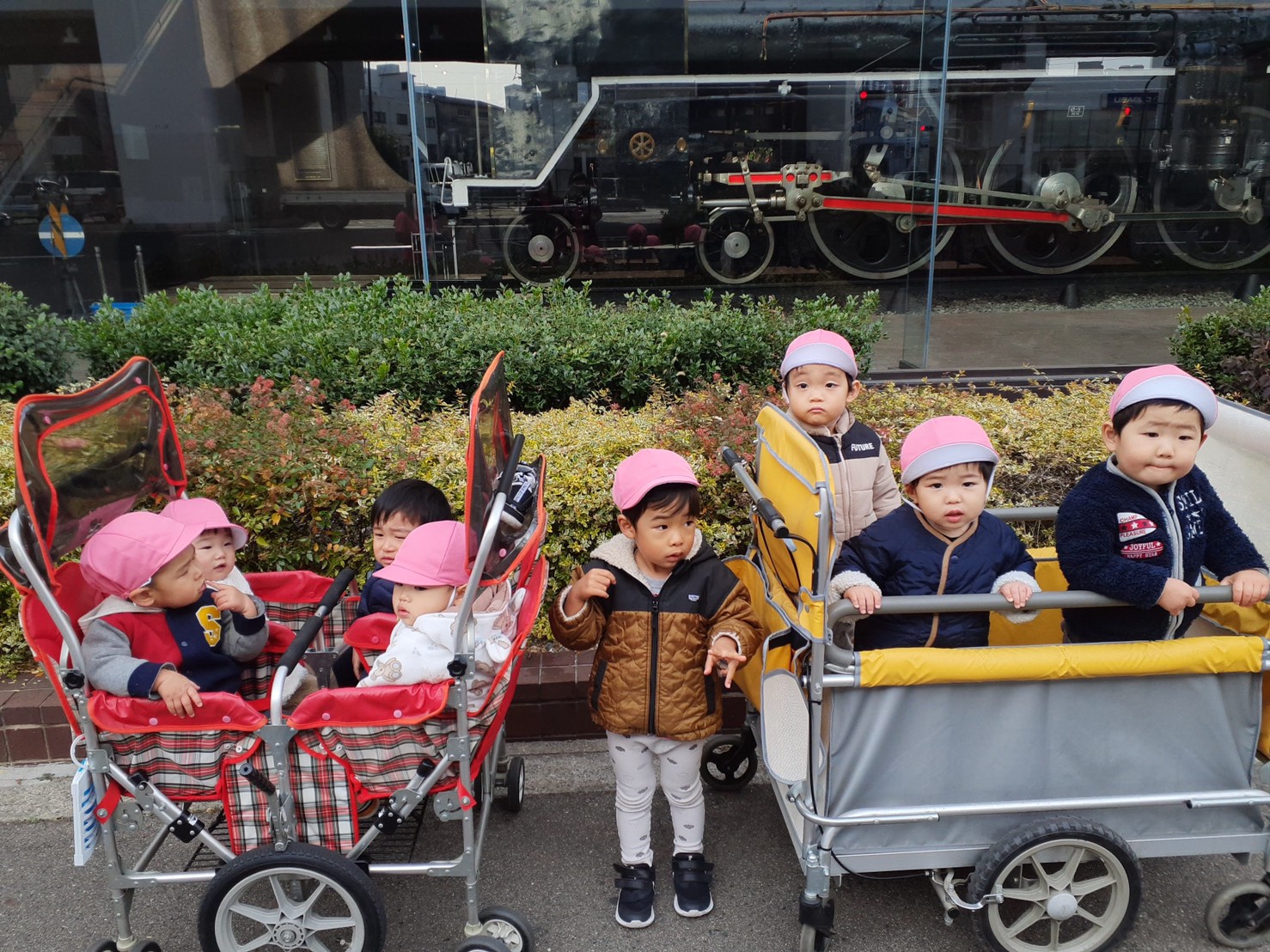 コマ回しは少し難しいようですが、ゆびさきを使ってまわそう羽子板リレーは少し援助してあげると次のお友だちまで上手に運んでいました。終わったあとは保育園全員で大炉伸びしました。
