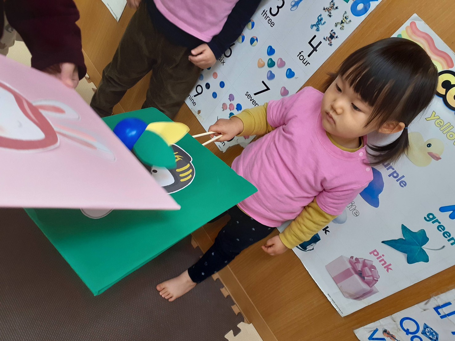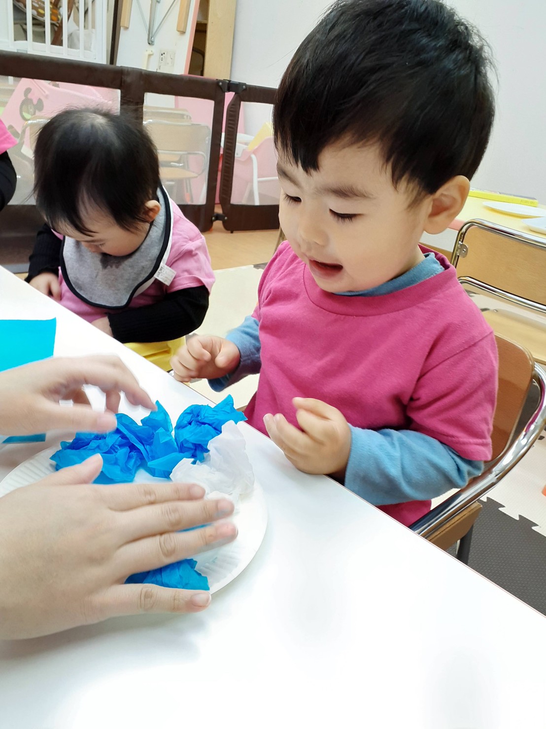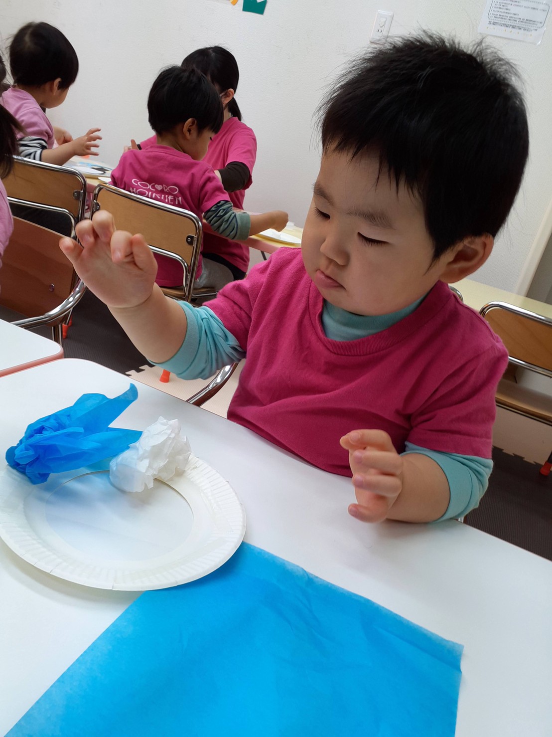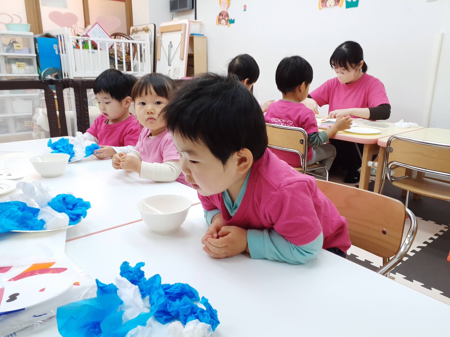2歳さんはバランスを見ながら上手に貼っていて、0、一歳は花紙を丸めて作りました‼️