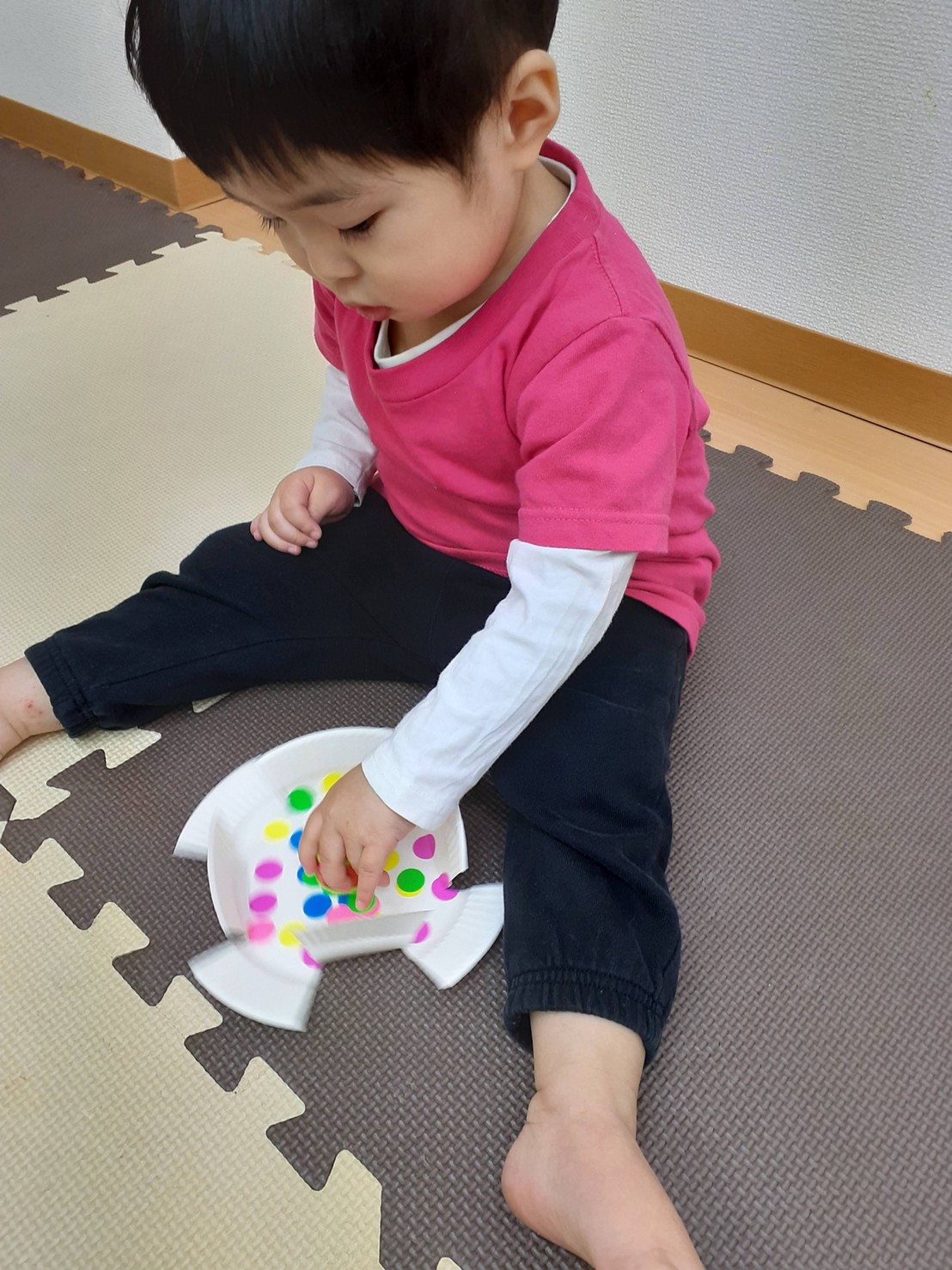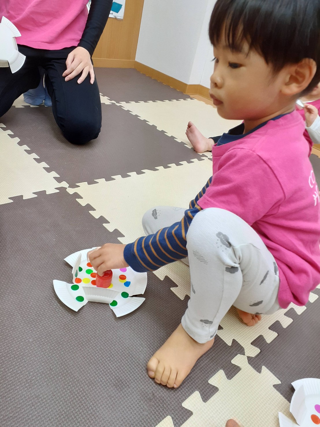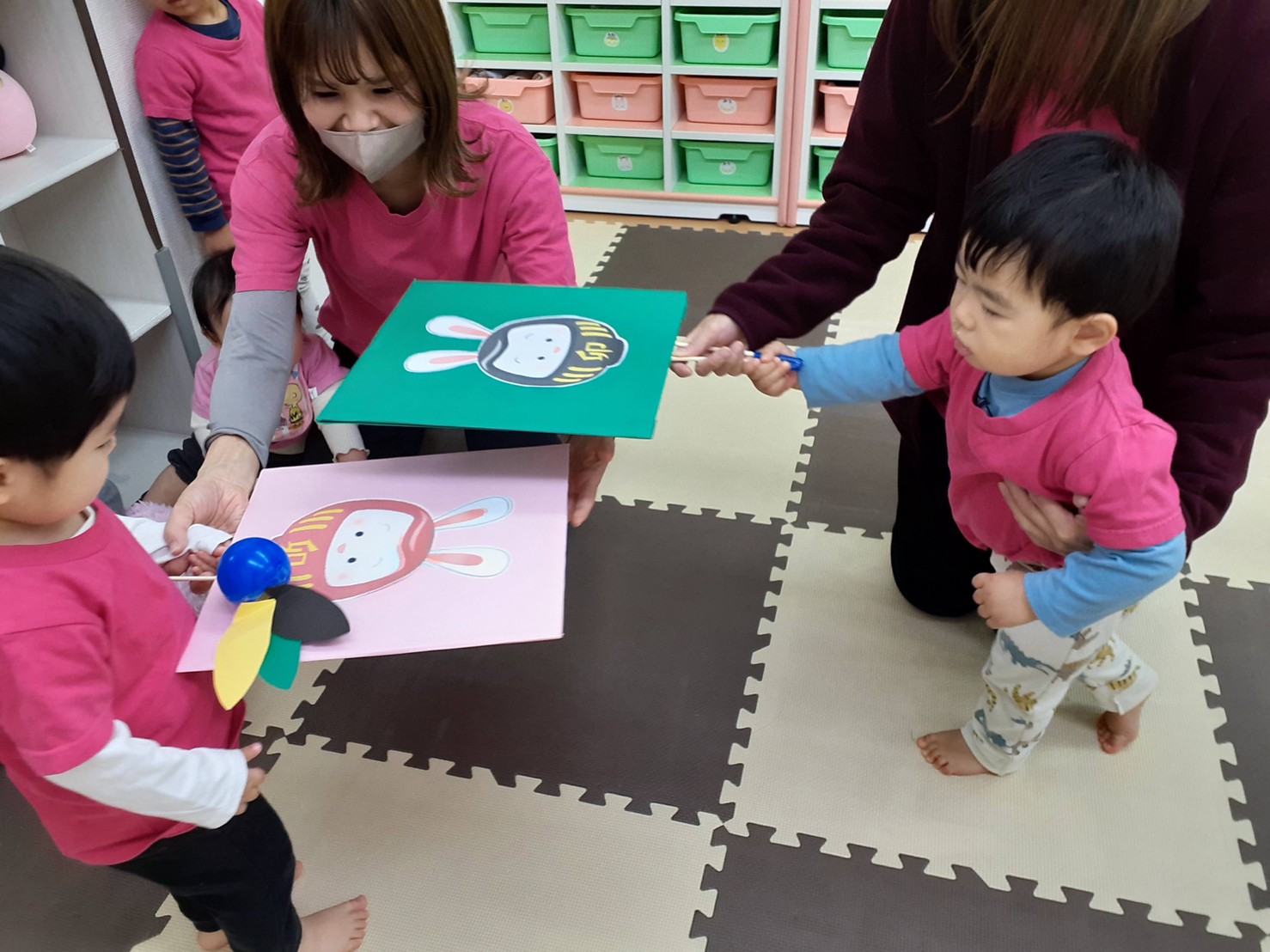 だるま積み、紙皿コマ回し、羽子板リレーをしました。