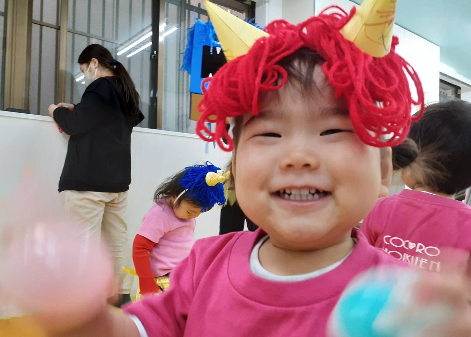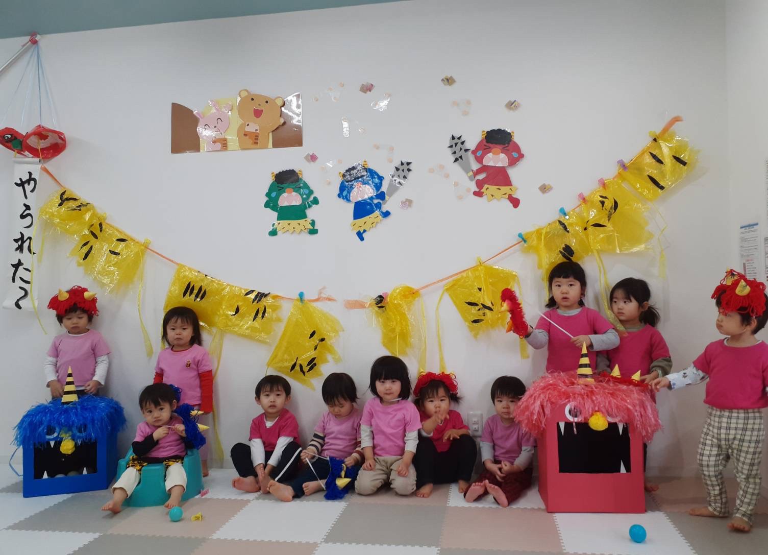 初めは大きな段ボール鬼にびっくりしたり泣いてしまう子もいましたが、「えい!」や「おにはーそと!ふくわーうち!」と思い思いの声かけをしながら、一生懸命力をこめてボールを投げて退治してくれました。