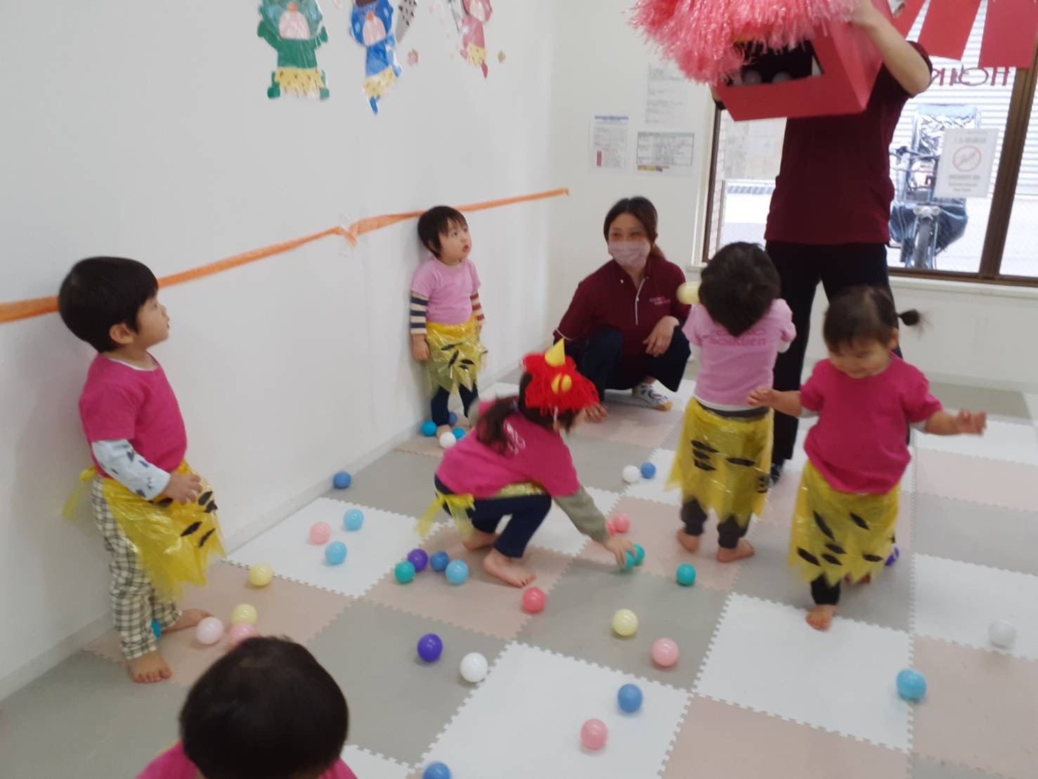 あちこちに動くボス鬼に後ずさりしたり遠くに逃げる子もいましたが、みんなで力を合わせてボールを投げて退治できました♪