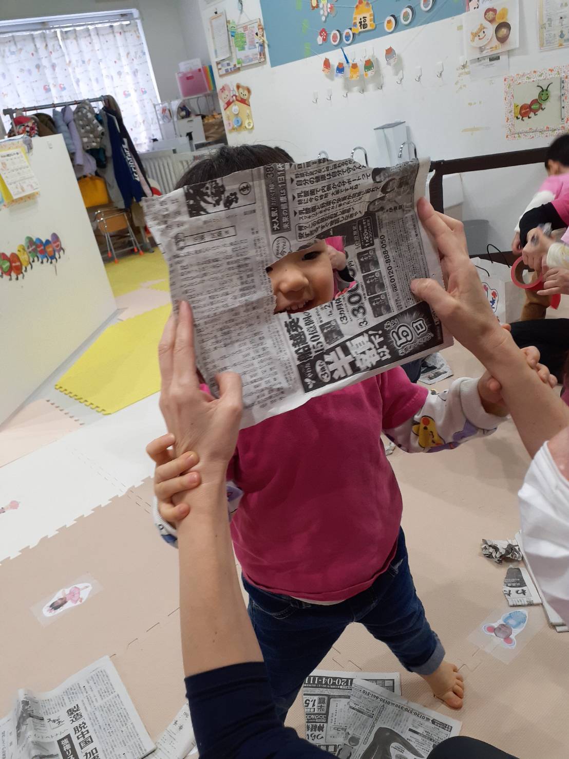 新聞紙を三角や四角に折ったりちぎったりして見立てあそびを楽しんでいる子もいました♪