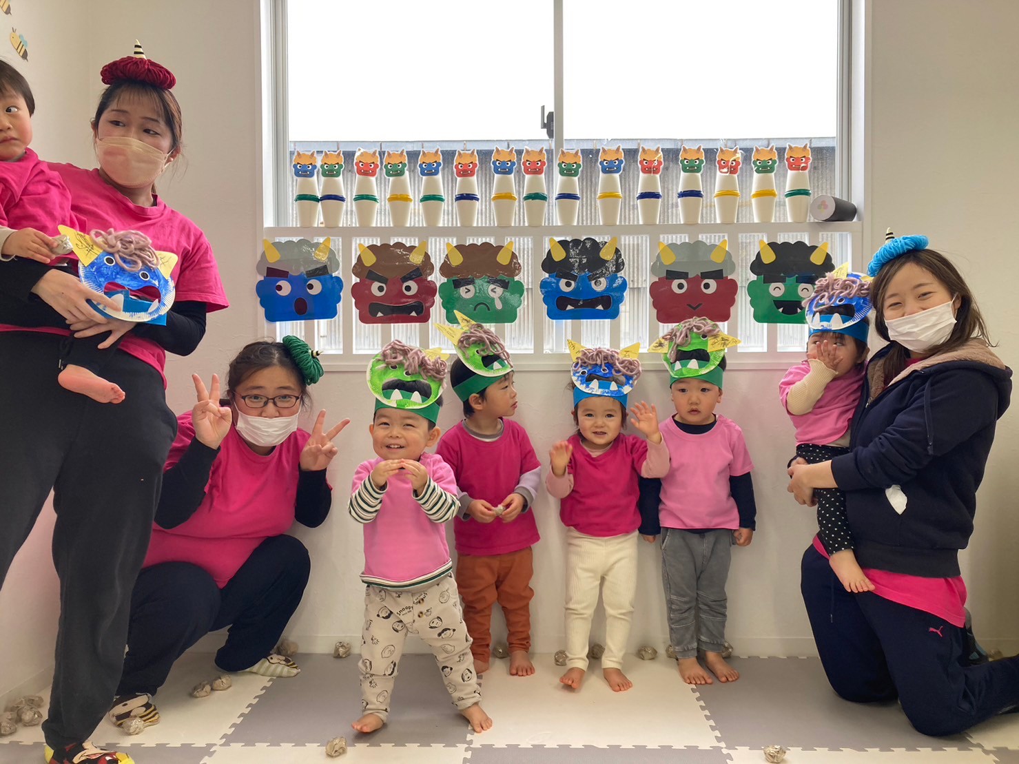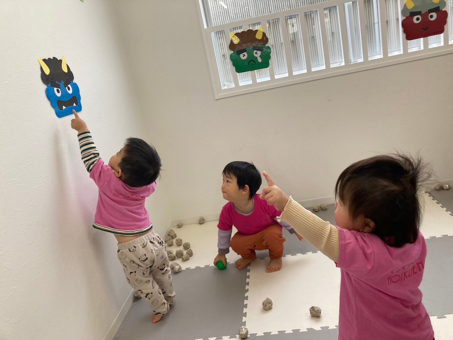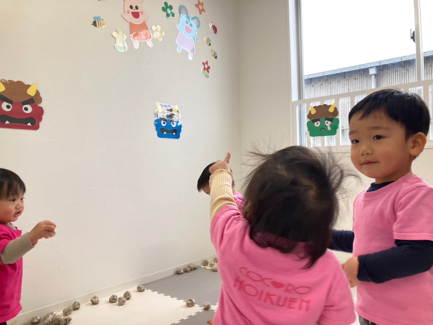 豆まきでは、鬼の壁面をみつけると「オニさんいっぱい!」と言って豆を投げ始めていました。「えいっ!」や「オニはそと〜!」と言って全力で投げ「せんせー、おに、えいっ‼したよ!」と教えてもくれました。
