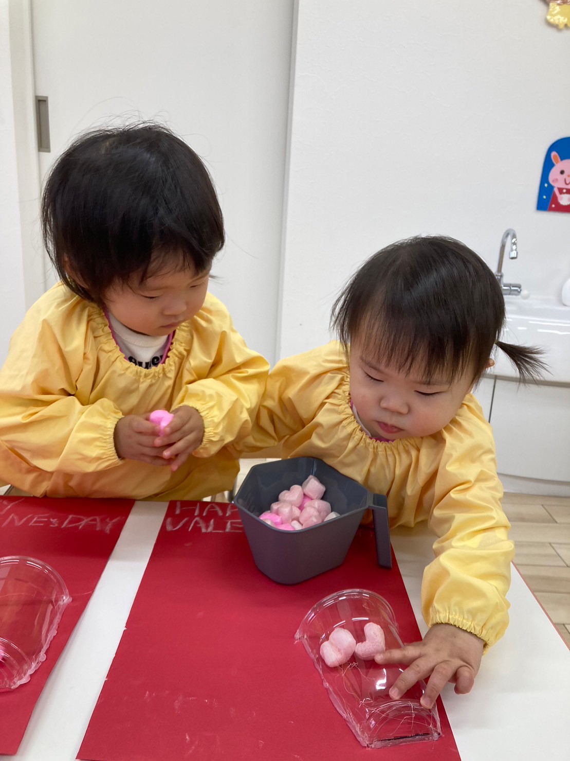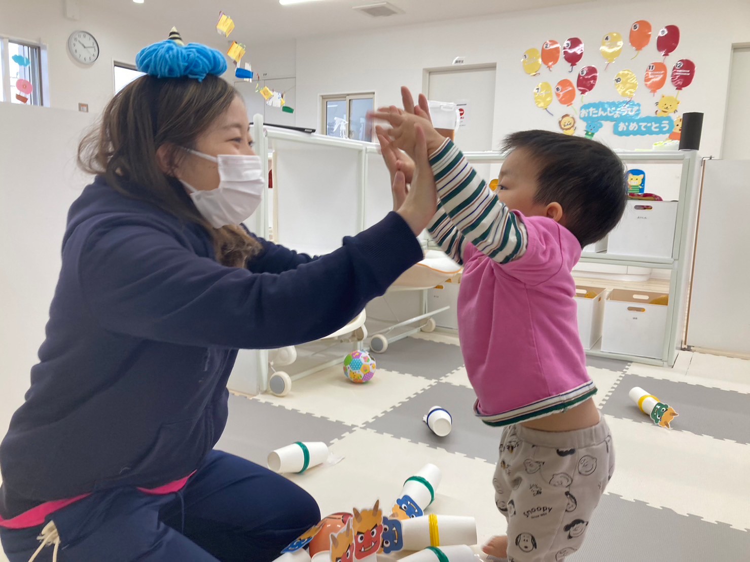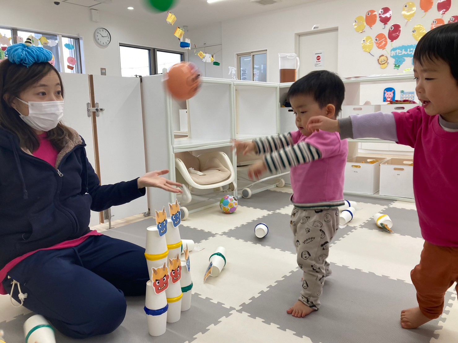 豆まきでは、鬼の壁面をみつけると「オニさんいっぱい!」と言って豆を投げ始めていました。「えいっ!」や「オニはそと〜!」と言って全力で投げ「せんせー、おに、えいっ‼したよ!」と教えてもくれました。