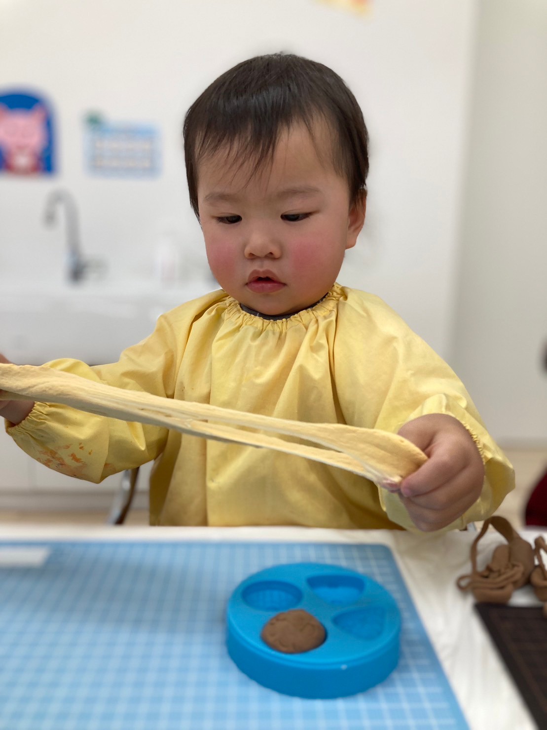 「こねこね〜」と言いながら、粘土をこねて伸ばしたり、型にちぎって入れたりして楽しんでいましたよ。