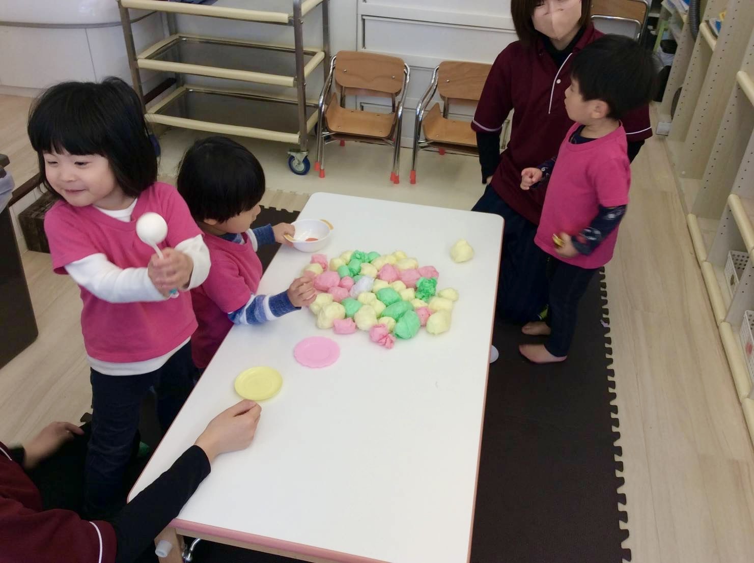 今年度のひな祭りでは、宝探し、人形釣り、あられ運びゲーム等色々な遊びを楽しみました。