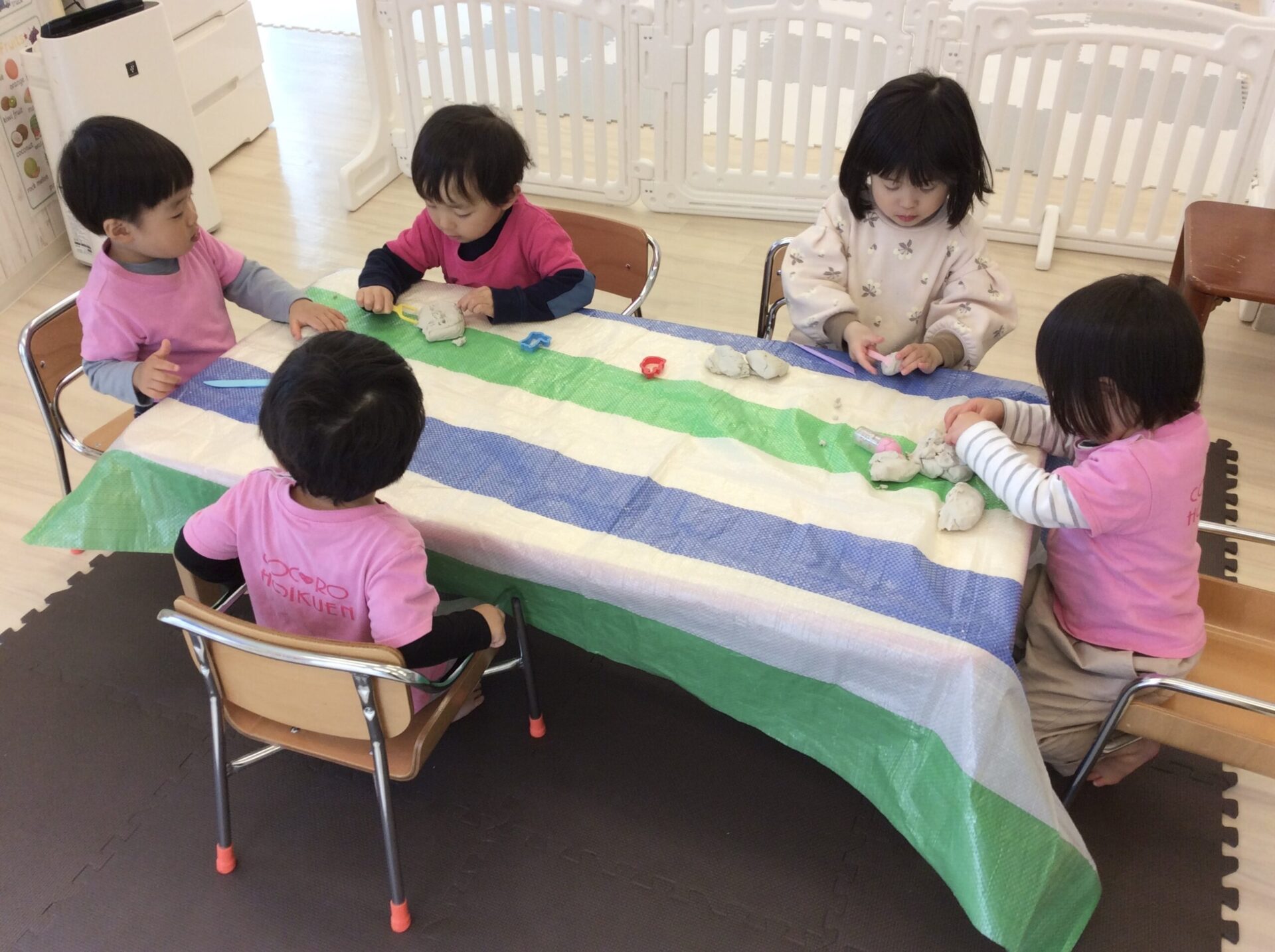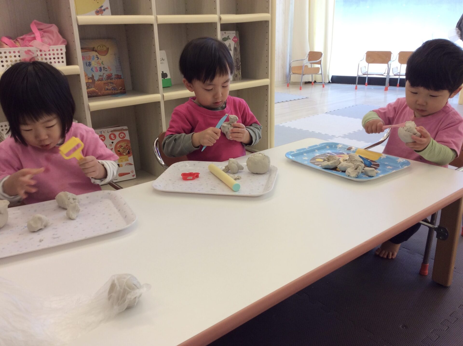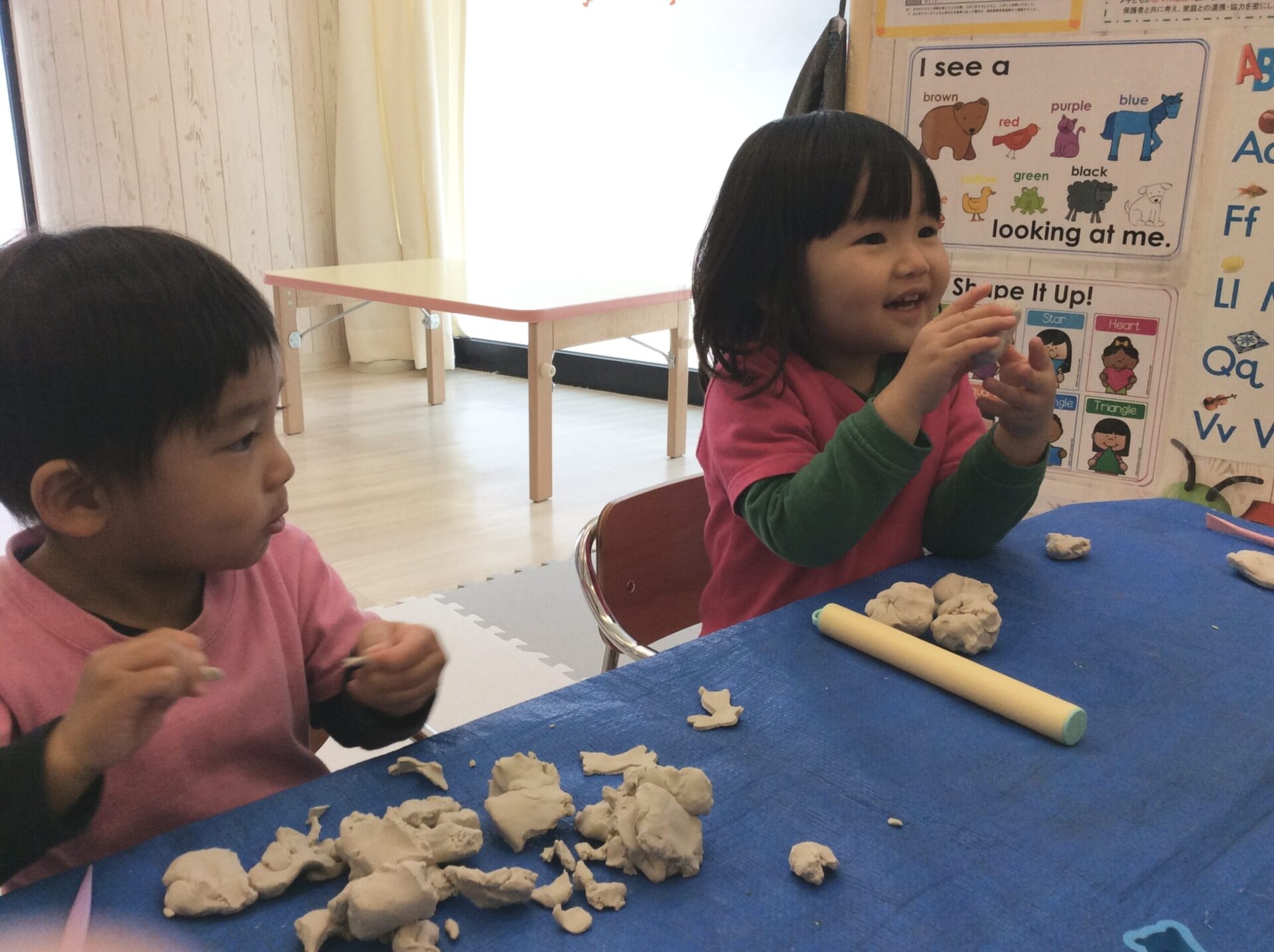 2歳児は細く伸ばす、丸めることが出来るようになり、友だちとお店屋さんごっこを楽しんでいます。