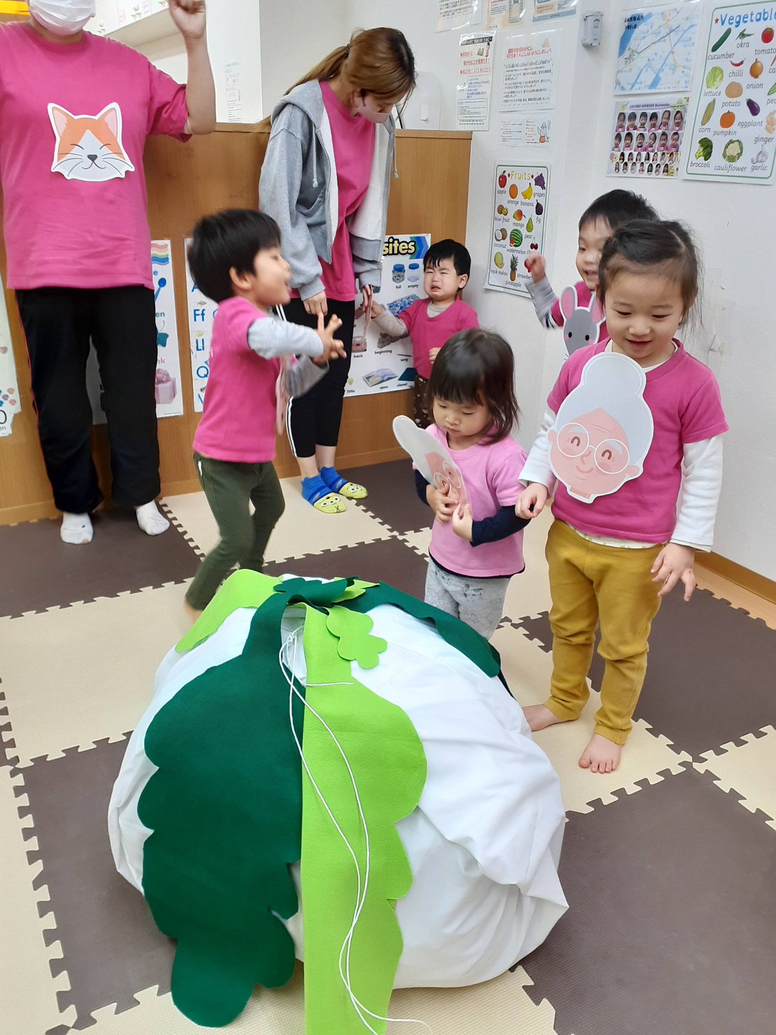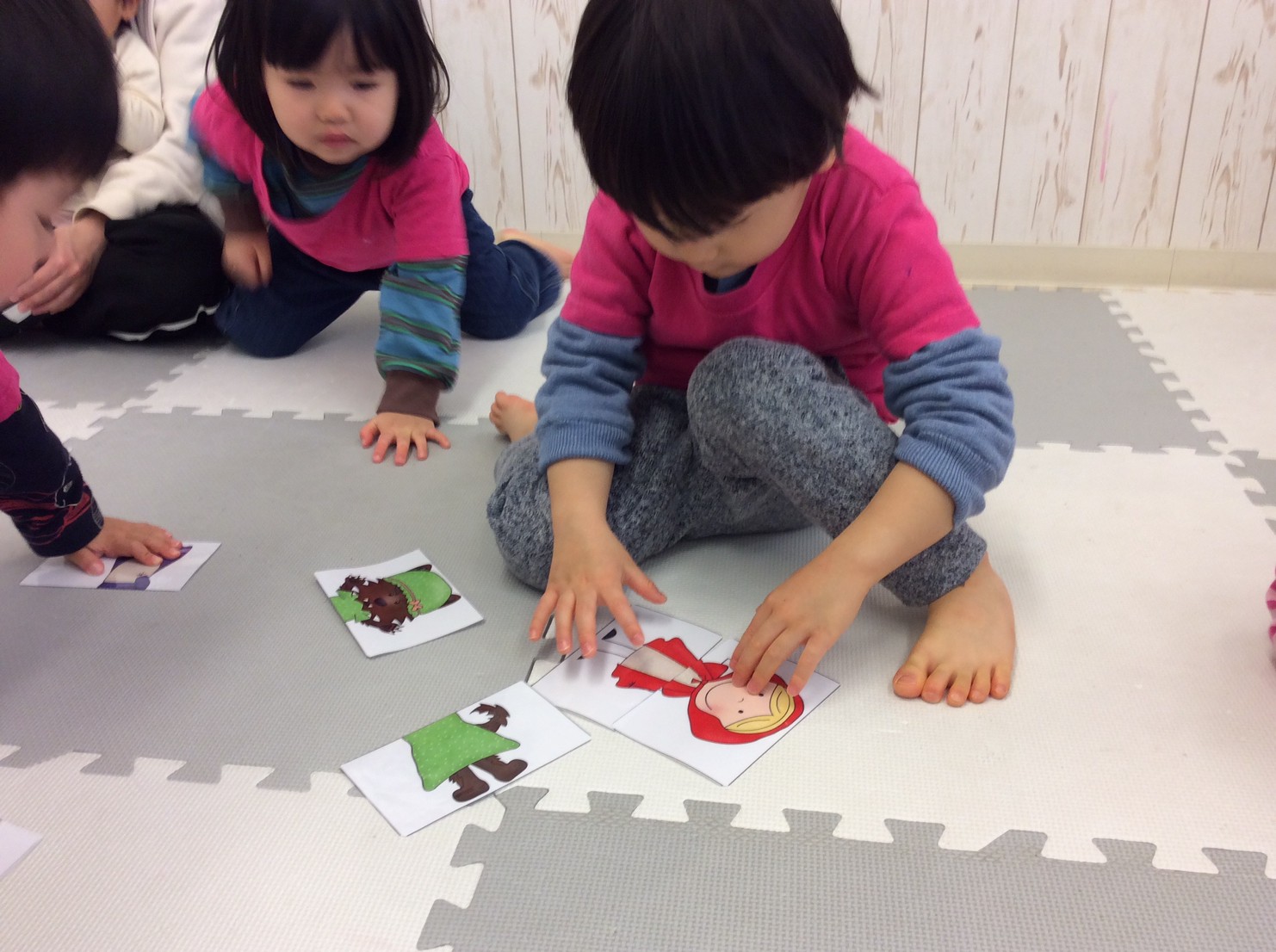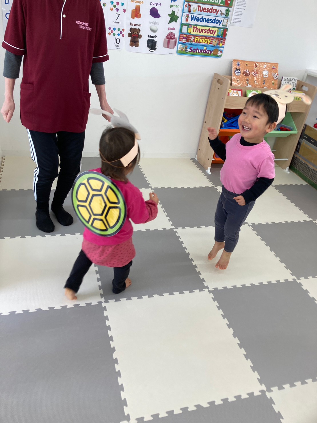 他にはハートに吸盤のボールを当てるHeart shooting game、赤ずきんのパズル、うさぎとカメ競争など、お話しに出てくるキャラクターの真似をして楽しく遊びました。