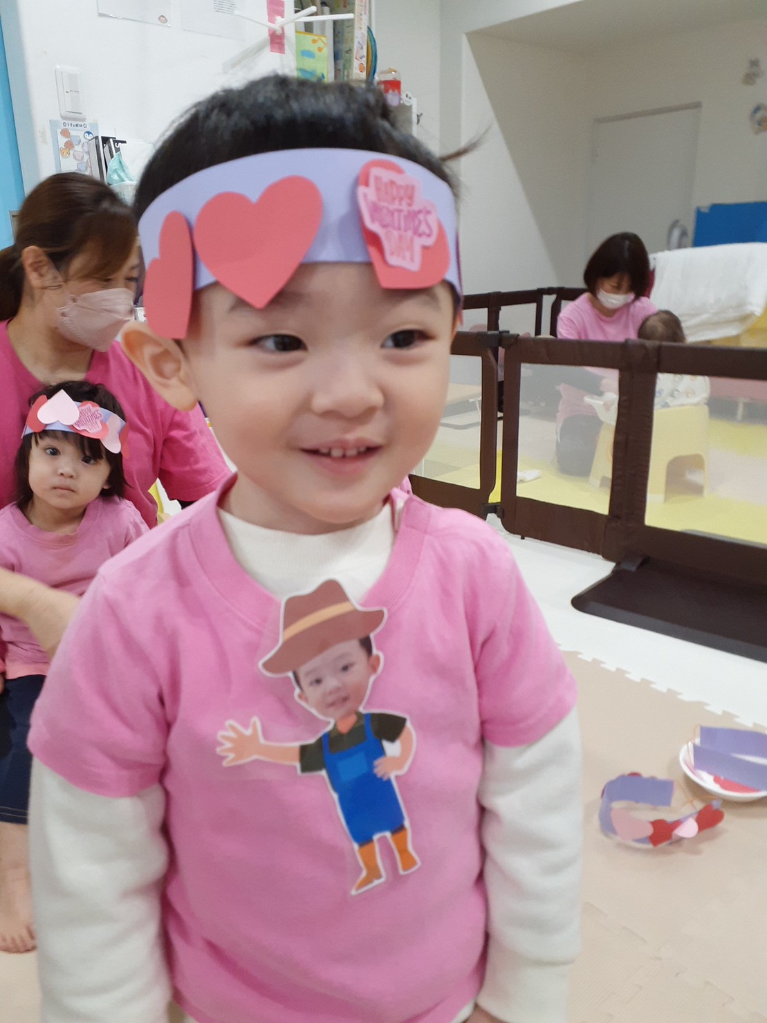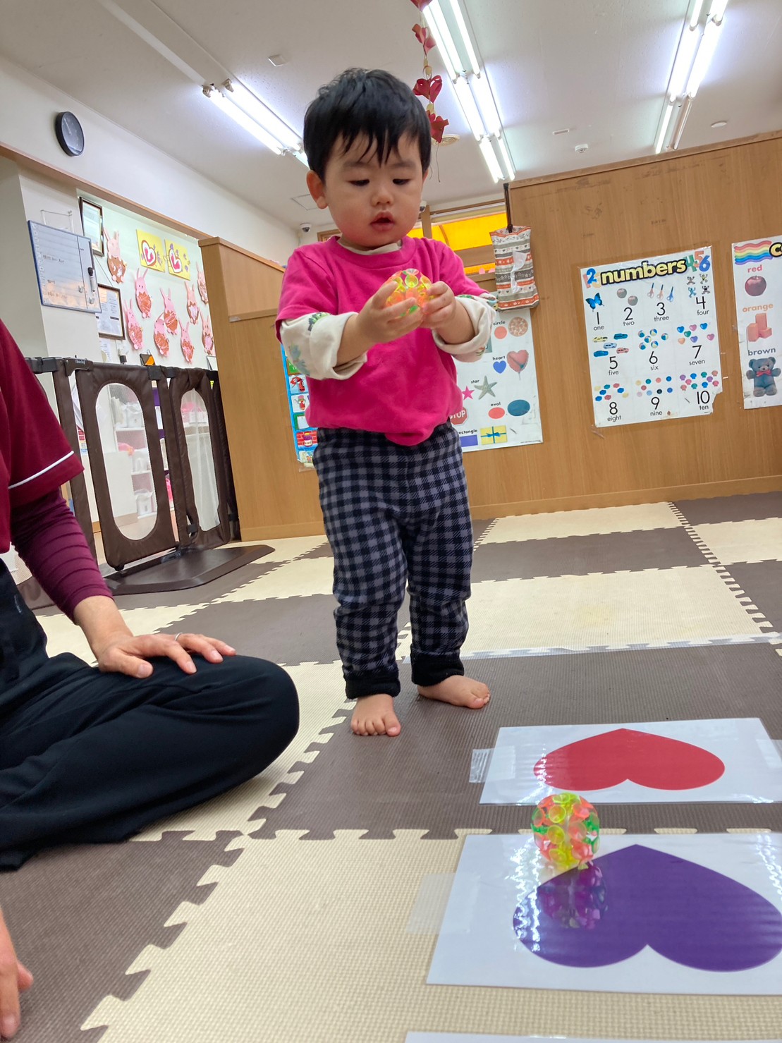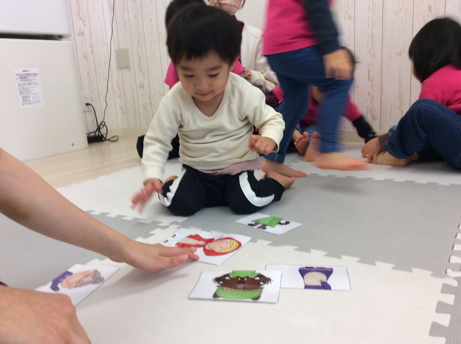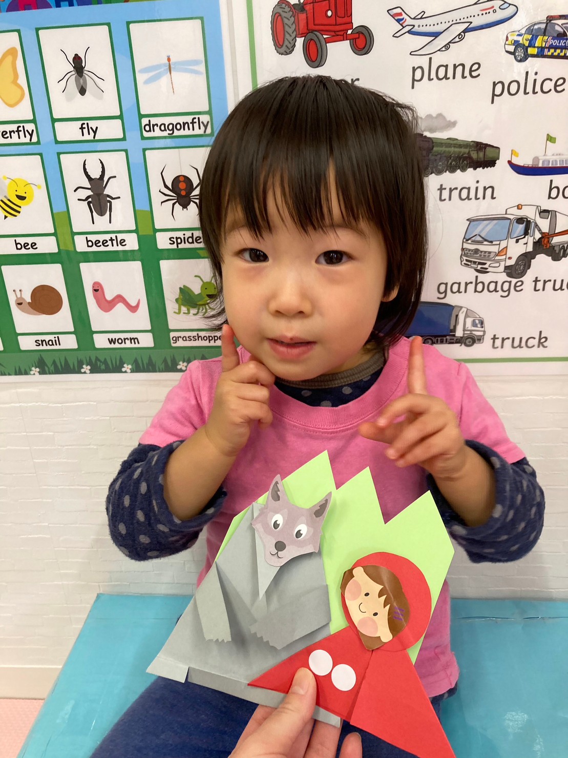 他にはハートに吸盤のボールを当てるHeart shooting game、赤ずきんのパズル、うさぎとカメ競争など、お話しに出てくるキャラクターの真似をして楽しく遊びました。
