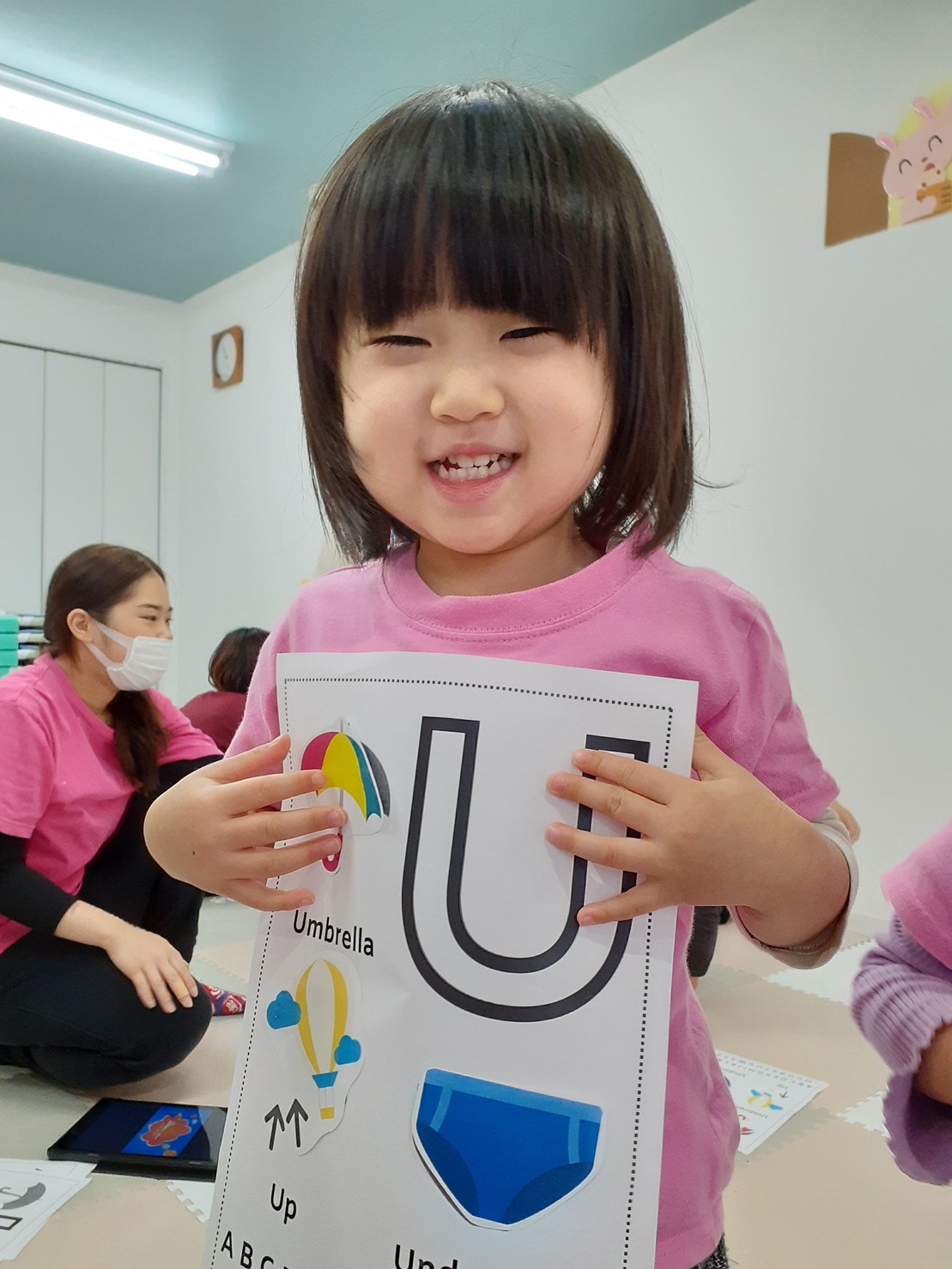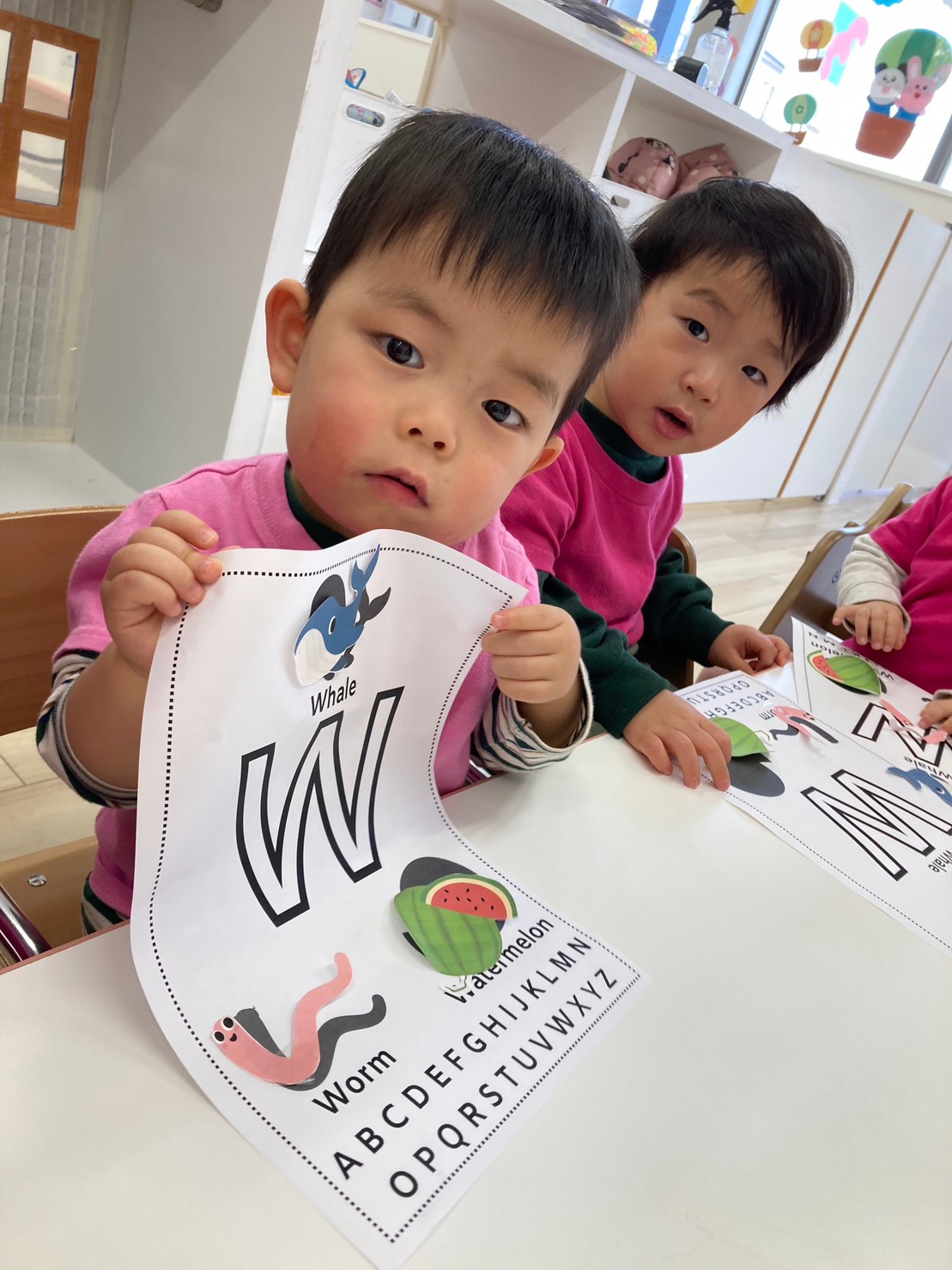 UとVとWで始まる言葉は少し難しい言葉が多かったですが、ワークの絵を見ながら最初の文字の音に親しんでくれました。