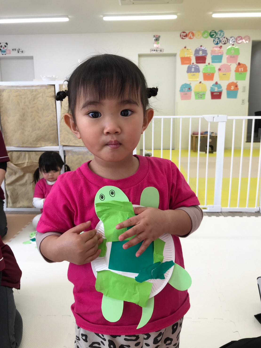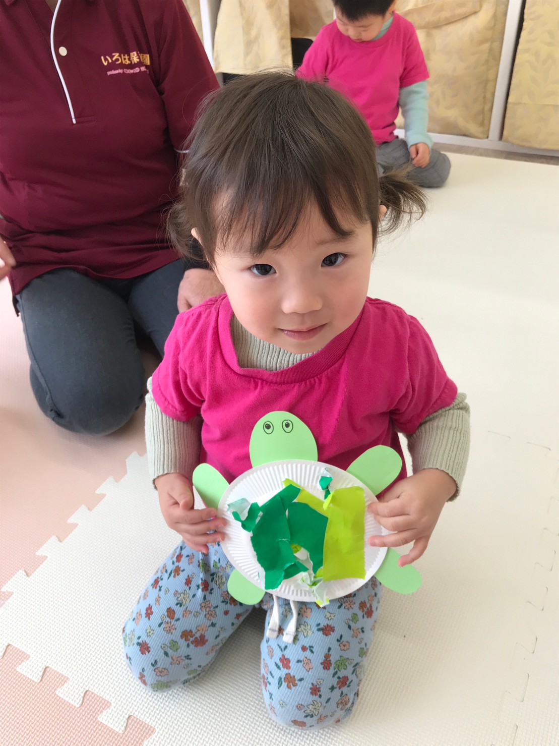Paper plate Tortoise 紙皿に緑の色紙をちぎって貼り、カメを作りました。