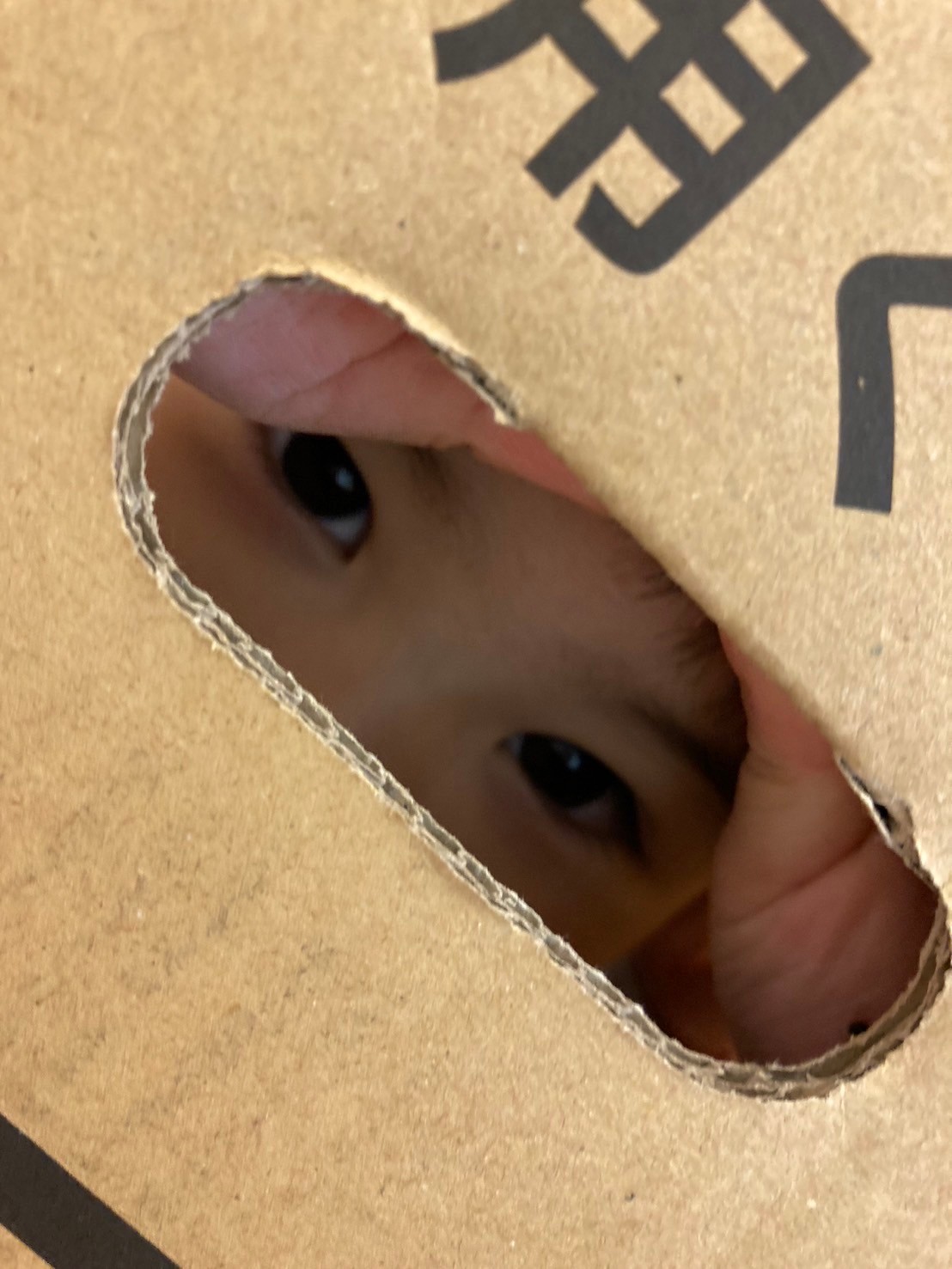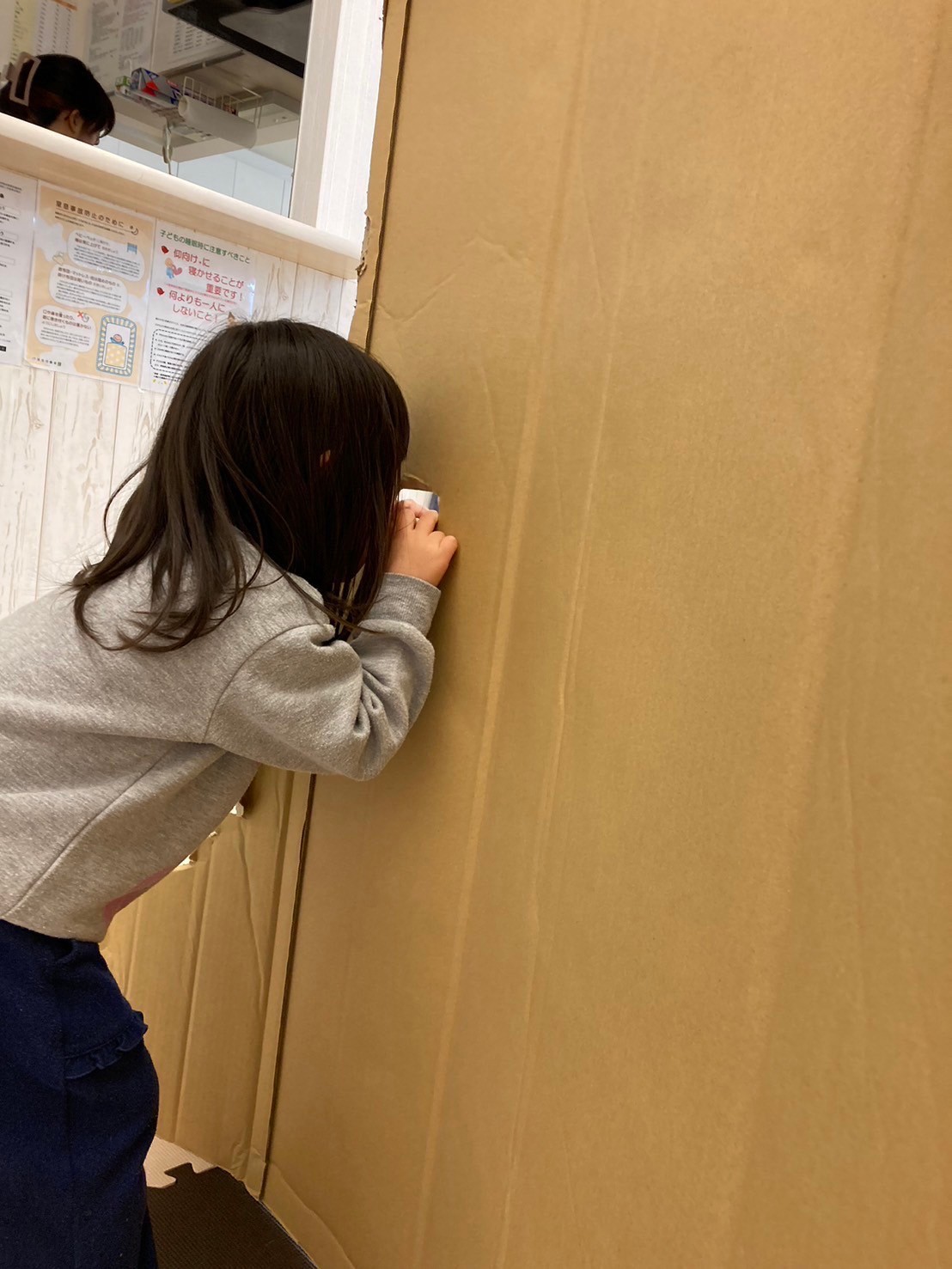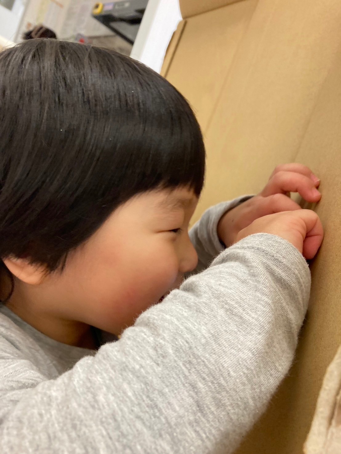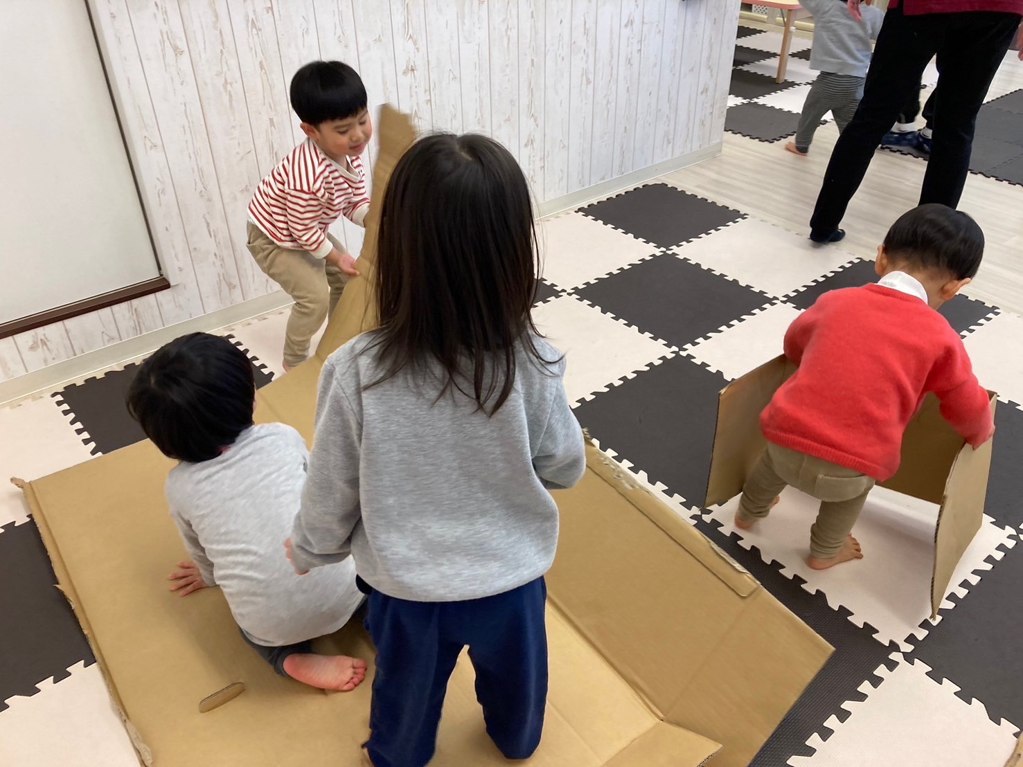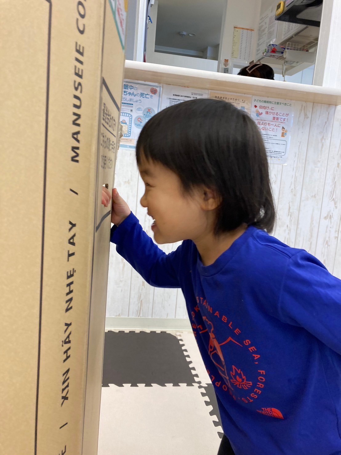 この日は、大きな段ボールを使ってかくれんぼ遊びをしました。