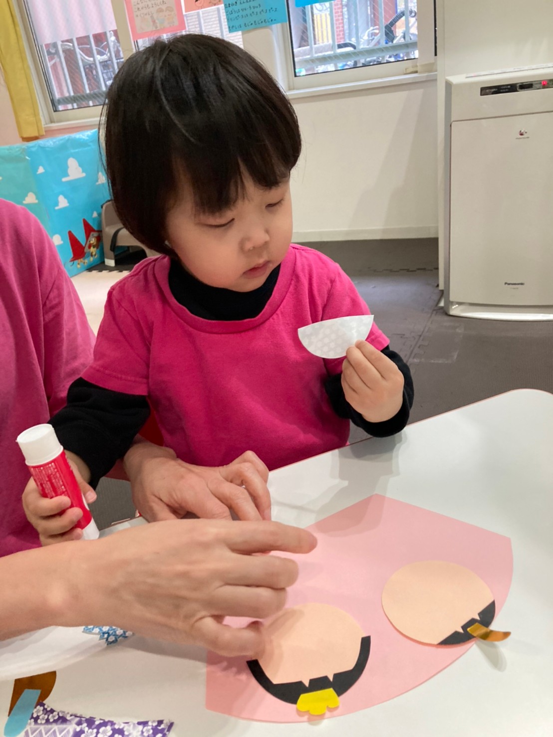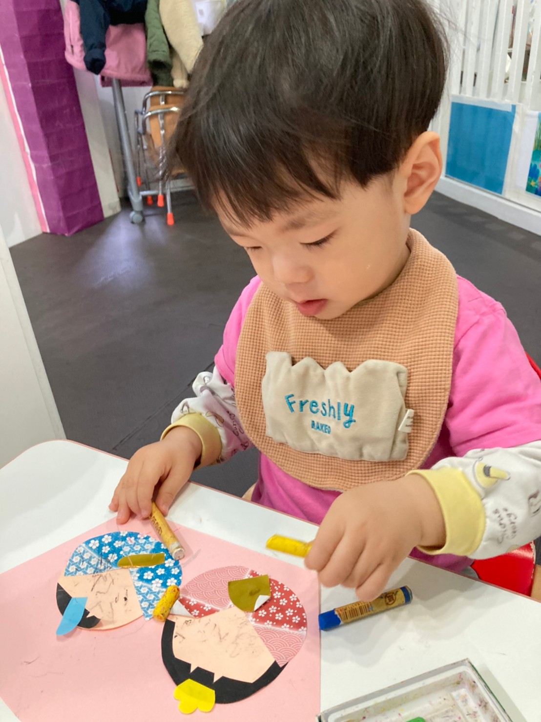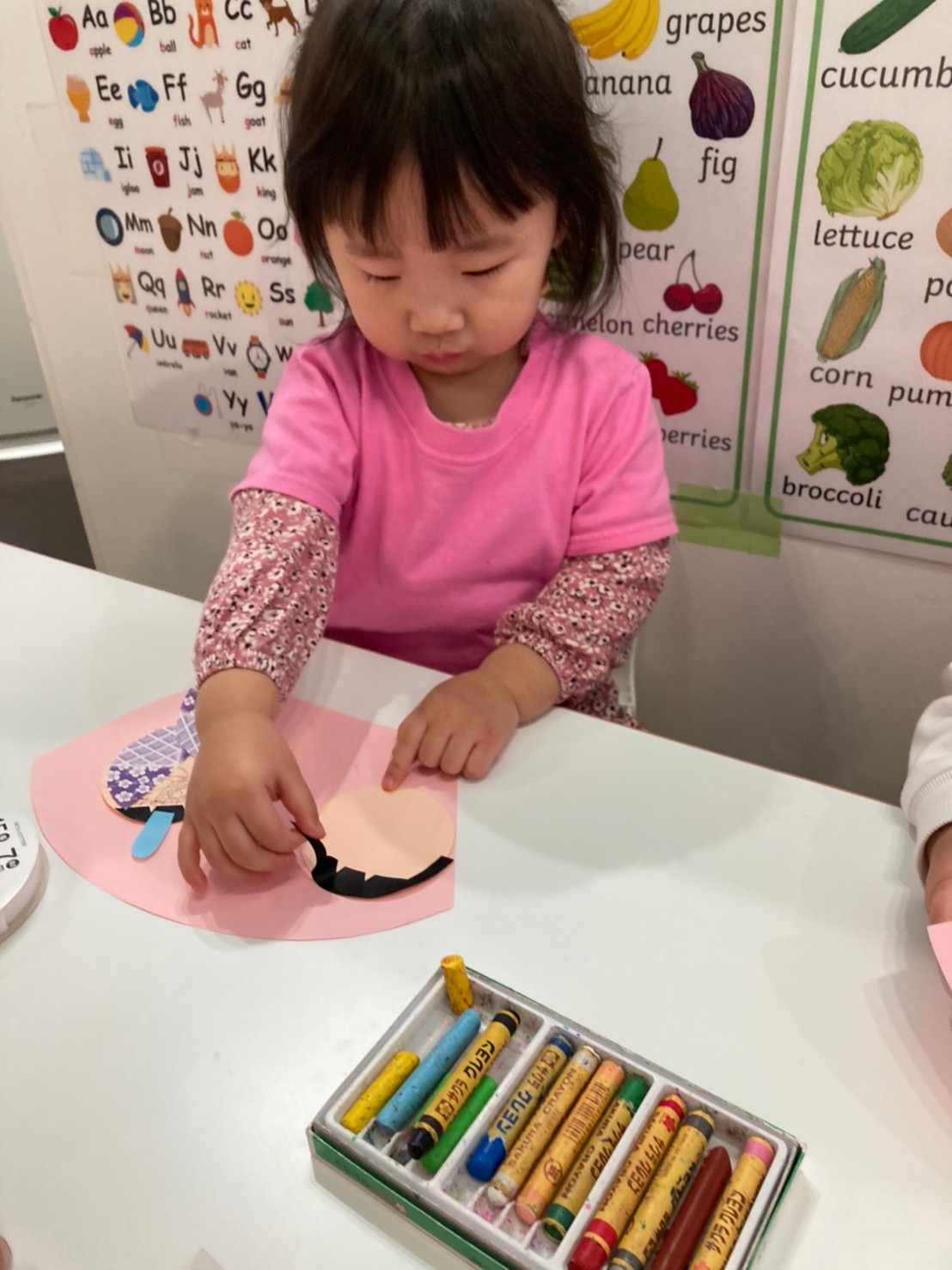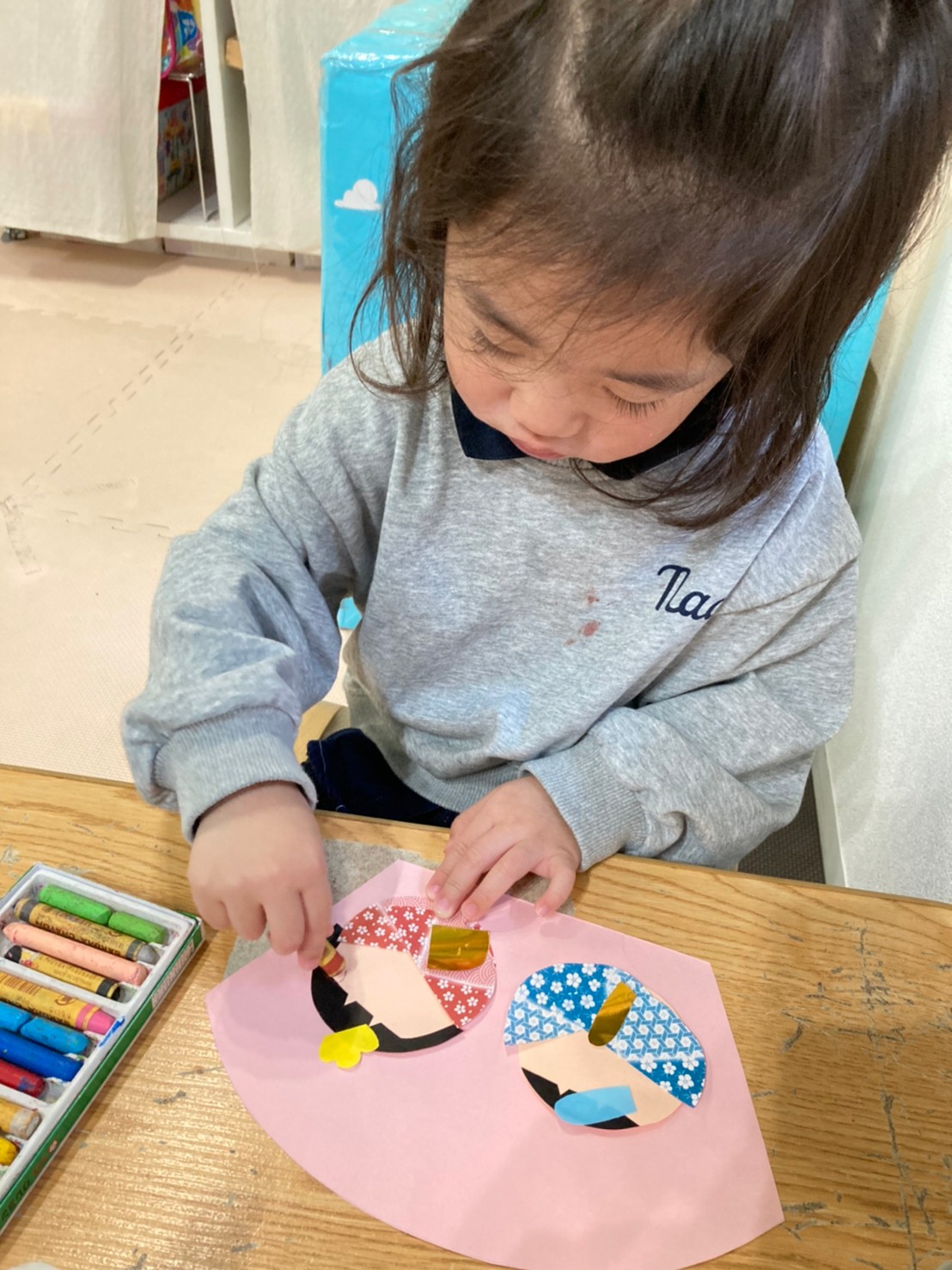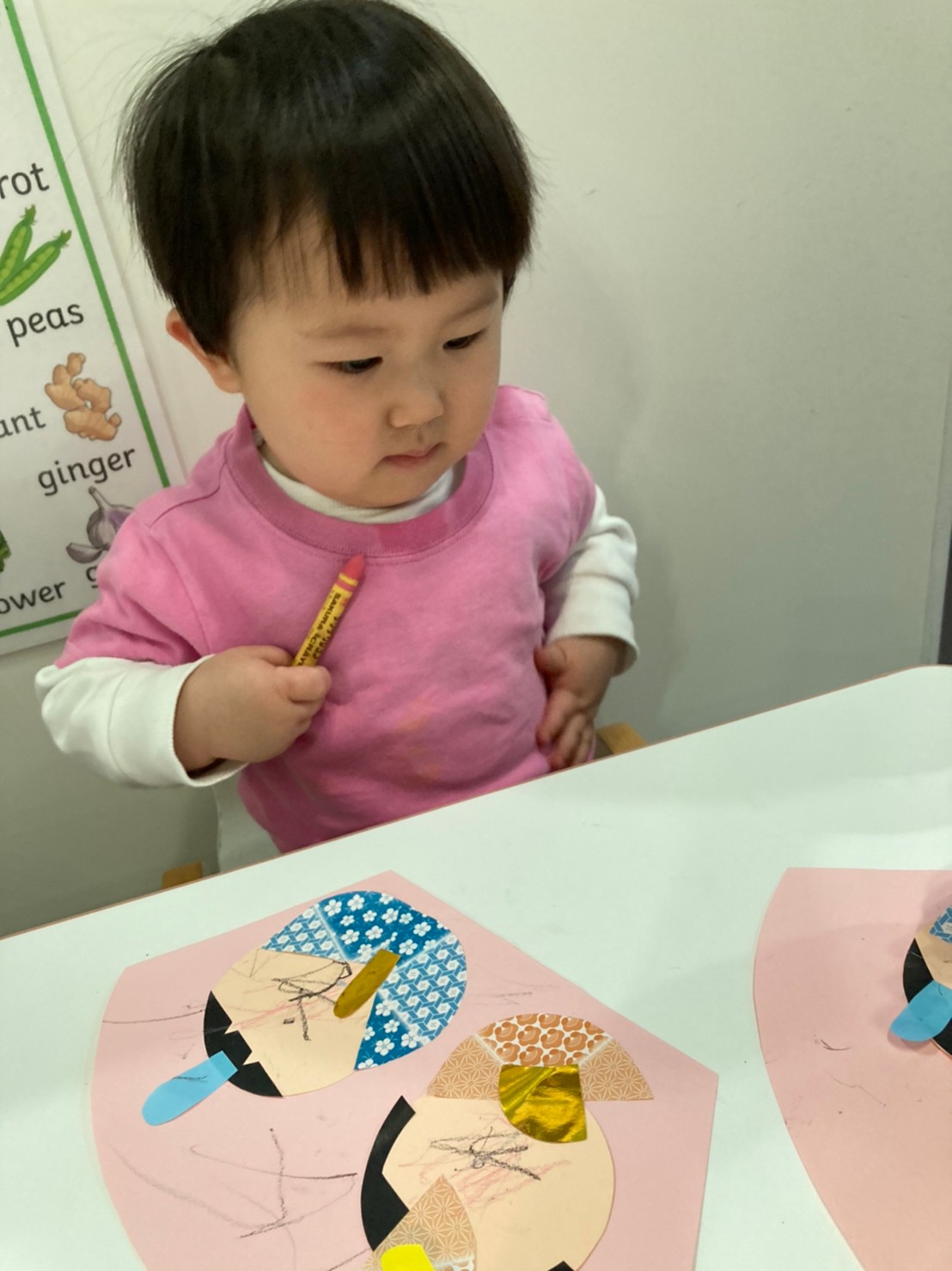 クレパスで自由に顔を書いたりして楽しんで取り組んでくれていましたよ。