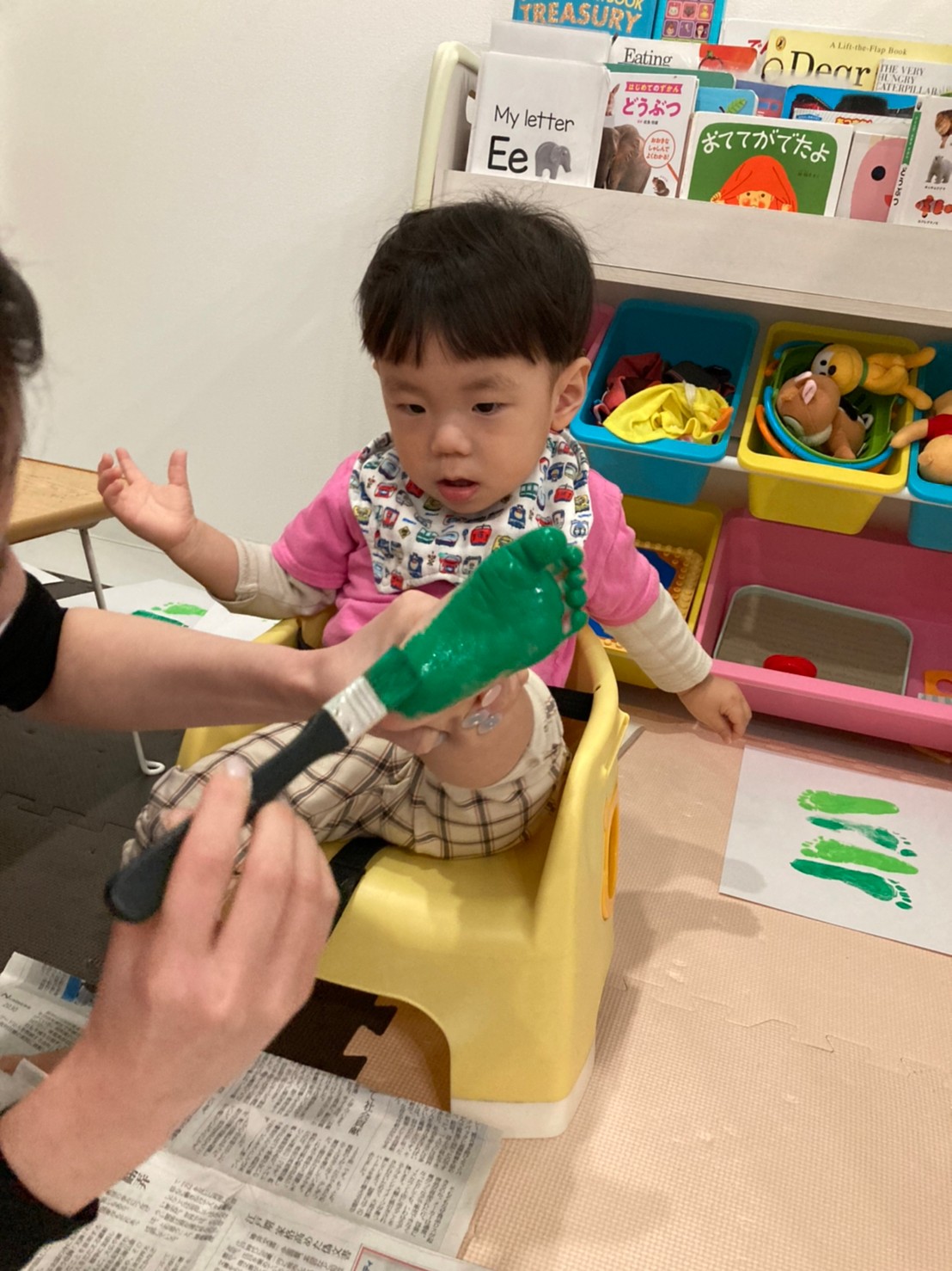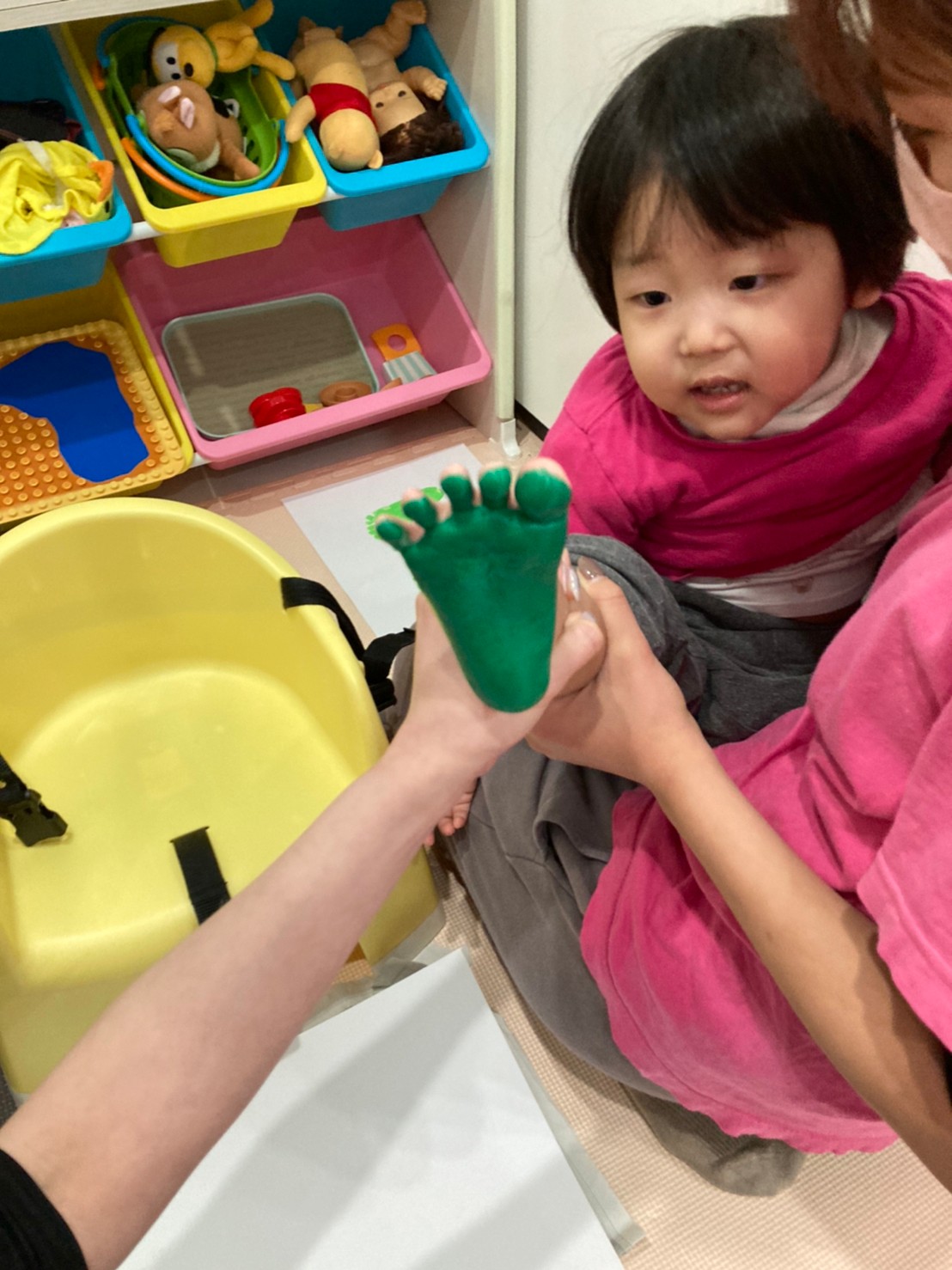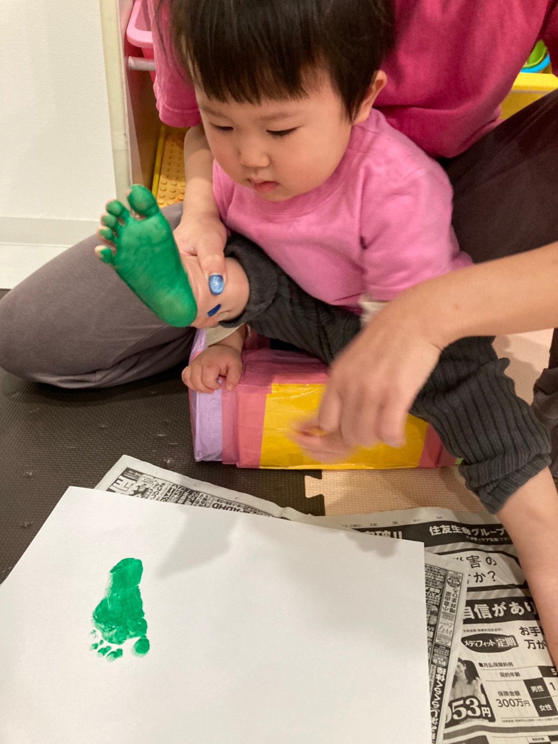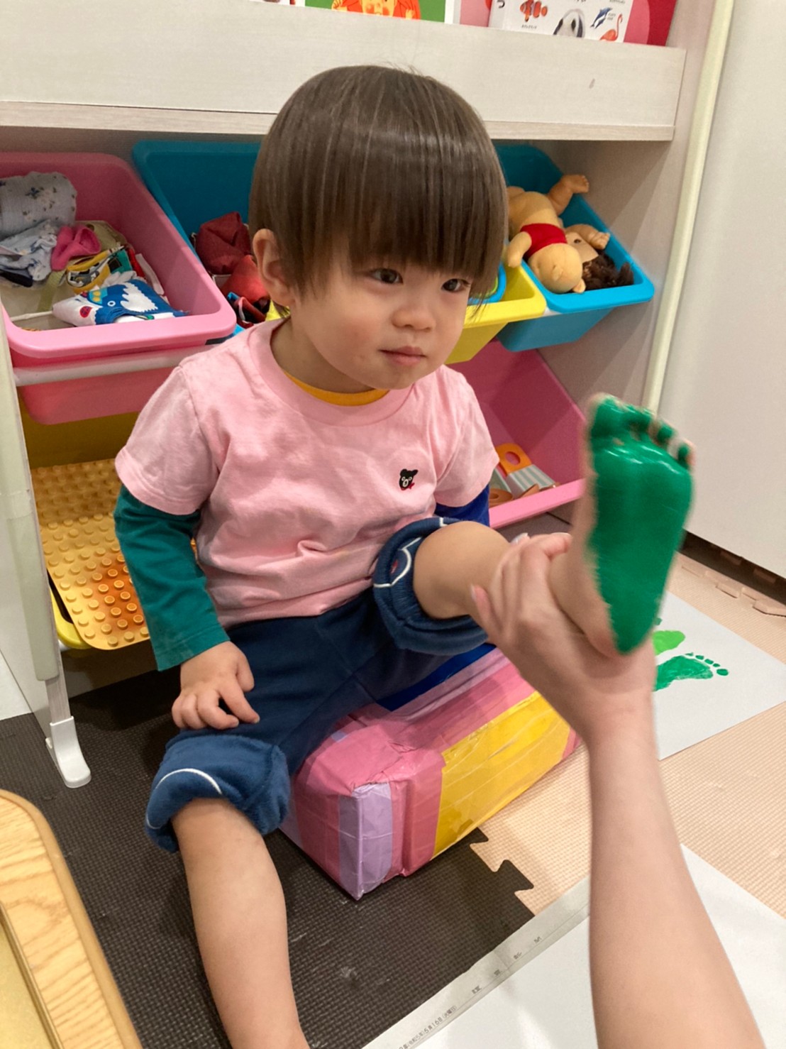 製作では、足形や手形ペッタンをしたり絵の具、スタンプに触れるのを楽しみました♡