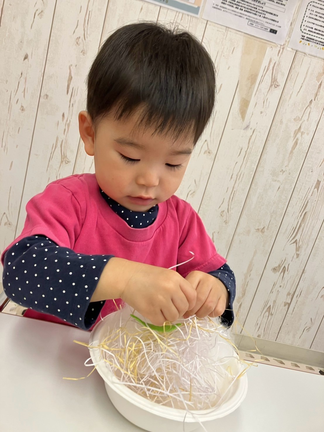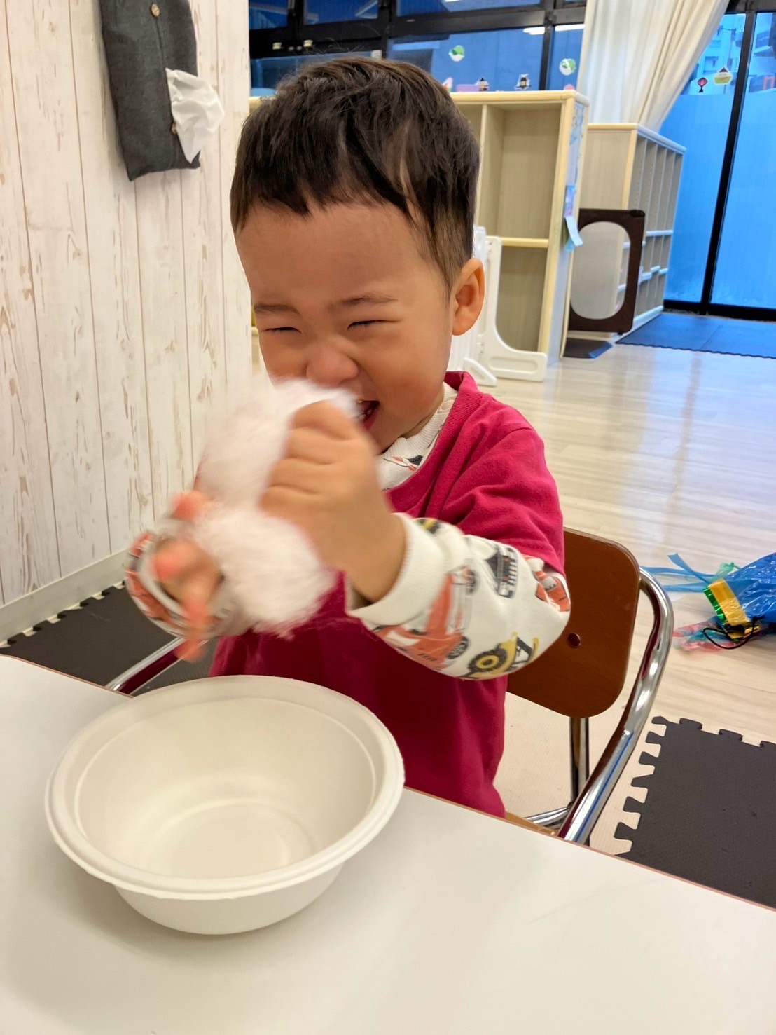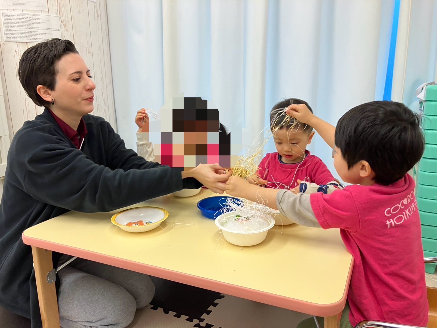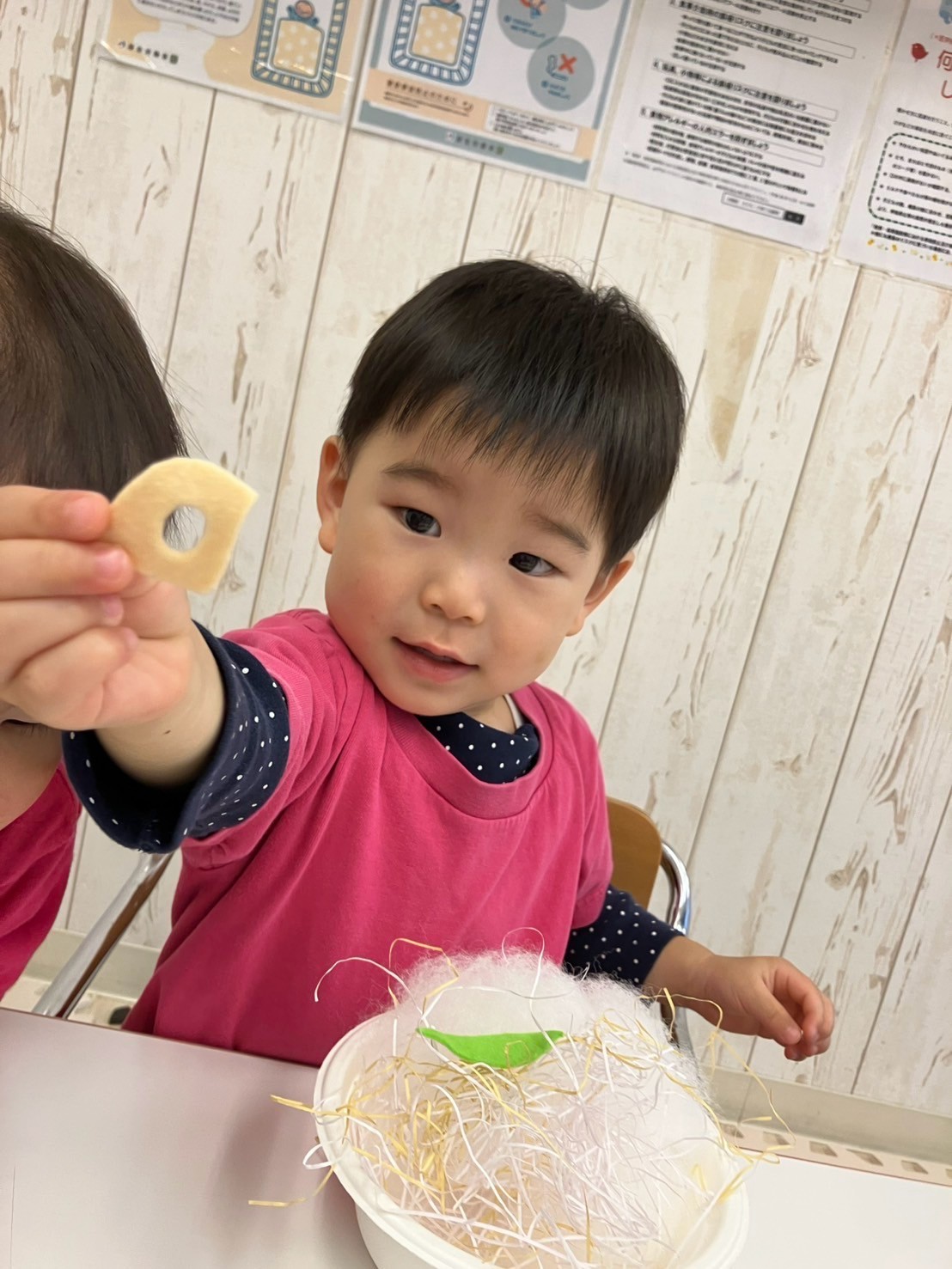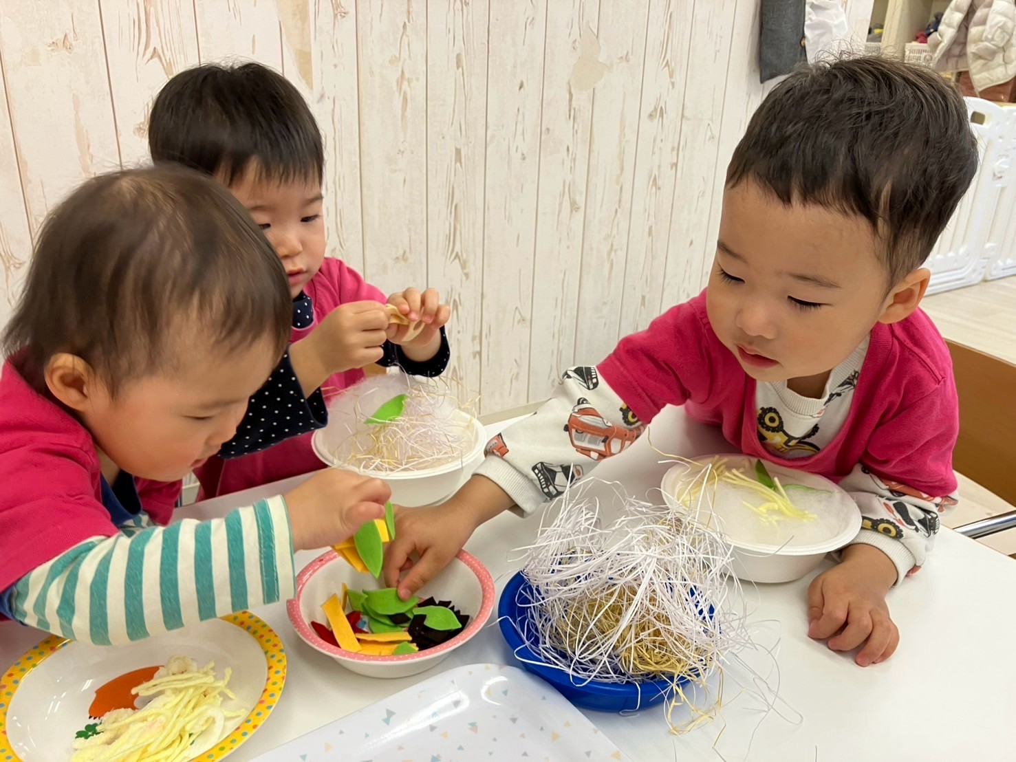穴のあいた蓮根や錦糸卵等、あらゆる具材に興味を持ち、「おいしそうだね〜」「おうちにもってかえりた〜い!」とお友だちと話し、盛り付けを楽しんでいましたよ。